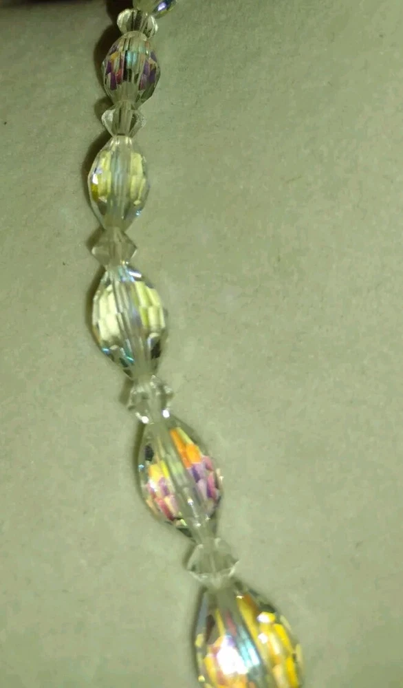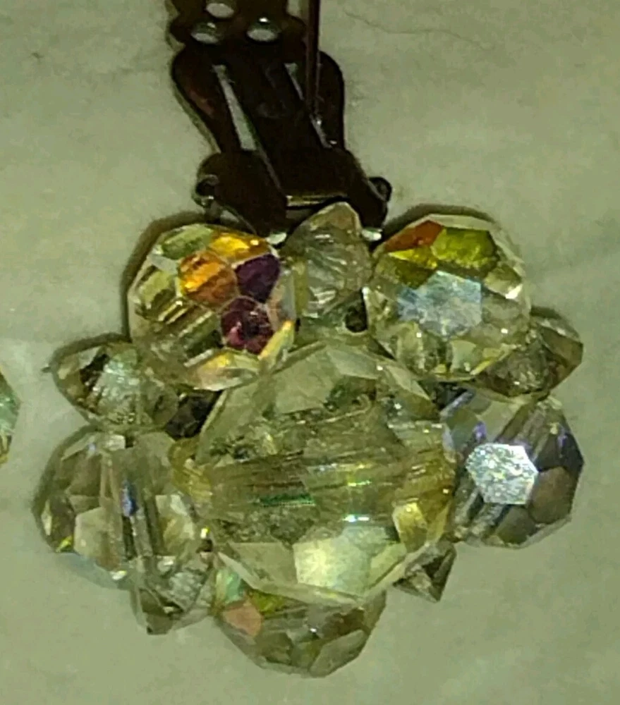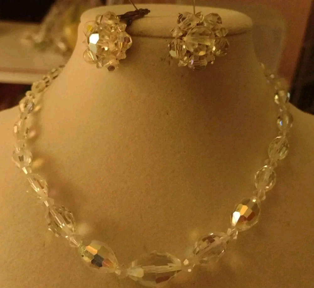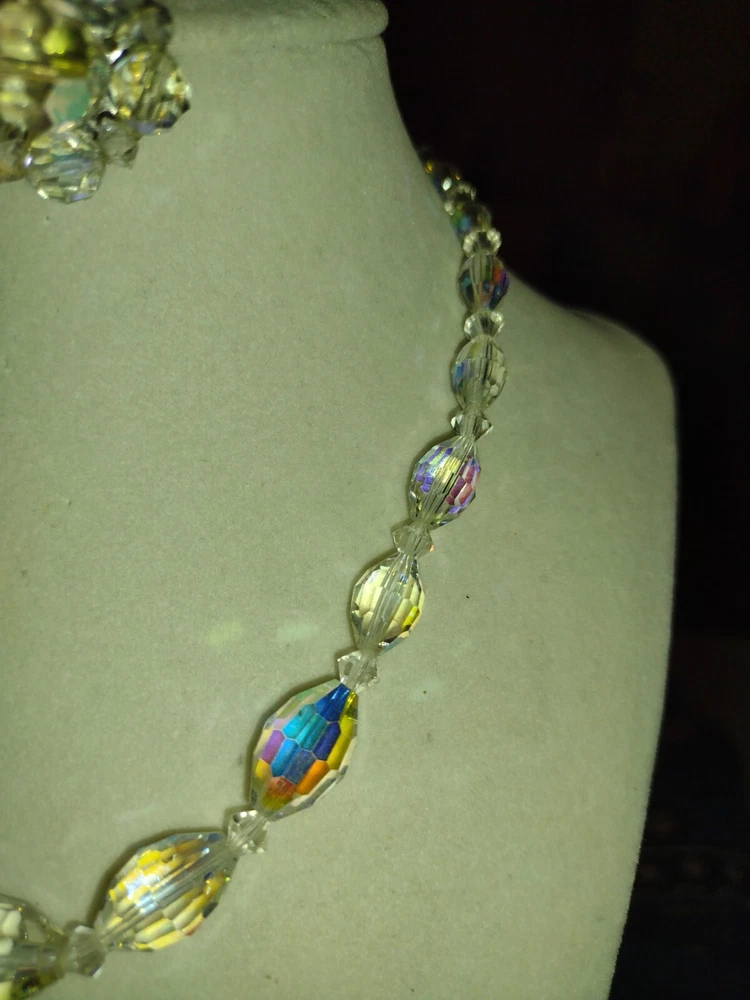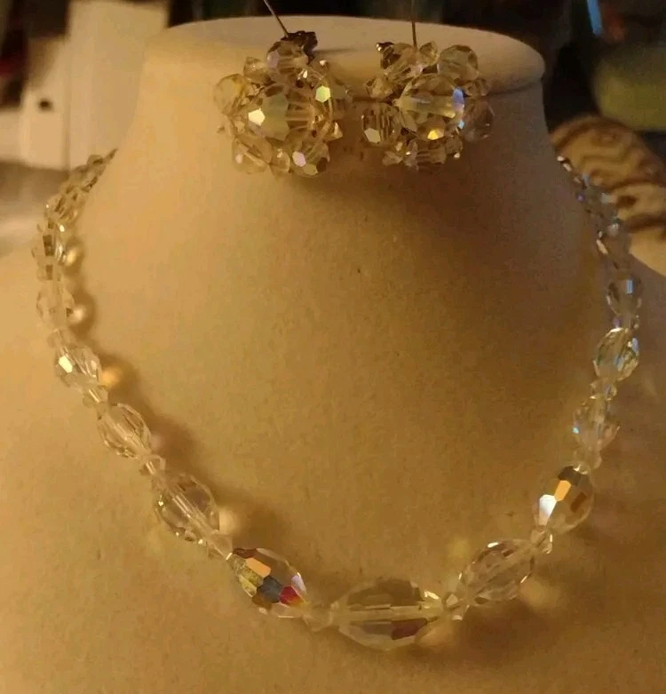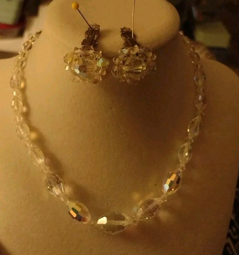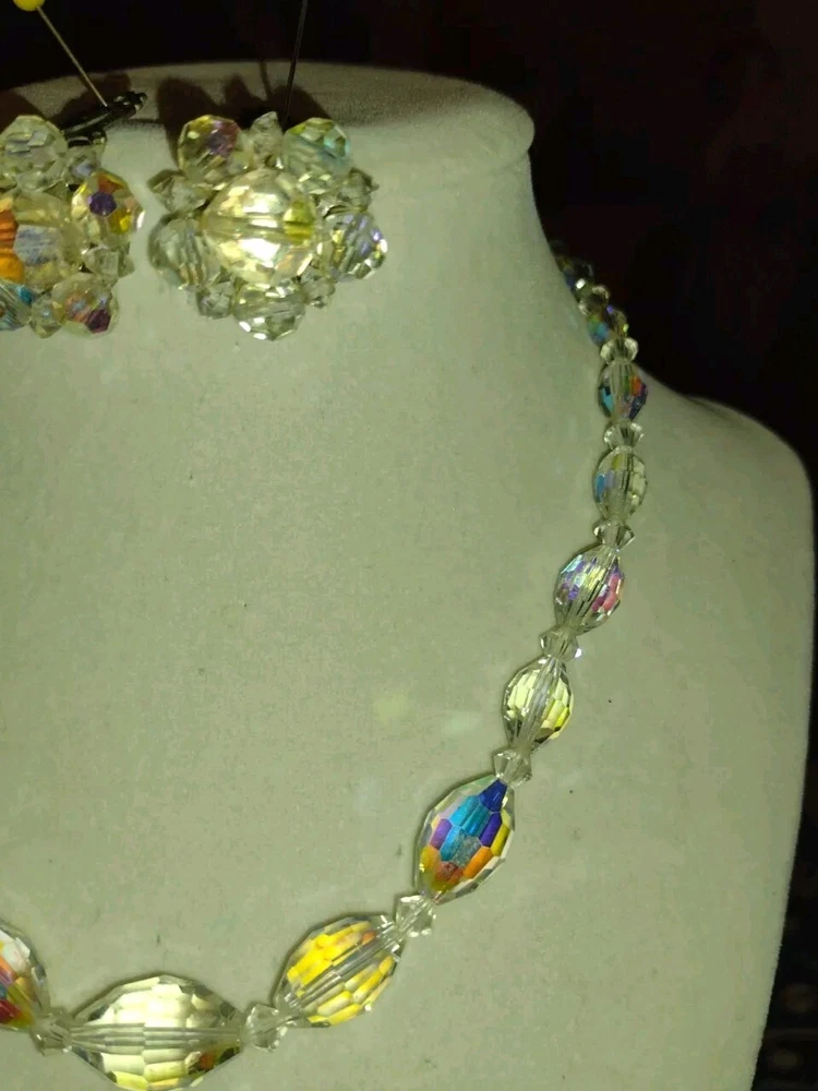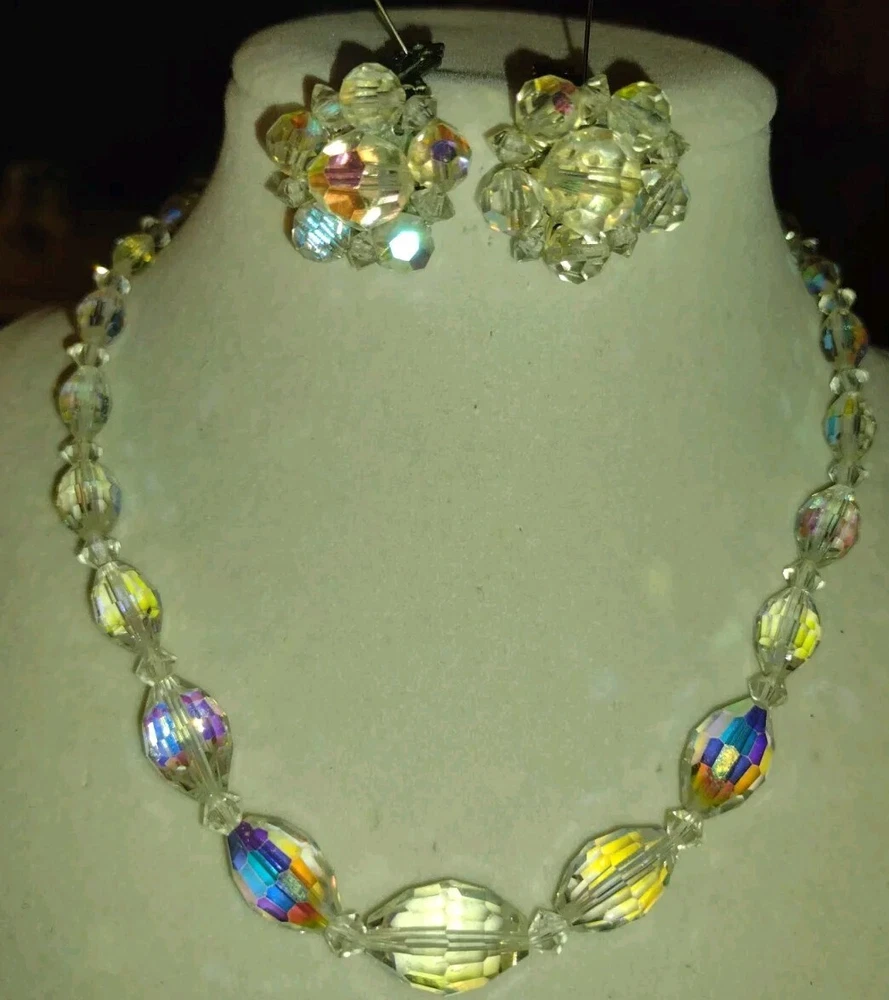 Vintage Aurora Borealis Crystal Necklace & Clip Earring Set 17" 1". Condition is Pre-owned. Shipped with USPS Ground Advantage.