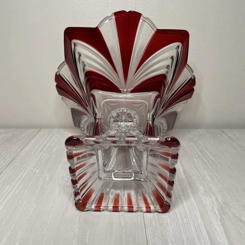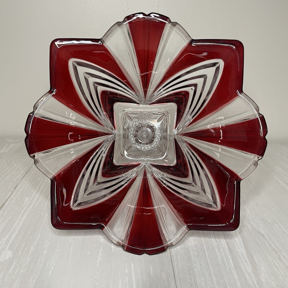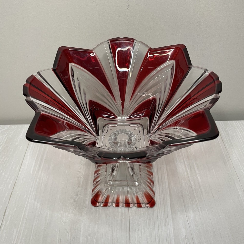 Elevate your serving collection with the vintage Fifth Avenue Crystal Aurora Ruby Pedestal Compote. This exquisite piece, crafted in the 1960s, features a stunning square shape and a vibrant red color that will captivate your guests. The bowl's diameter of 8 inches and height of 8 inches make it an ideal choice for a variety of dishes, while its crystal material ensures durability and a timeless elegance. The compote comes from a time period manufactured between 1960-1969 and was made in Japan, adding an international touch to its design. Despite its rarity, it remains an original piece that carries the brand's legacy. Whether for special occasions or everyday use, this serving bowl will serve as a striking centerpiece to your dining experience.