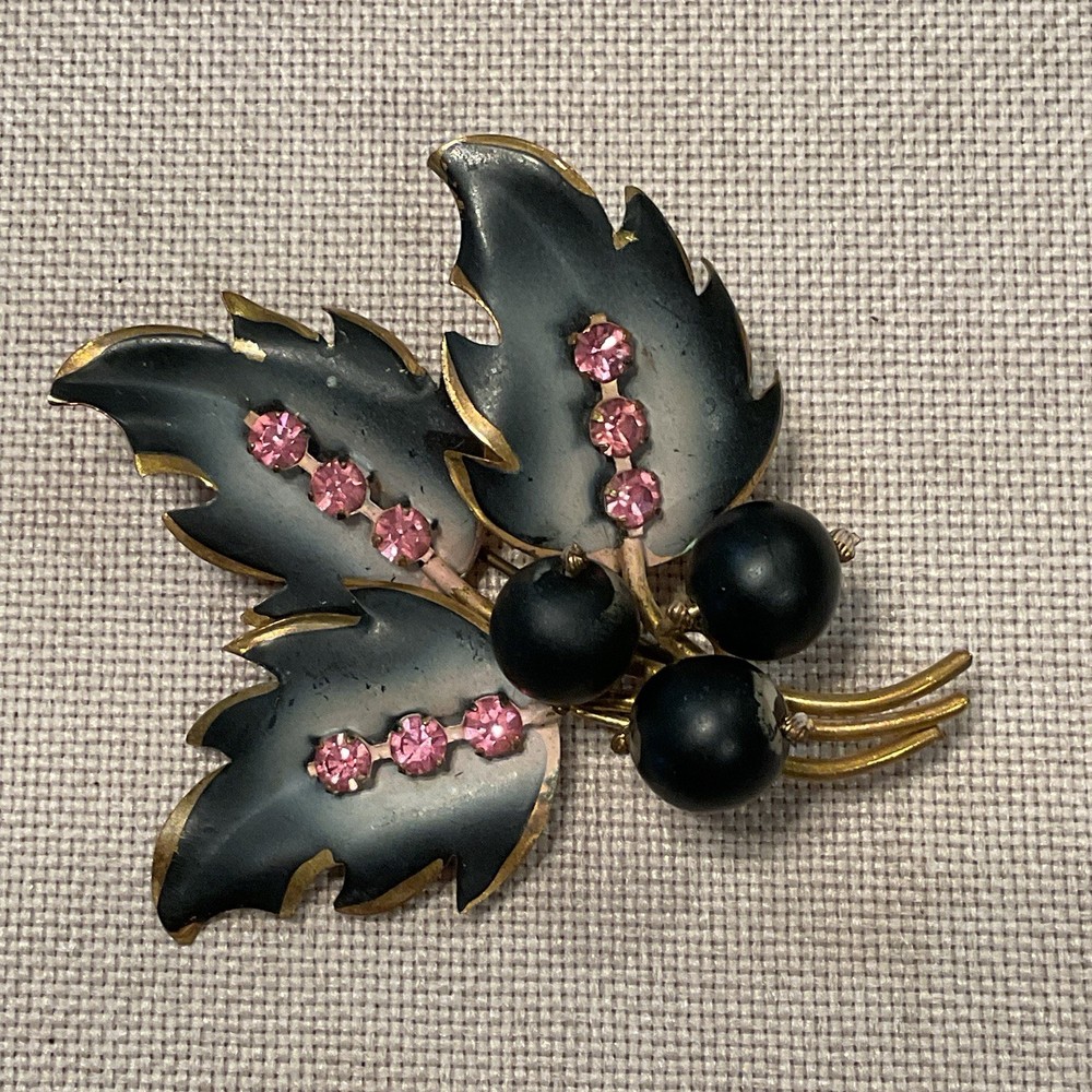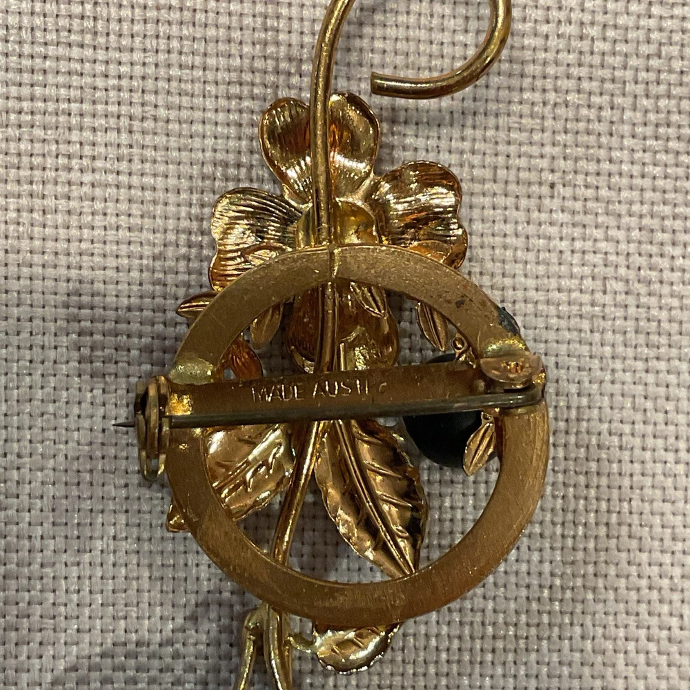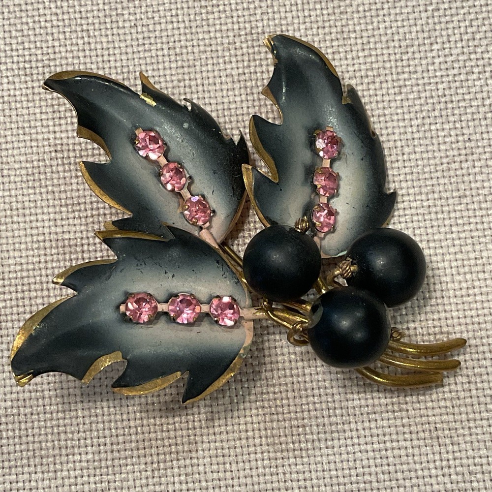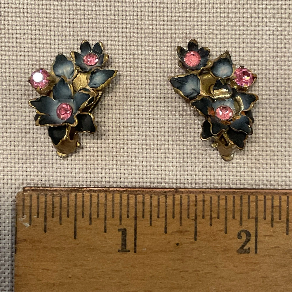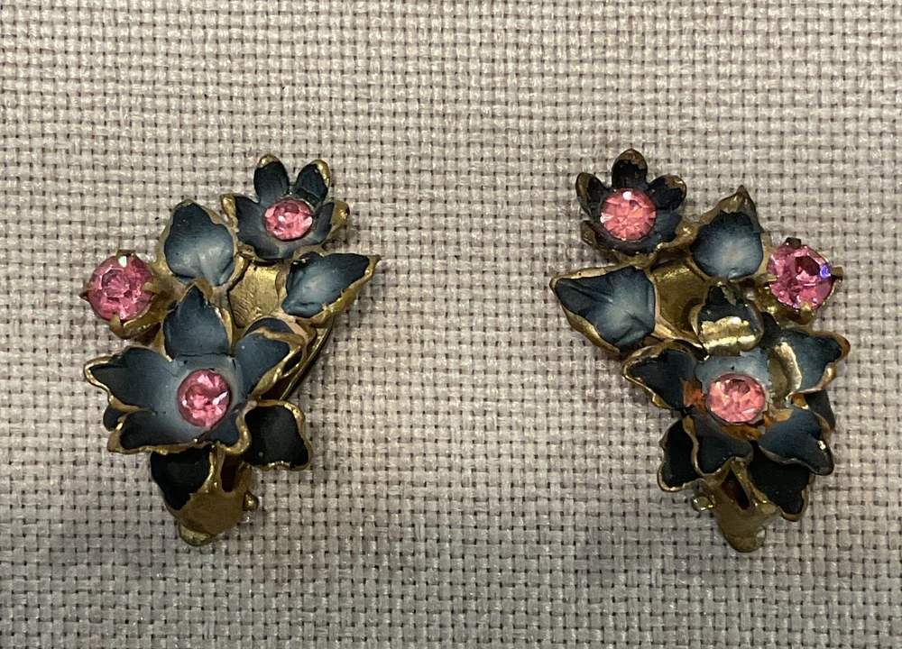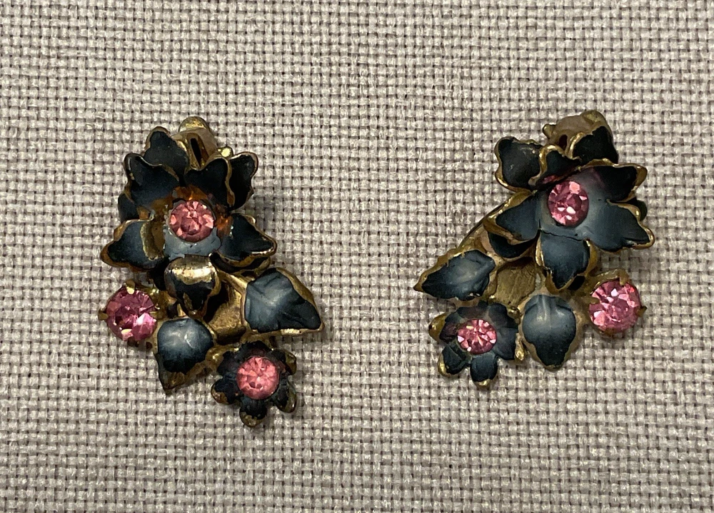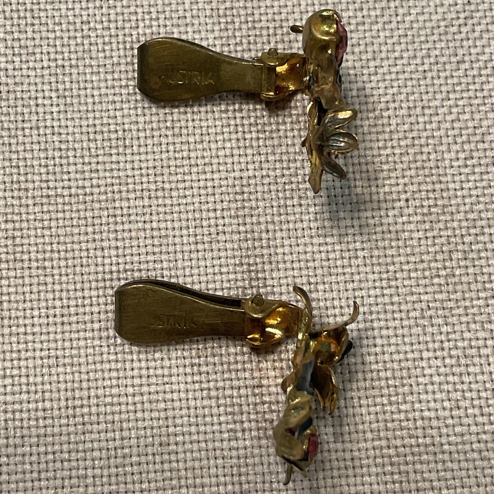 We have for sale a set of 2 vintage brooch/ pins with 1 set of matching clip earrings in nice preowned condition. All are signed Austria. The largest brooch has prong set pink rhinestones and measures approximately 2.25" x 2.5" at is widest points. There is what looks like a little bit of wear to the finish of that pin or perhaps that is how the finish is supposed to be (see pics). The other brooch also has prong set pink rhinestones and measures approximately 2.5" x 1". The sweet little matching clip earrings measure approximately 1" x .5" . We have not attempted to clean these pieces. These are from my mother Dorothy's (a Rosie the Riveter in WWII) collection. She was a fun, strong, and vibrant lady who had an eye for unique and beautiful items. Our hope is that these items find their way to people who will appreciate them as much as she did. Please look at all pictures and ask questions before purchase. Thank you!