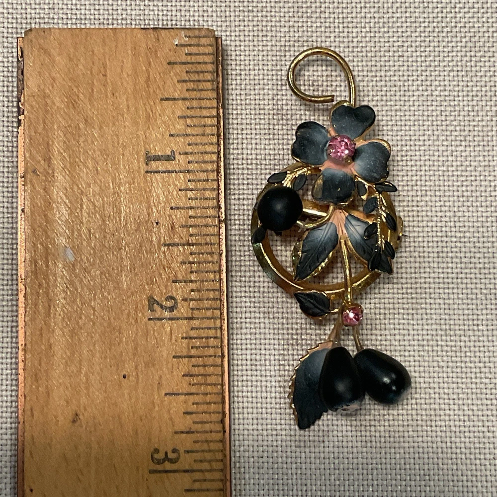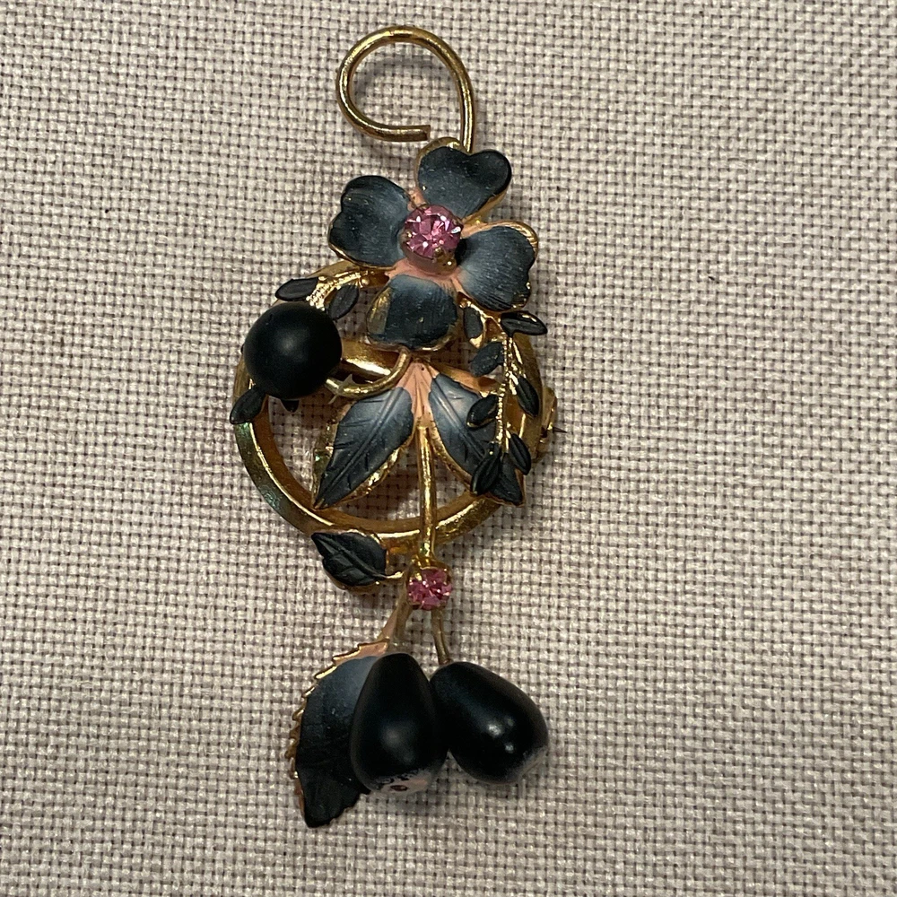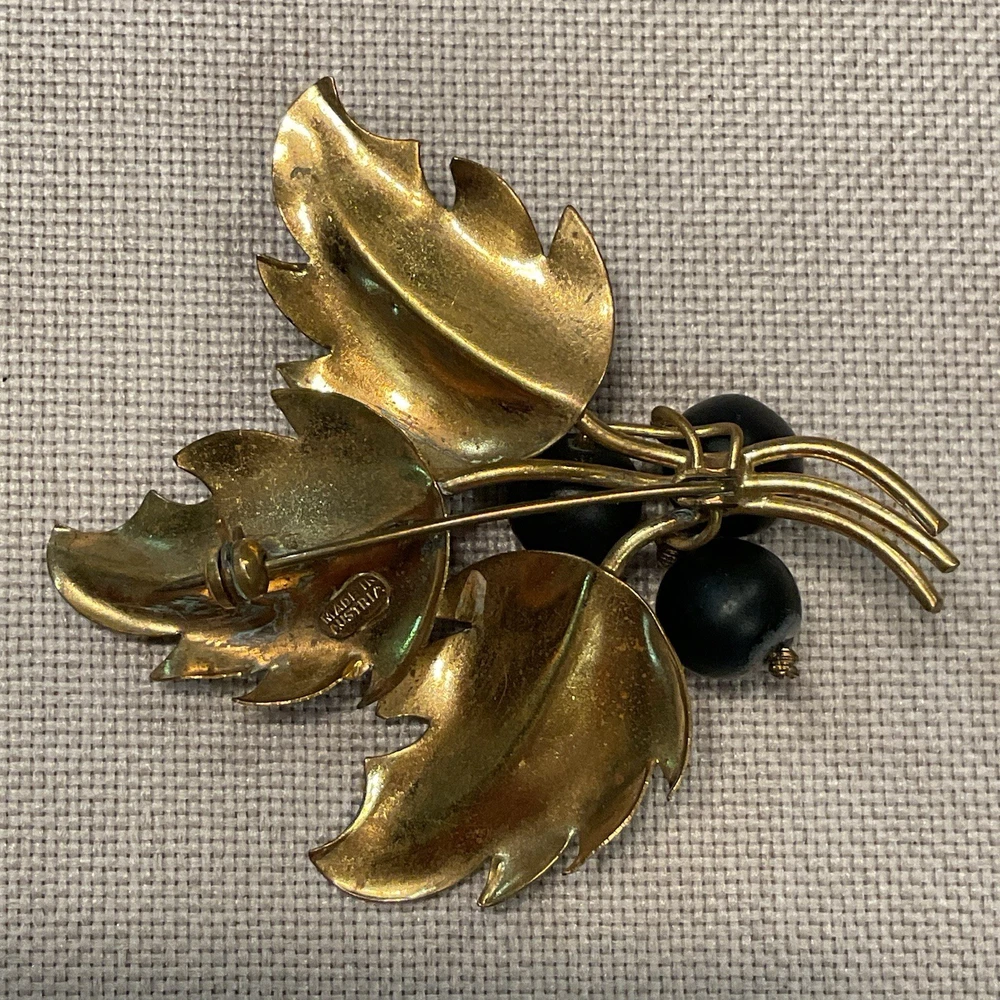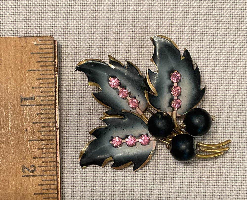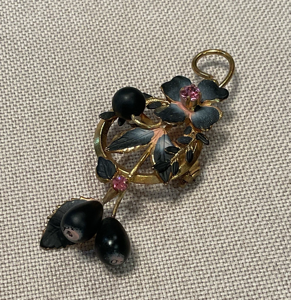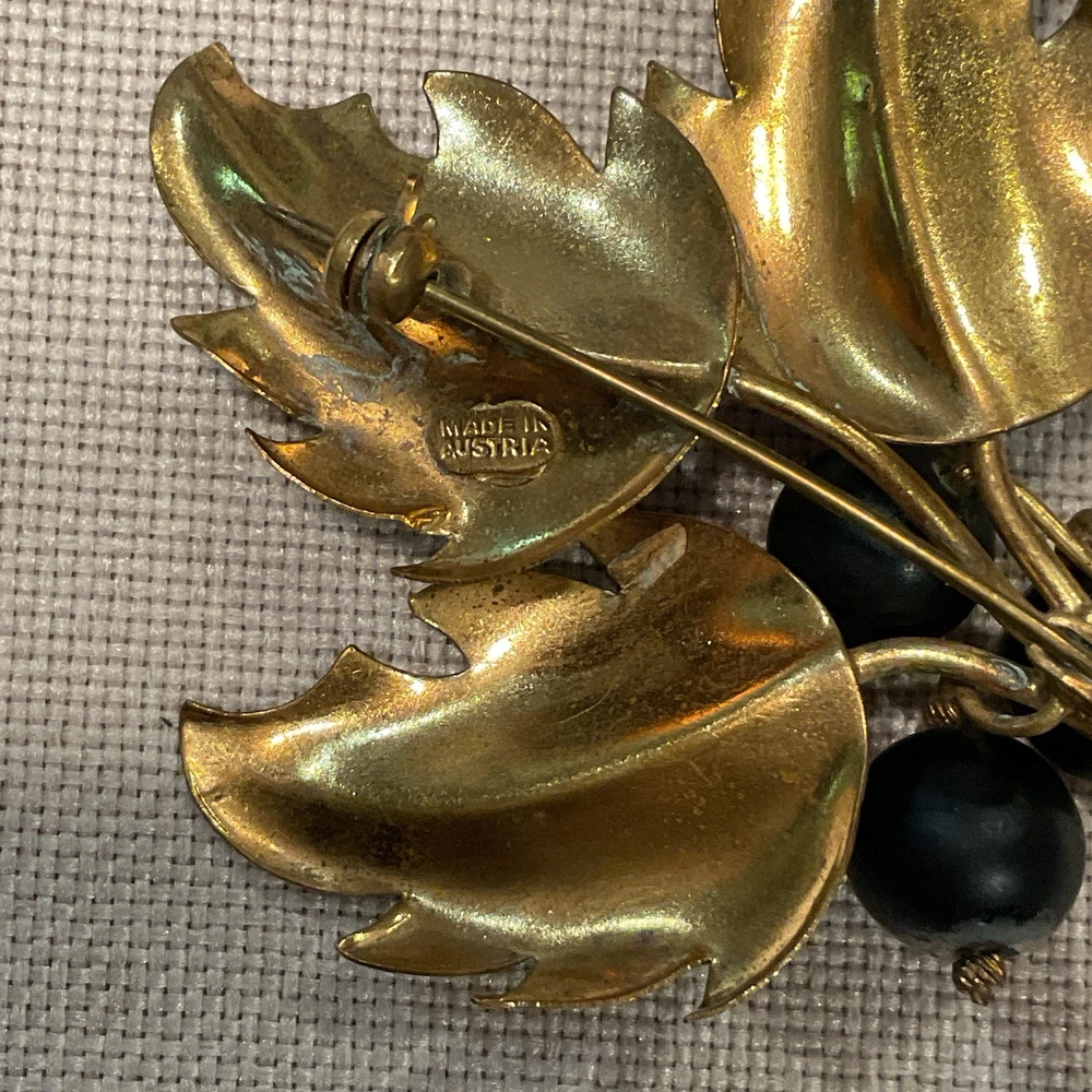 We have for sale a set of 2 vintage brooch/ pins with 1 set of matching clip earrings in nice preowned condition. All are signed Austria. The largest brooch has prong set pink rhinestones and measures approximately 2.25" x 2.5" at is widest points. There is what looks like a little bit of wear to the finish of that pin or perhaps that is how the finish is supposed to be (see pics). The other brooch also has prong set pink rhinestones and measures approximately 2.5" x 1". The sweet little matching clip earrings measure approximately 1" x .5" . We have not attempted to clean these pieces. These are from my mother Dorothy's (a Rosie the Riveter in WWII) collection. She was a fun, strong, and vibrant lady who had an eye for unique and beautiful items. Our hope is that these items find their way to people who will appreciate them as much as she did. Please look at all pictures and ask questions before purchase. Thank you!