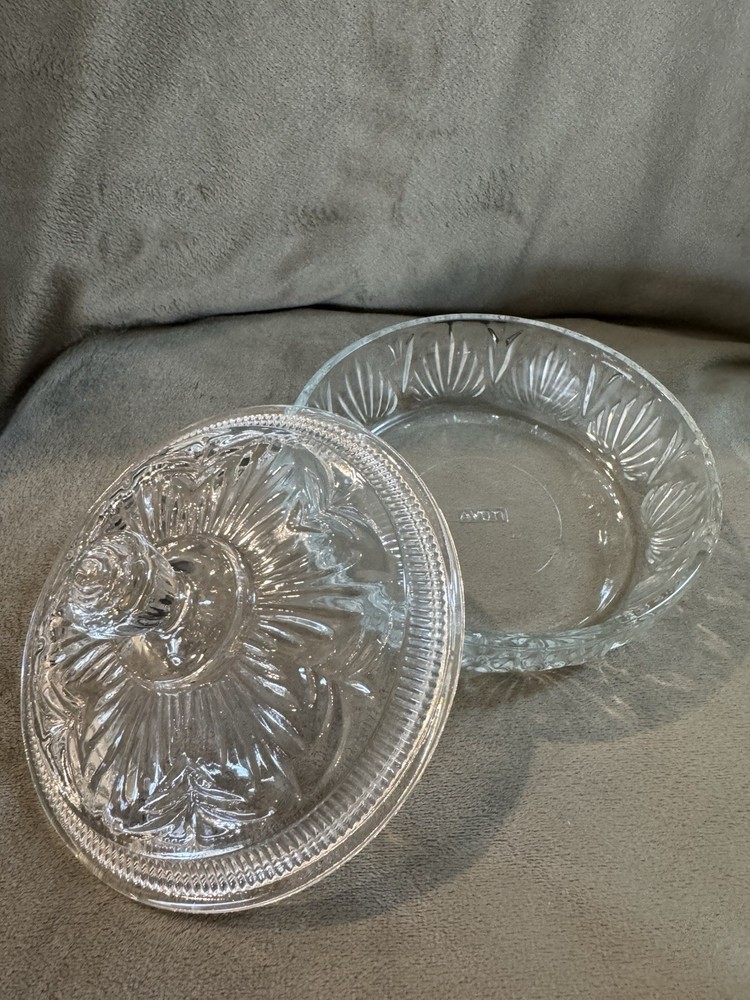 This vintage Avon clear cut glass round candy trinket dish with lid exudes a classic Grannycore vibe. Crafted in the United States with primary material glass, this American style dish is an original piece from the Avon brand. The clear color of the glass makes it versatile to fit any decor. The dish is perfect for storing candies, small trinkets, or even used as a centerpiece. The age of the dish is unknown, adding to its charm and mystery.