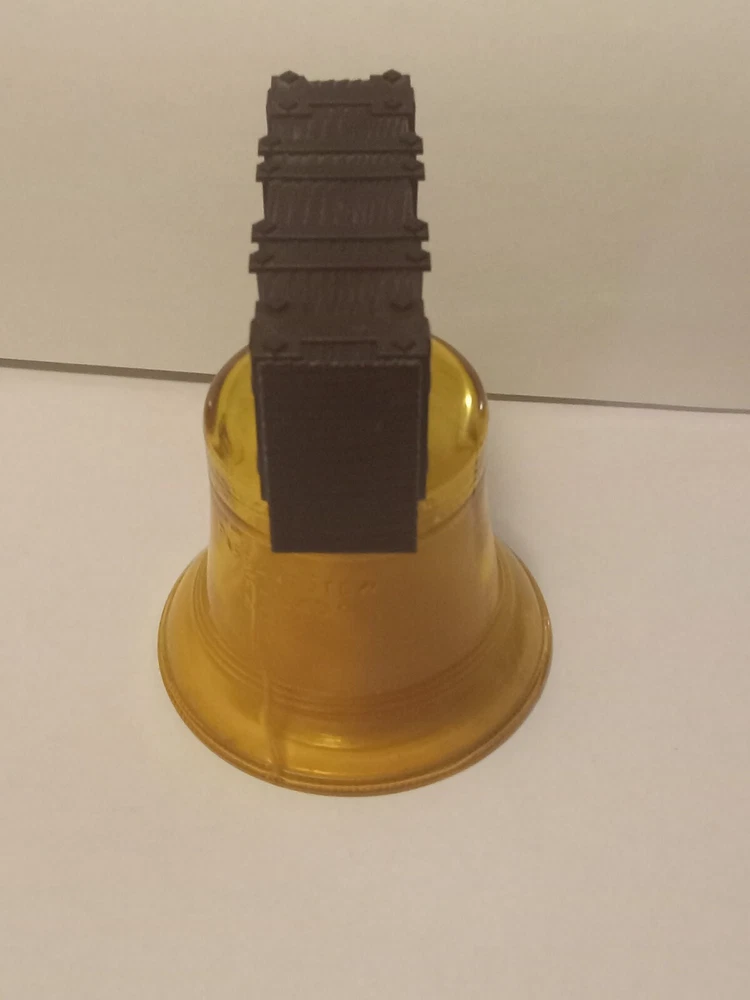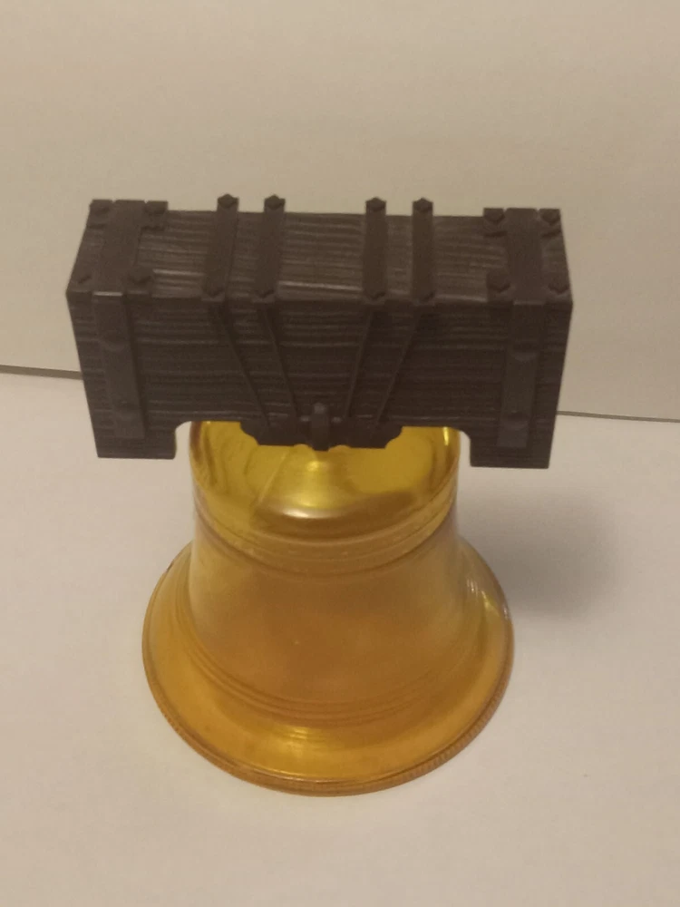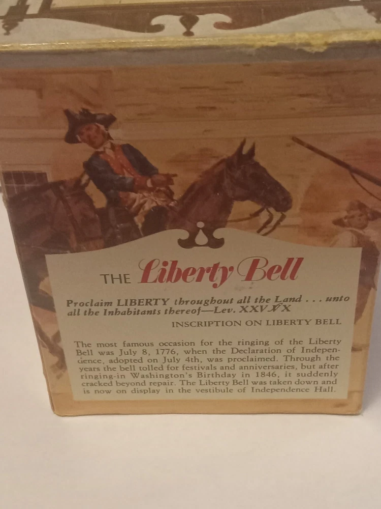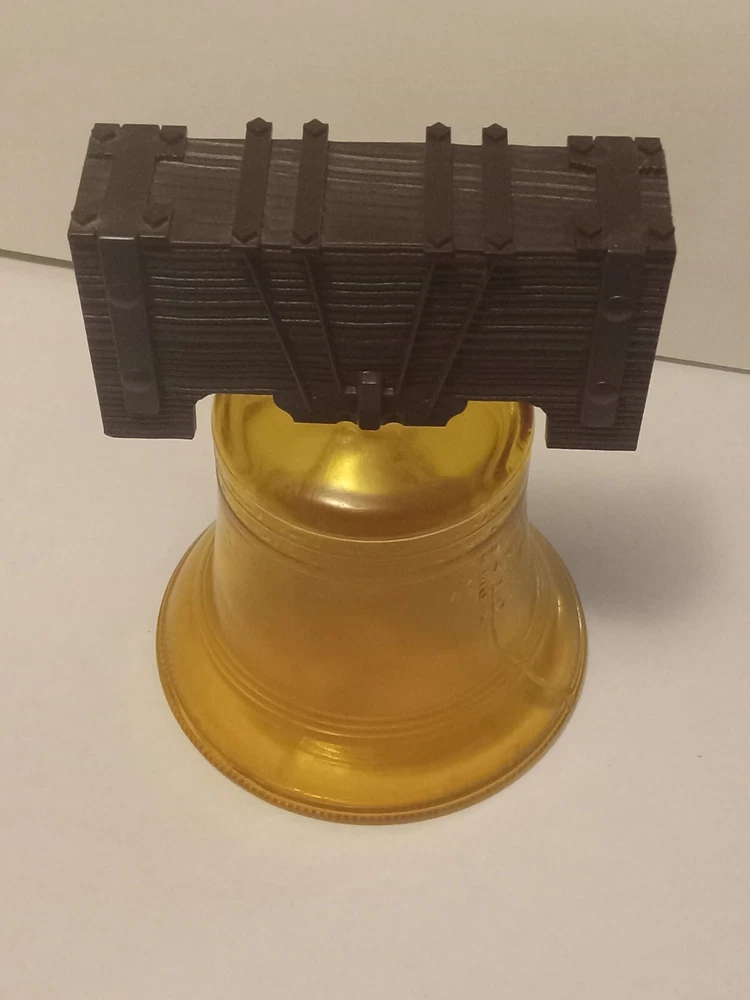 Vintage Avon Liberty Bell Decanter from 1976 featuring a Liberty Bell shape and a patriotic theme. This collectible item is made of glass and plastic, with a glossy gold finish. It comes empty with a lid and original box, representing the late 20th-century American style. The decanter holds 5 fluid ounces of Oland aftershave.