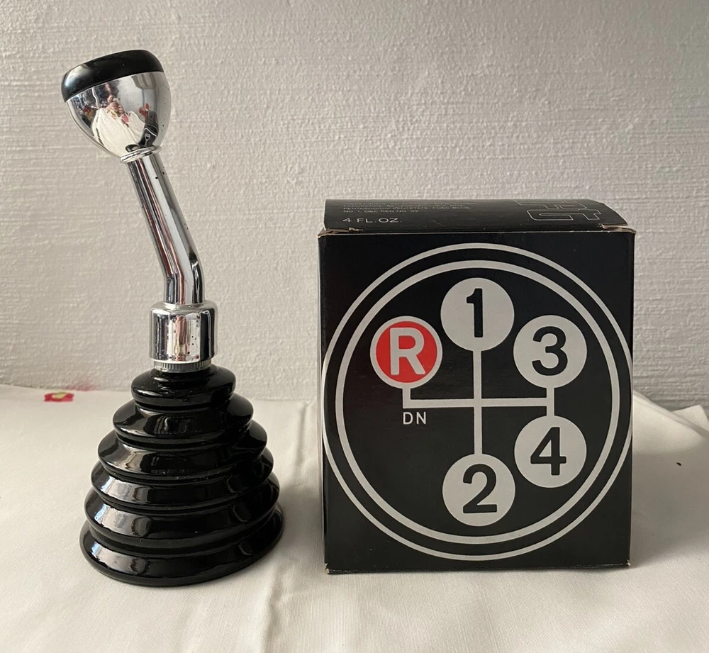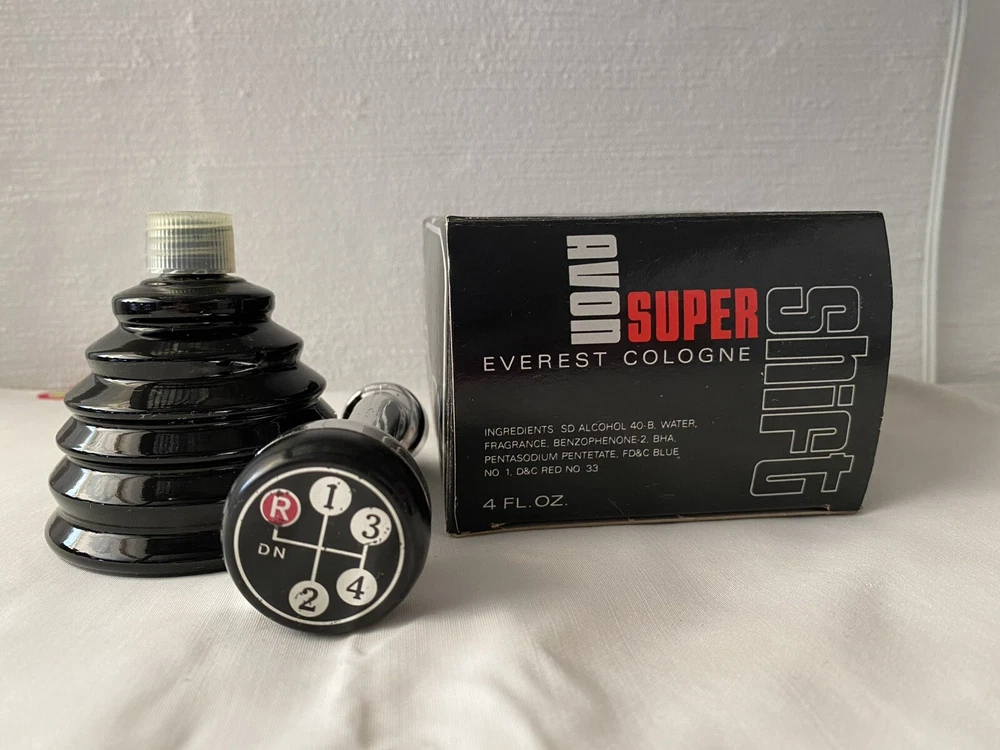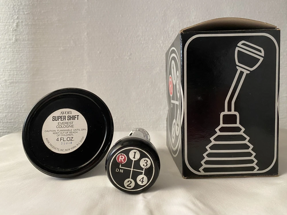 Vintage Avon “Super Shift” bottle with Everest Cologne. Bottle shaped like a gear shift, handle attaches to bottle lid. Small nick in chrome, not very noticeable.