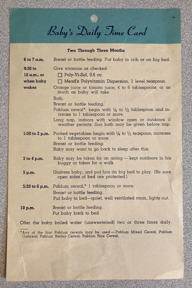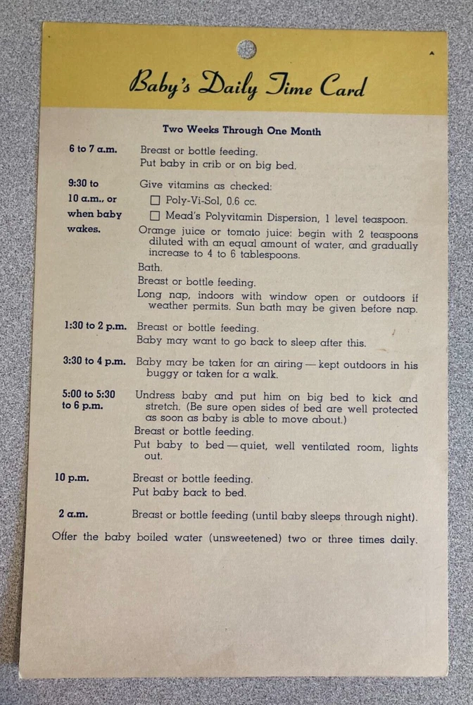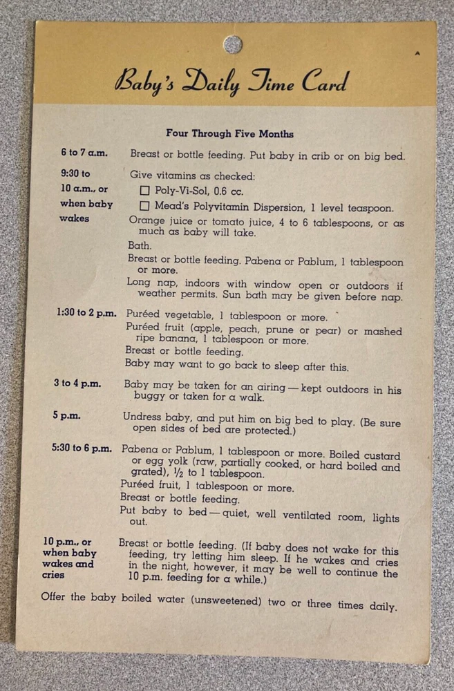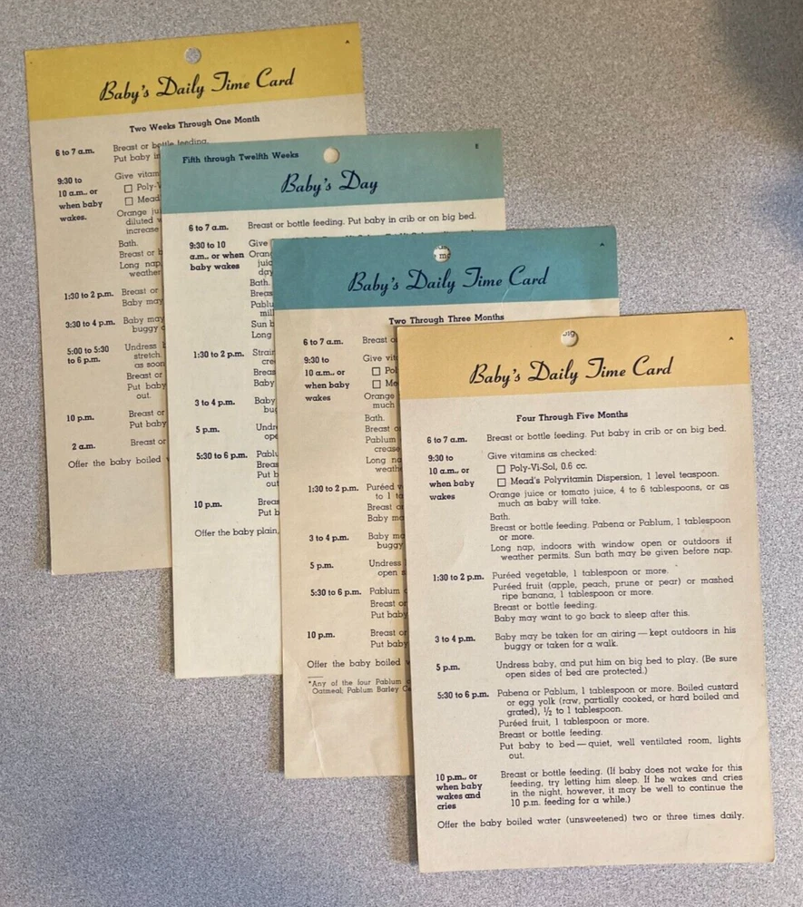Of historical interest, a set of 4 vintage (1953) Baby's Daily Time Cards. These date from the days when babies were put on a strict schedule, and given orange juice or tomato juice at 2 weeks of age. The cards measure about 8.25" x 5.5"; they are in fair to good condition, with age-related yellowing, some creases, and minor wear and tear.