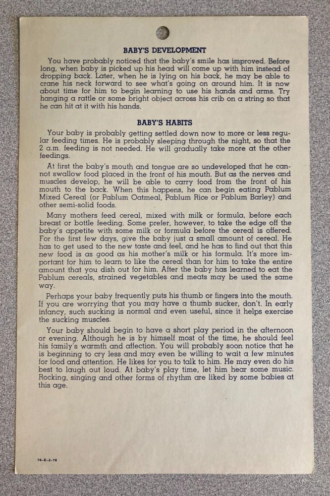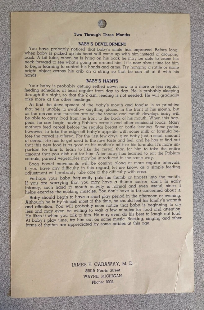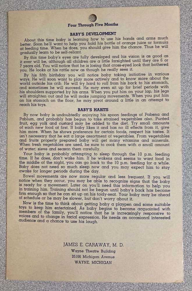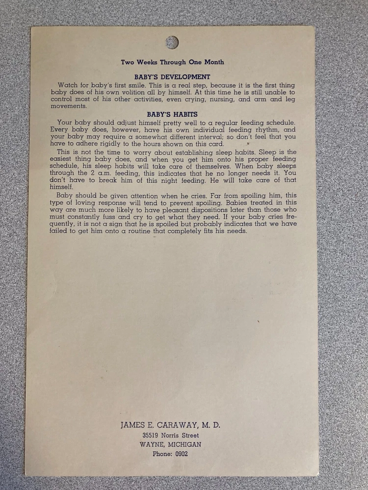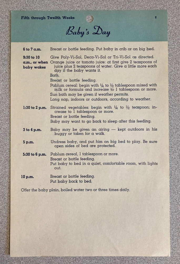 Of historical interest, a set of 4 vintage (1953) Baby's Daily Time Cards. These date from the days when babies were put on a strict schedule, and given orange juice or tomato juice at 2 weeks of age. The cards measure about 8.25" x 5.5"; they are in fair to good condition, with age-related yellowing, some creases, and minor wear and tear.
