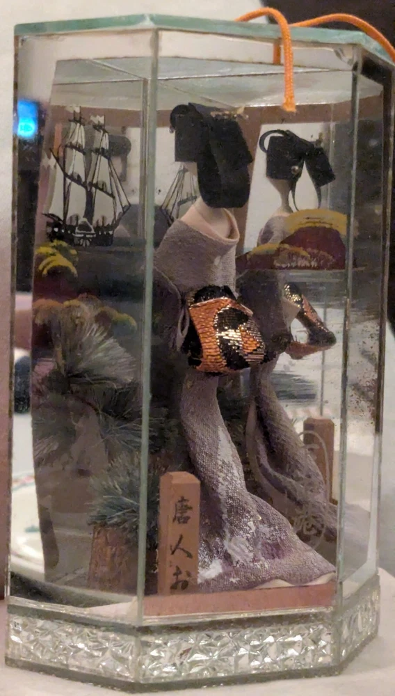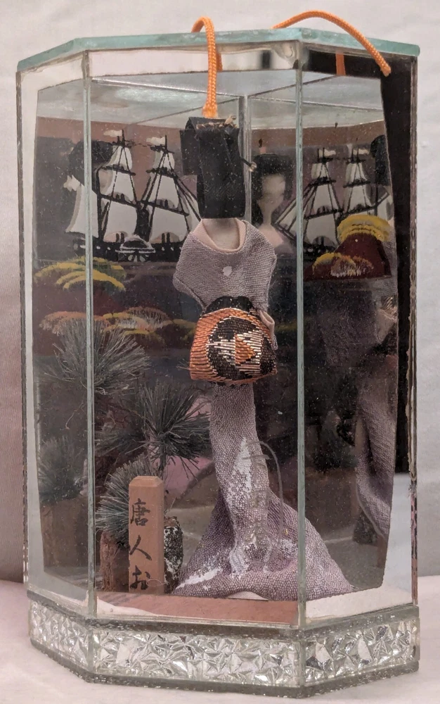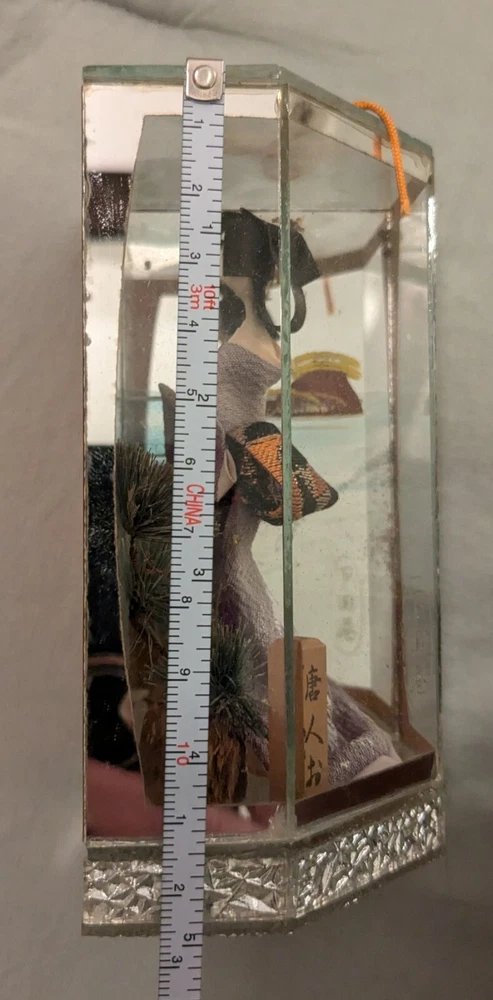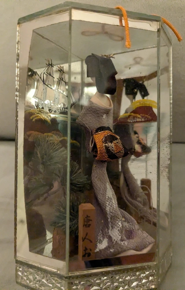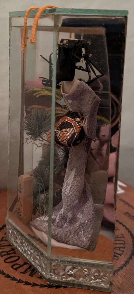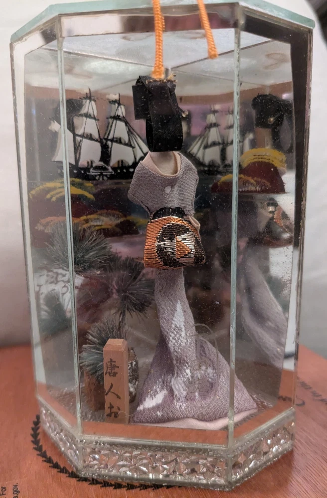 This is a unique and timeless treasure that features a beautiful handmade Japanese Geisha doll encased in a mirrored display case. The doll has straight black hair and black eyes, with a light complexion. She is a 3-inch doll inside the display case made of wood and mirrors. The mirrors has a detailed painting of the ocean with a sailing ship. It is a perfect addition to any collection, and it is ideal for display in any room. This doll is a perfect representation of Japanese culture and ethnicity, and it is a must-have for anyone who loves to collect dolls from different cultures.