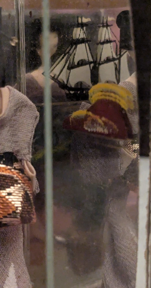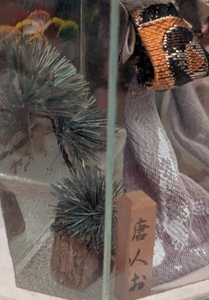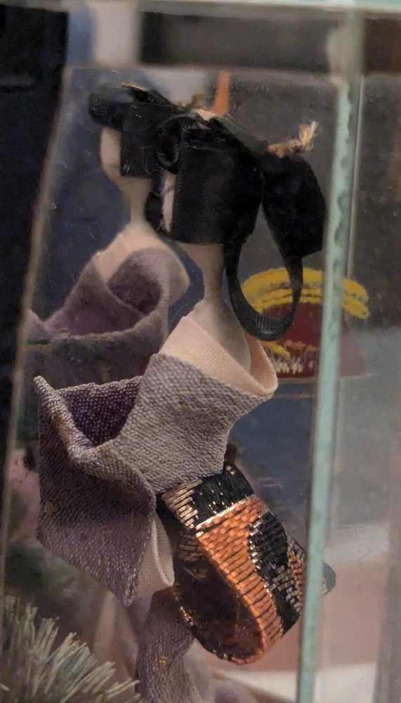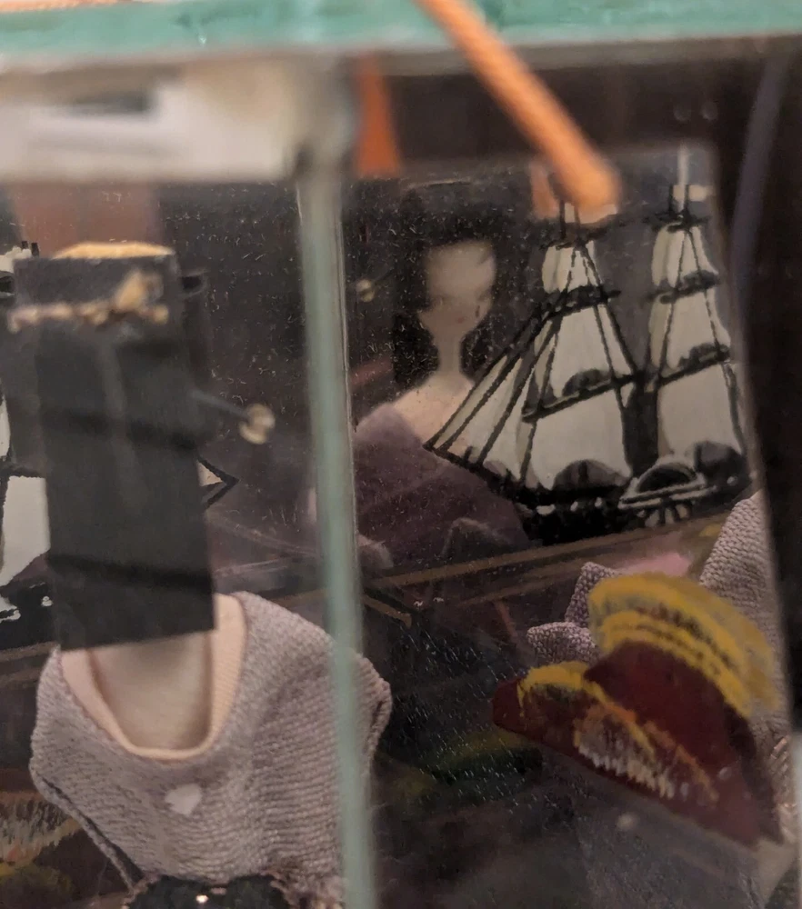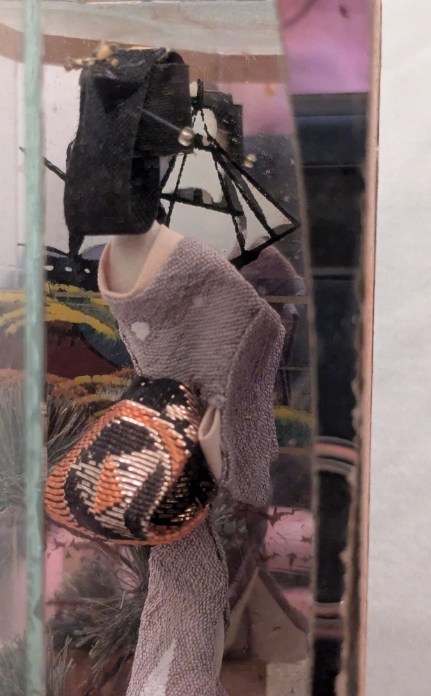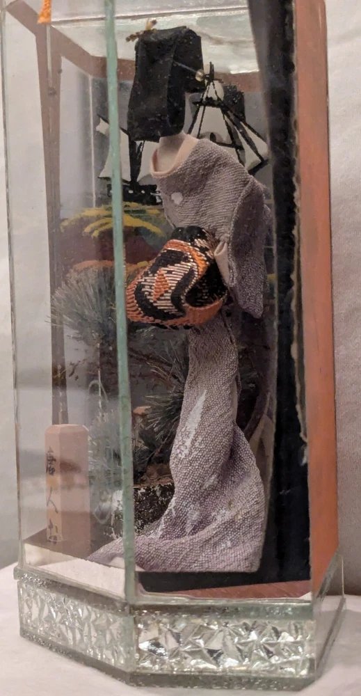 This is a unique and timeless treasure that features a beautiful handmade Japanese Geisha doll encased in a mirrored display case. The doll has straight black hair and black eyes, with a light complexion. She is a 3-inch doll inside the display case made of wood and mirrors. The mirrors has a detailed painting of the ocean with a sailing ship. It is a perfect addition to any collection, and it is ideal for display in any room. This doll is a perfect representation of Japanese culture and ethnicity, and it is a must-have for anyone who loves to collect dolls from different cultures.