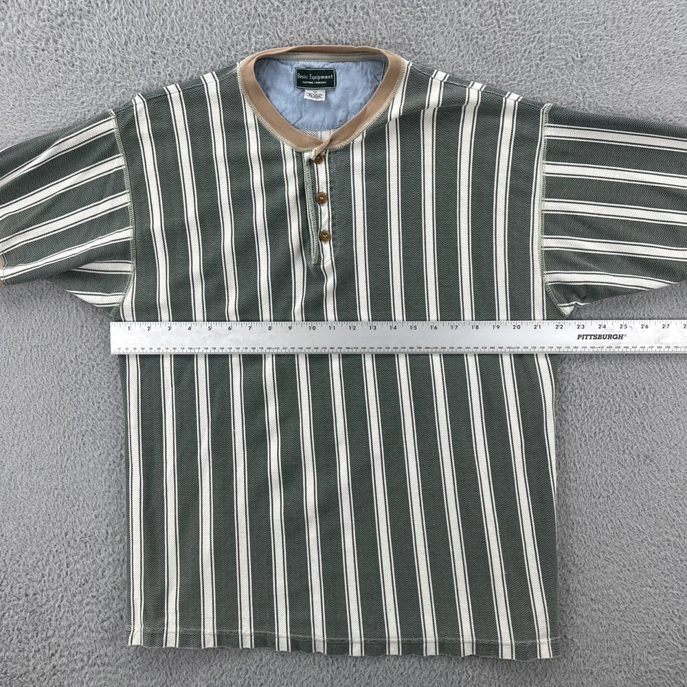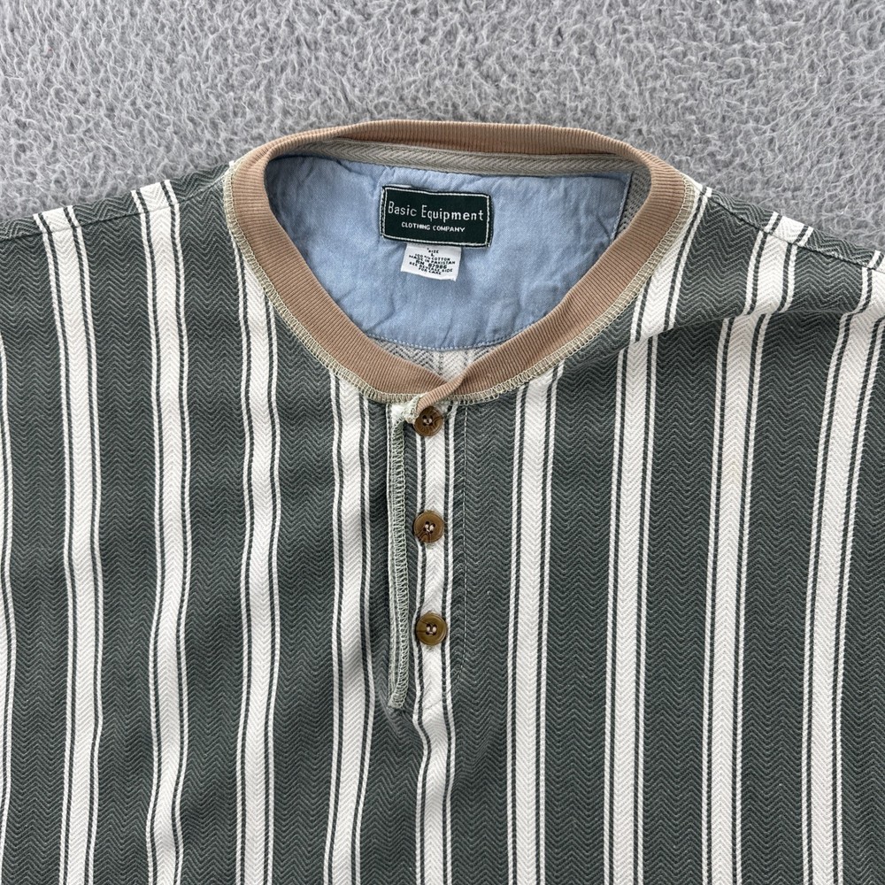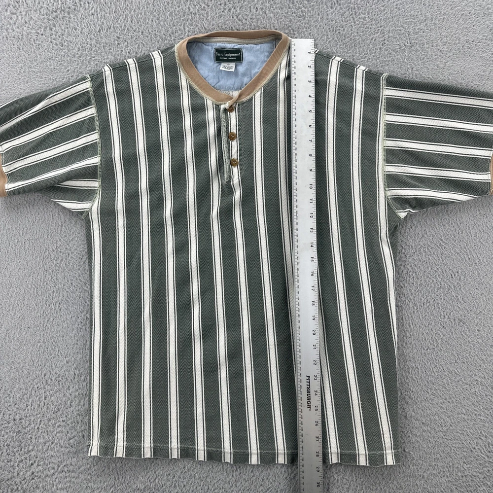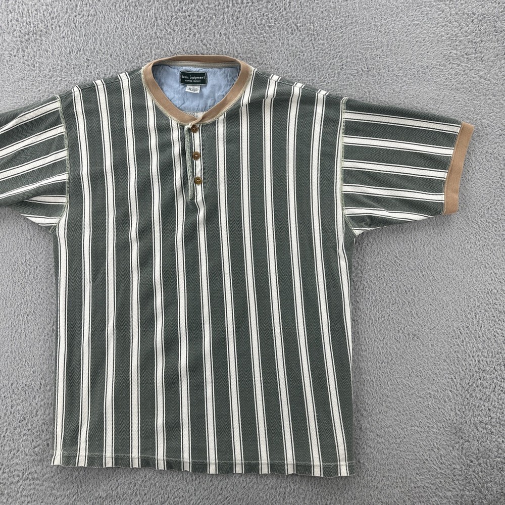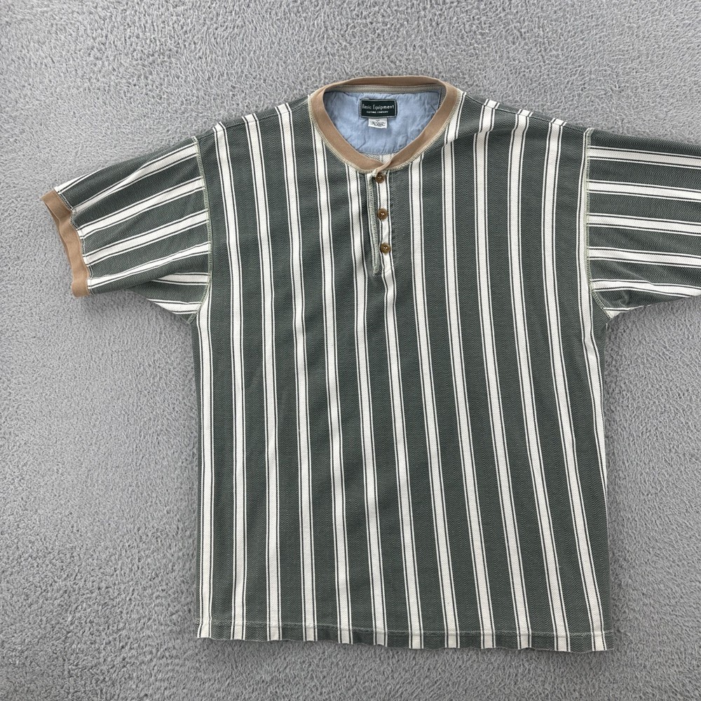 The Vintage Basic Equipment Men's Large Cotton Striped Henley Shirt is a stylish and classic addition to any man's wardrobe. Made from comfortable cotton material and featuring a vintage design, this short sleeve shirt in a multicolor striped pattern exudes a hipster and 90s vibe. The Henley neckline adds a unique touch to the regular fit of the shirt, making it a versatile piece that can be worn for various occasions. Perfect for men looking for a timeless and casual yet fashion-forward look. No holes or stains See pictures for pictured measurements compare with your favorite garment and ask questions if you have any Add to your collection today Browse my other items I can combine shipping