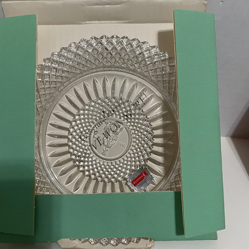 Vintage~ Beautiful 1978 Avon 92nd Anniv Set of 2 FOSTORIA LEAD CRYSTAL ~8"Plates The product is a set of two vintage 1978 Avon 92nd anniversary collector plates made by Fostoria from lead crystal glass. Each plate has a diameter of 8 inches and features an elegant glass production style. These round plates are considered antique and were manufactured in the United States. The design and material of these plates reflect a high level of craftsmanship and are sought after by collectors of decorative glassware.