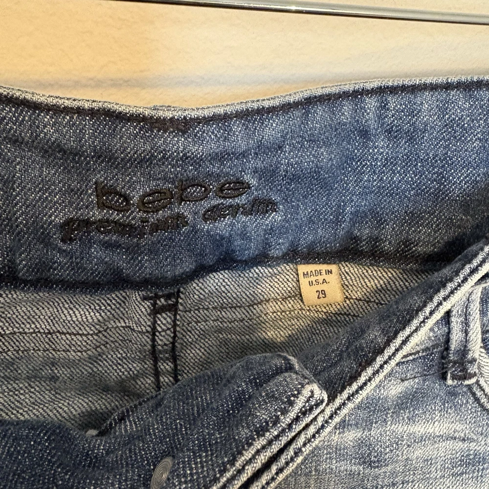 This is a vintage Bebe mini jean skirt in size 29, designed for juniors. The skirt is in a stylish blue color with a short length, making it perfect for summer and spring seasons. It features a classic mini style and was manufactured in the United States. The Y2K aesthetic adds a trendy and nostalgic touch to this piece, making it a fashionable choice for any young woman looking to add a retro flair to her wardrobe.