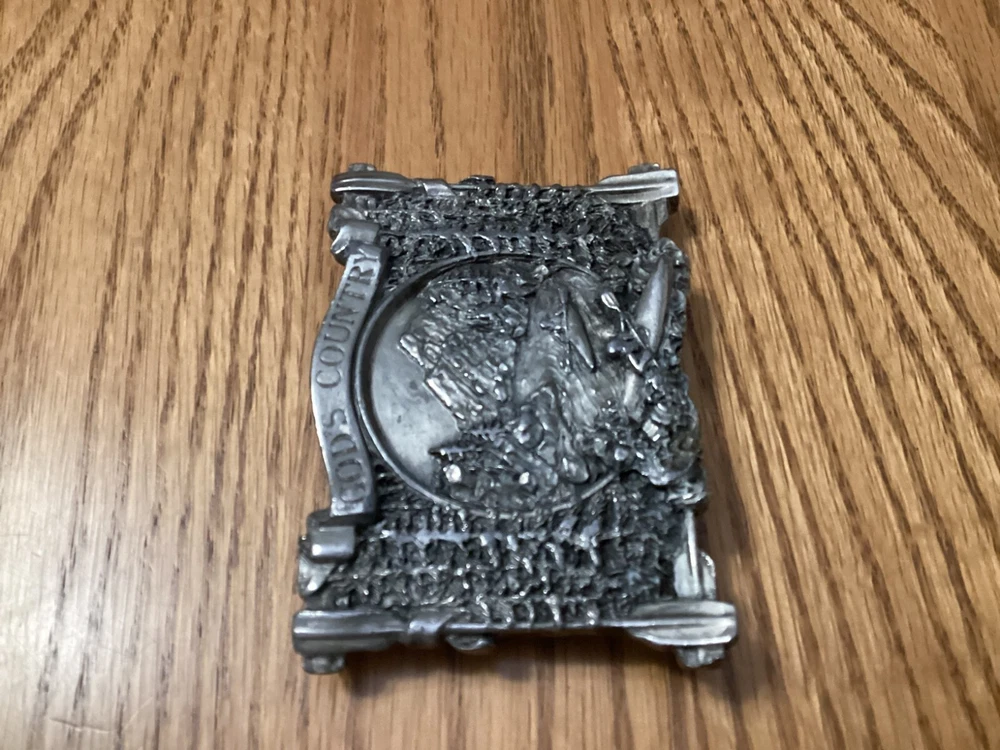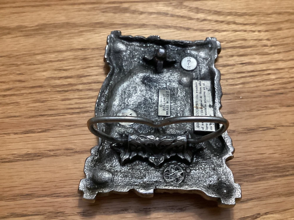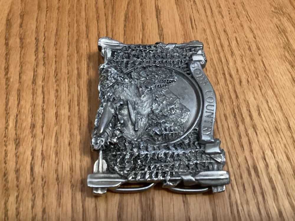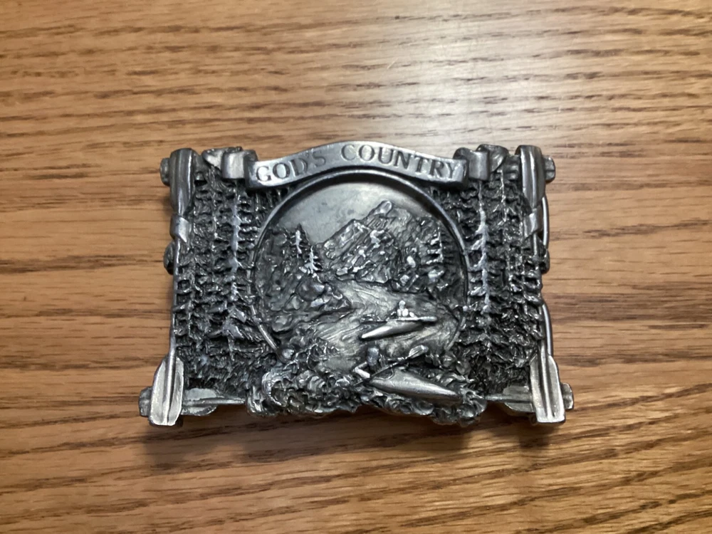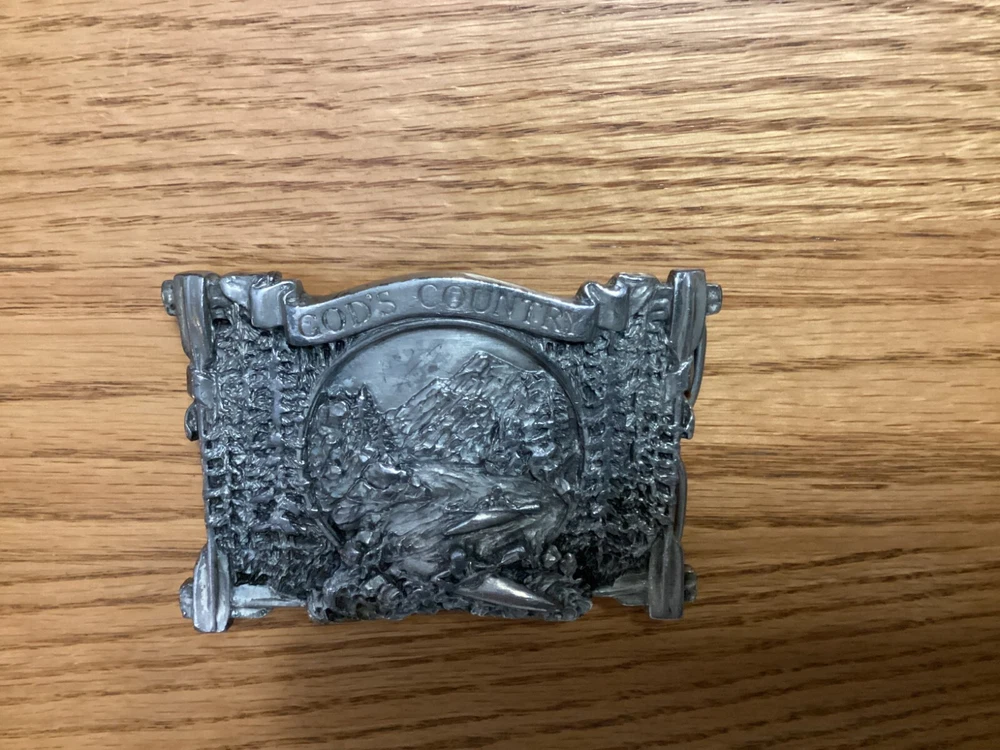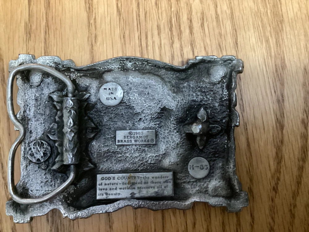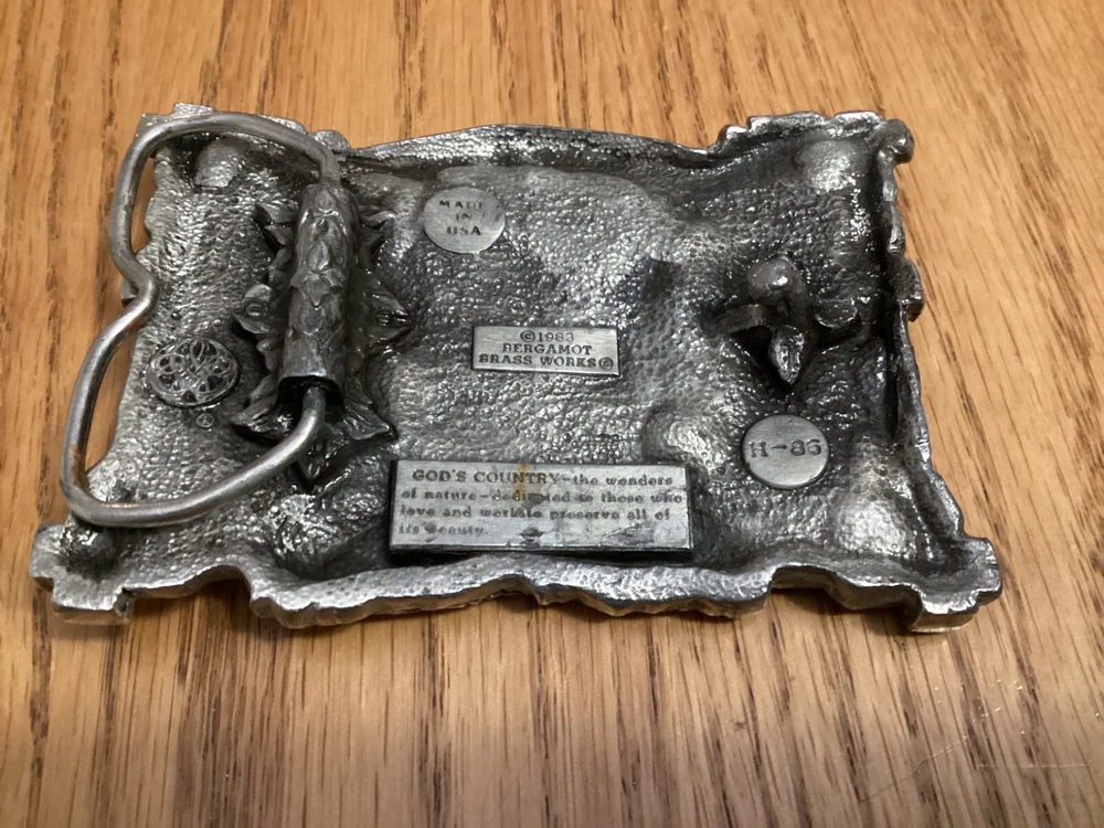 Vintage Bergamot Brass Works belt buckle from 1983 features a rectangular design with a "God's Country" theme. Very beautiful design Made of silver brass in the United States, it fits a 2-inch belt and is suitable for those who appreciate country-inspired accessories.