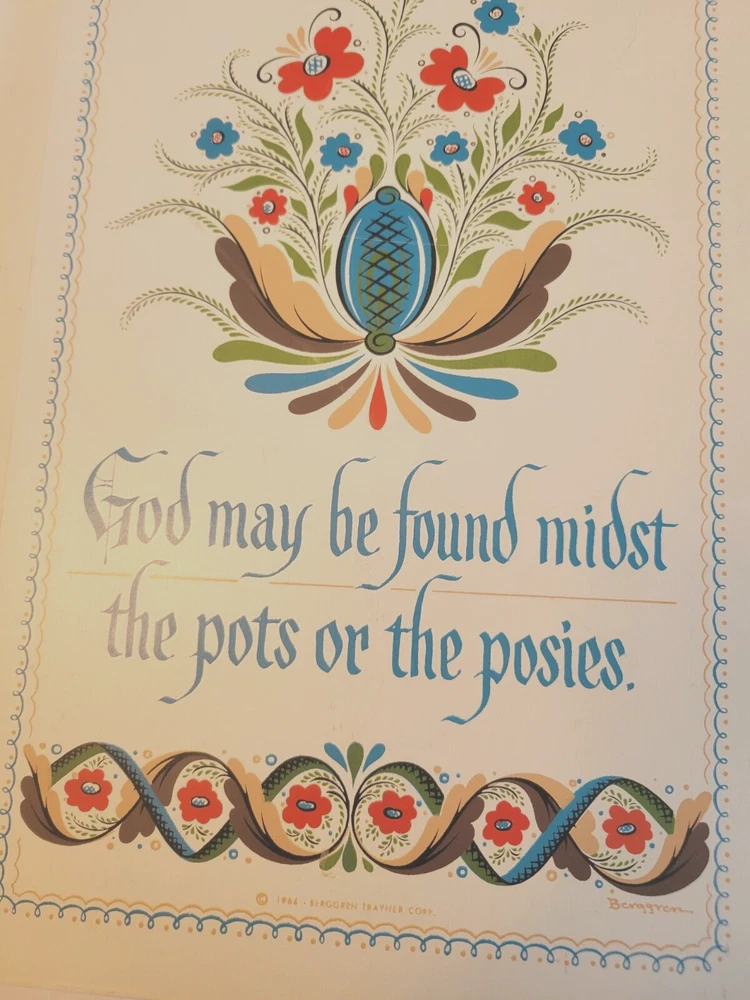 1964 Berggren-Trayner Scandinavian cutting board. White with floral painting. Reads "God May be Found Midst the Pots or the Posies". Board is 8" across and 17" long and 3/4" deep. There is a mark across the board that can only be seen at an angle in a particular light. You can not see it straight on and I was not able to capture it in a picture. It is not a gouge and cannot be felt. Aside from that, board is in very nice condition.
