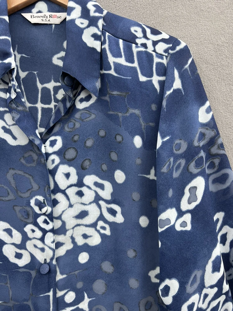Please see measurements size tag is missing. This vintage Beverly Rose button-up tunic is a must-have for any fashion enthusiast. The abstract pattern and blue color make it perfect for any occasion, whether you're attending a wedding or a casual get-together with friends. The long sleeves and collared neckline give this piece a classic feel, while the relaxed fit and lightweight polyester material make it comfortable and easy to wear. Featuring a button closure and accents, this tunic also has a vintage touch that adds to its charm. The size is M/L, making it a great fit for regular sizes, and it's ideal for those who love the USA theme. You won't find a more unique and stylish top than this vintage Beverly Rose tunic.