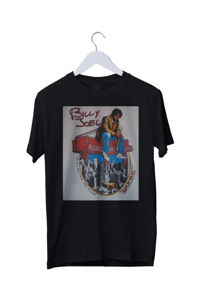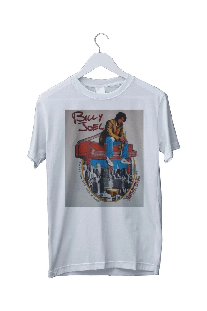 This Vintage Billy Joel 1976 New York State Of Mind T-Shirt showcases a classic graphic print design featuring the iconic musician's logo. Made from 100% cotton jersey fabric, this short sleeve crew neck shirt is machine washable and available in sizes S, M, L, XL, 2XL, and 3XL. Perfect for fans of music, cars, motorcycles, and colourful retro designs, this limited edition t-shirt is ideal for all seasons and is proudly made in the United Kingdom.