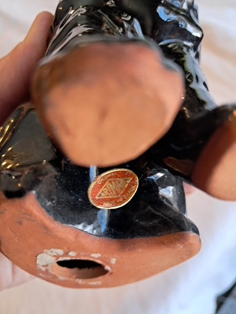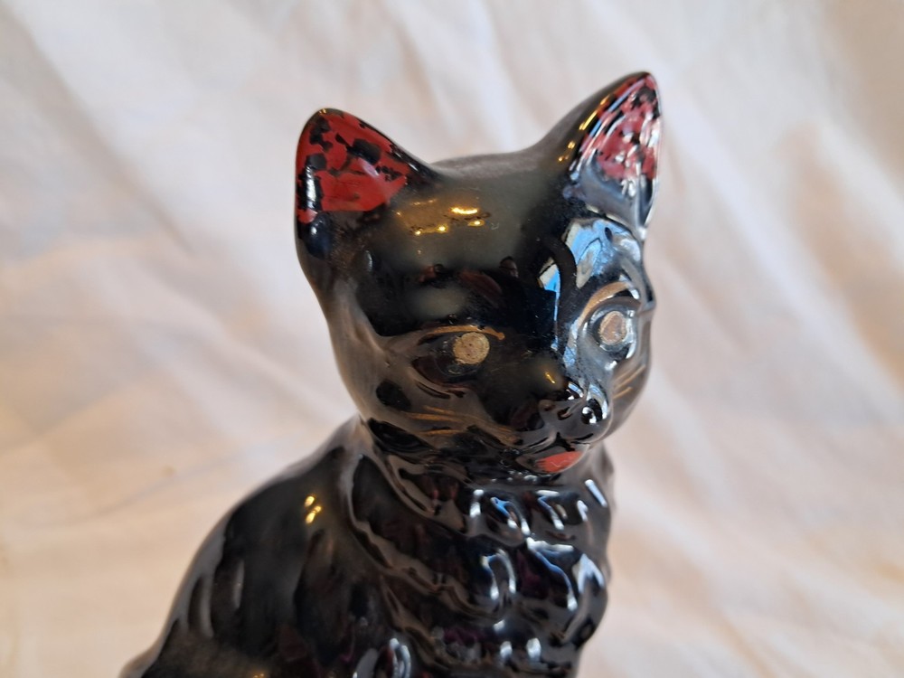 Vintage ARTMARK Black Ceramic Cat Family Figurine Set A wonderful, collectible mid-century black ceramic cat family imported by Artmark. This listing includes three pieces —one large 6-inch adult cat and two smaller kittens connected by a chain. Configuration Note: The chain is currently only attached to the two kittens. It is highly probable that the chain originally connected to a collar on the main cat, which has since deteriorated a common occurrence for these vintage sets. The three cats are meant to be displayed together as a family group. Key Details: Brand: Artmark (Artmark Chicago) Pieces: Set of 3 figurines (Large cat & 2 chained kittens). Era: Mid-Century Modern (MCM), likely 1950s-1960s. Markings: Original red and gold diamond-shaped Artmark sticker on the base of the large cat. Material: High-gloss black glazed ceramic over an unglazed reddish clay base ( terracotta/redware ). Condition: Excellent vintage condition. No chips, cracks, or repairs. The chain on the kittens is intact. The small collars on the kittens show minor deterioration consistent with age. Size: Large cat measures approximately 6 inches tall.