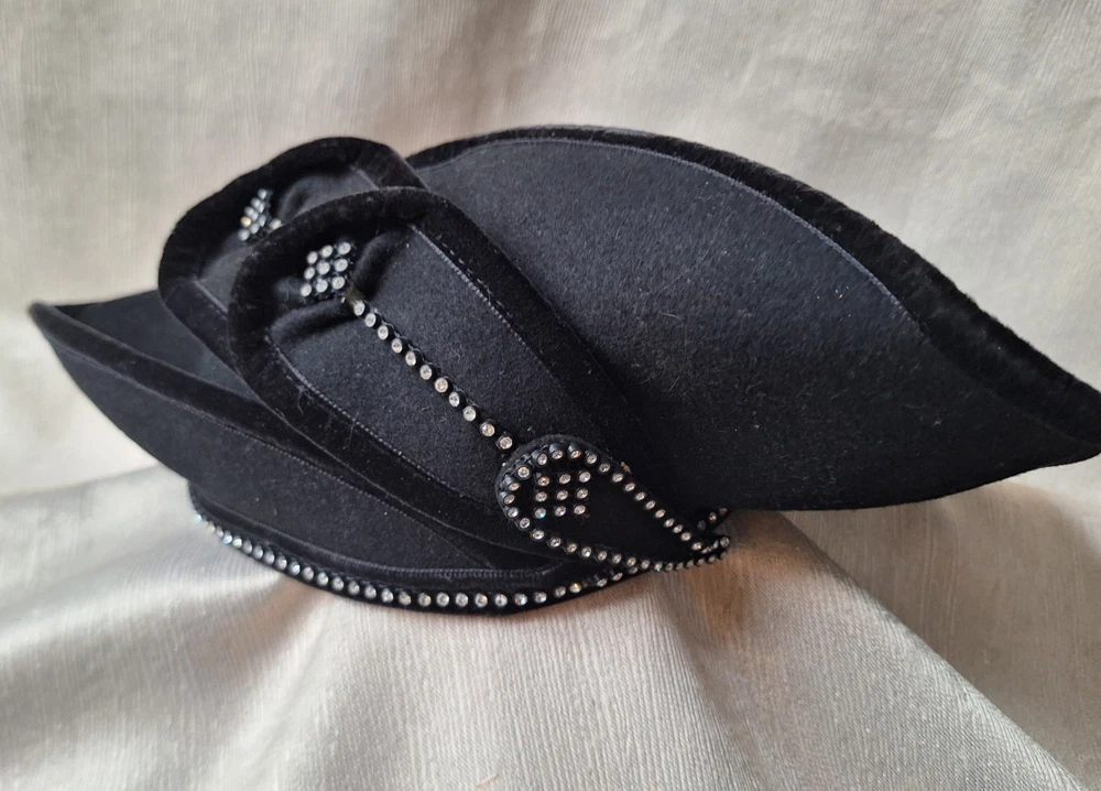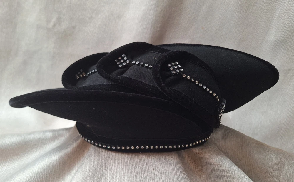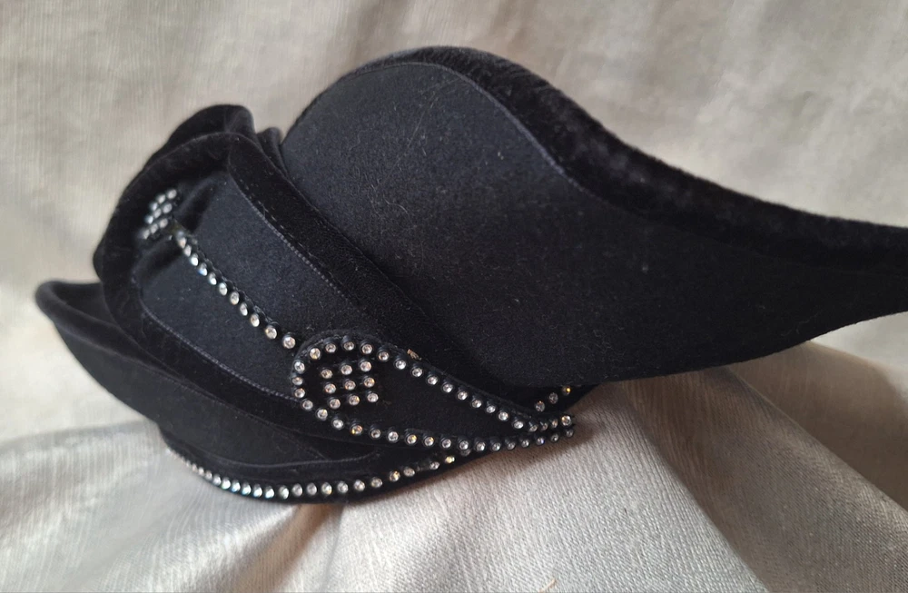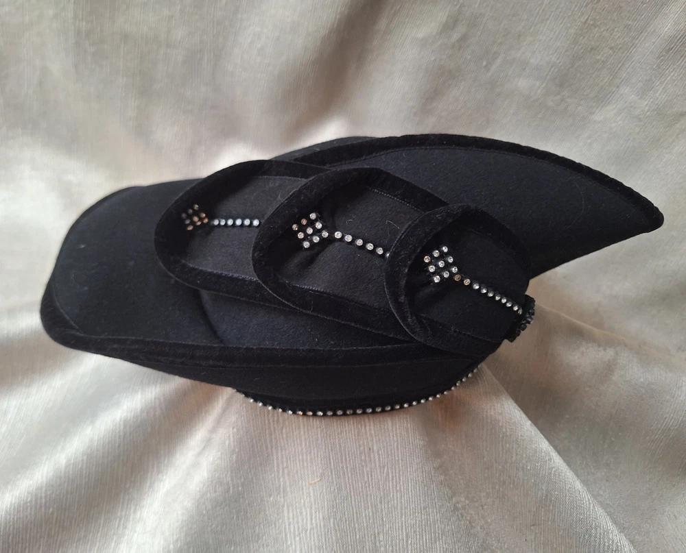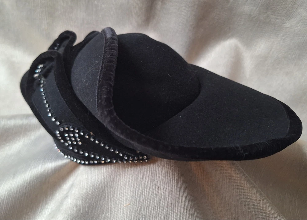 High style chapeau! This vintage black velvet hat with rhinestones by Deborah of New York is a luxurious and elegant piece perfect for a special occasion. Dating back to the 1950s, this original Victorian-style hat features intricate rhinestone embellishments that add a touch of glamour. The medium size and classic black color make it a versatile accessory that can complement various outfits, while the high-quality velvet material exudes a timeless charm. Perfect for vintage enthusiasts looking to add a sophisticated touch to their wardrobe. High style. 20 inch circumference around the headband area. Good pre-owned condition. 1 minor flaw on wire of brim. SOLD AS IS. USPS SHIPPING
