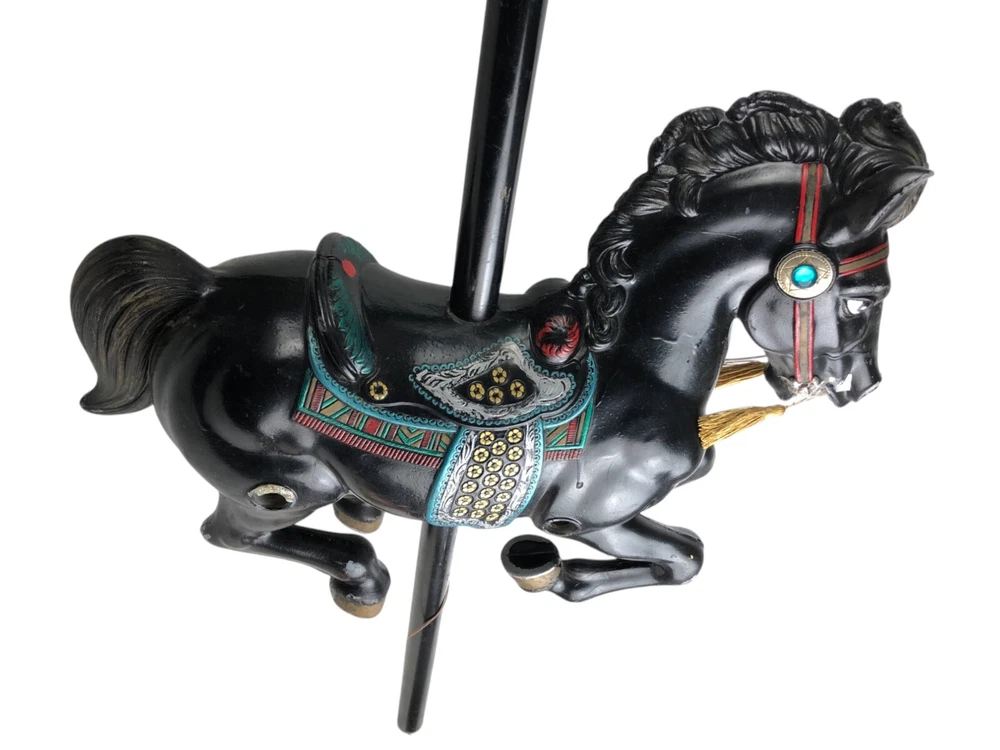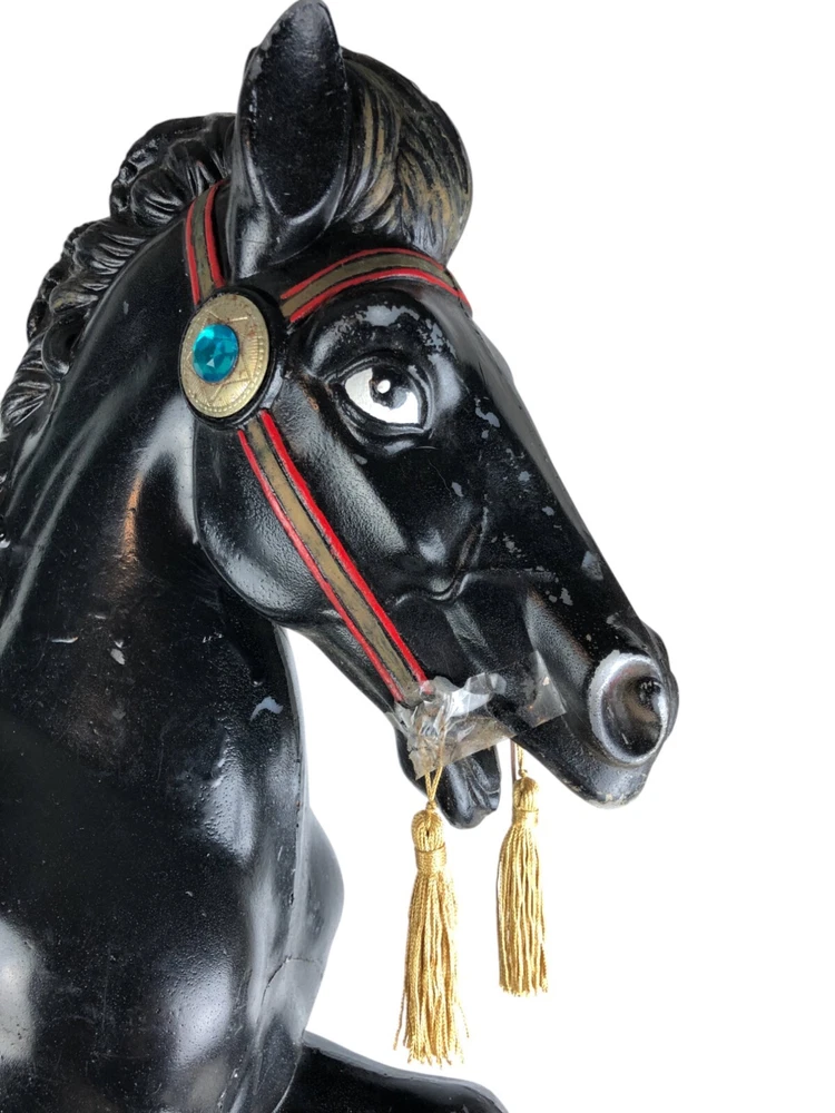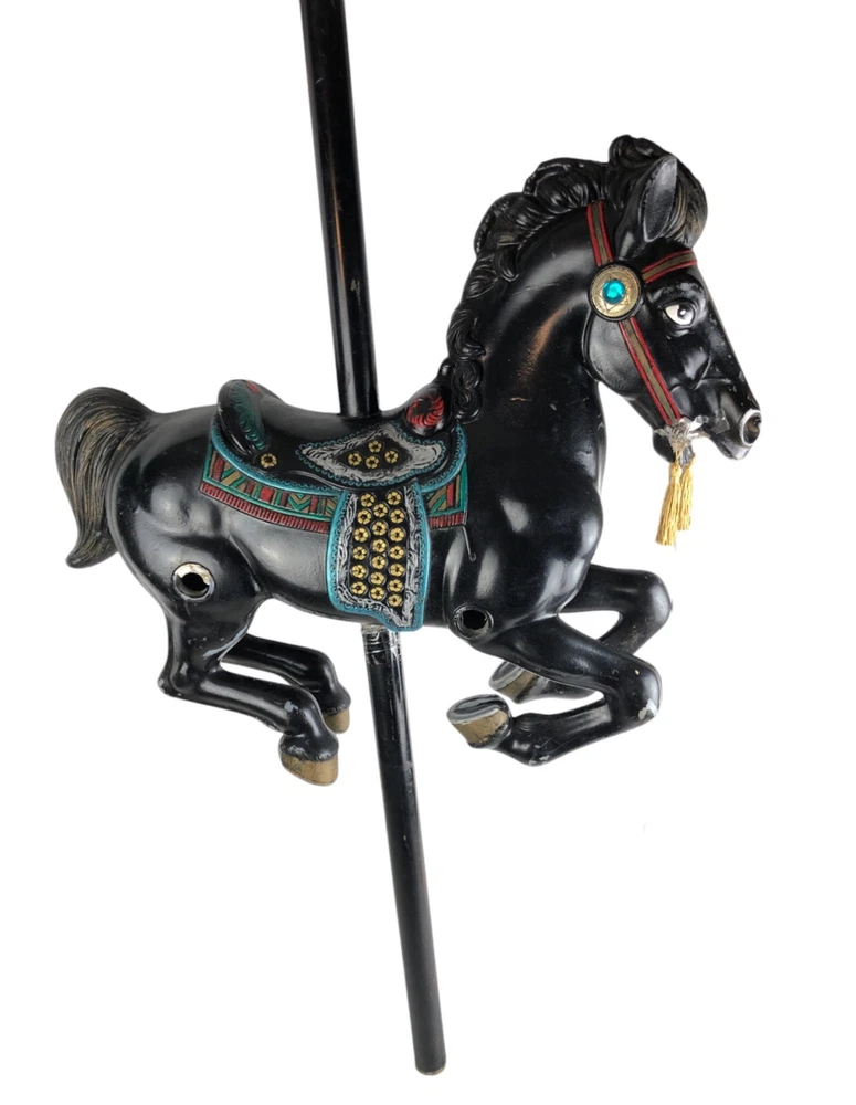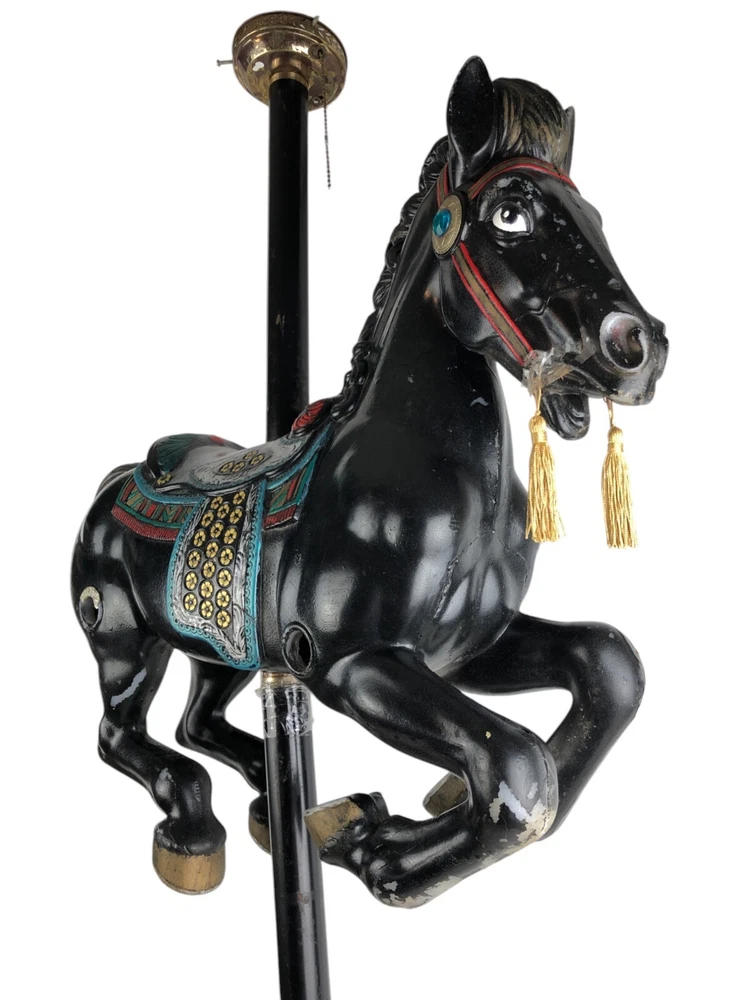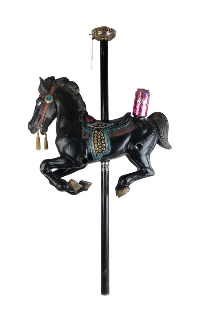 This horse is a dandy! He's 40 inches long from nose to tail, and he's on a 45" metal pole. He's missing a little paint here and there, but he's a very good-looking horse overall! Someone turned him into a lamp, but that's easy enough to undo- or complete, if you like.