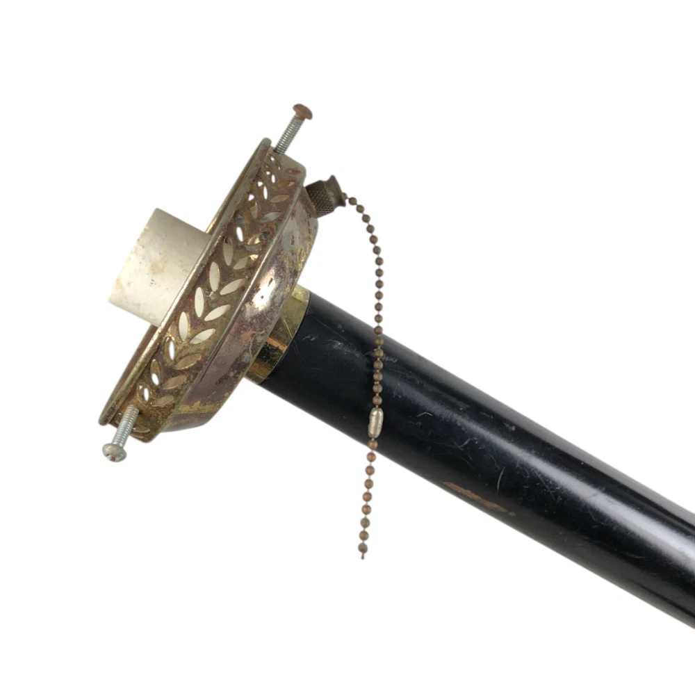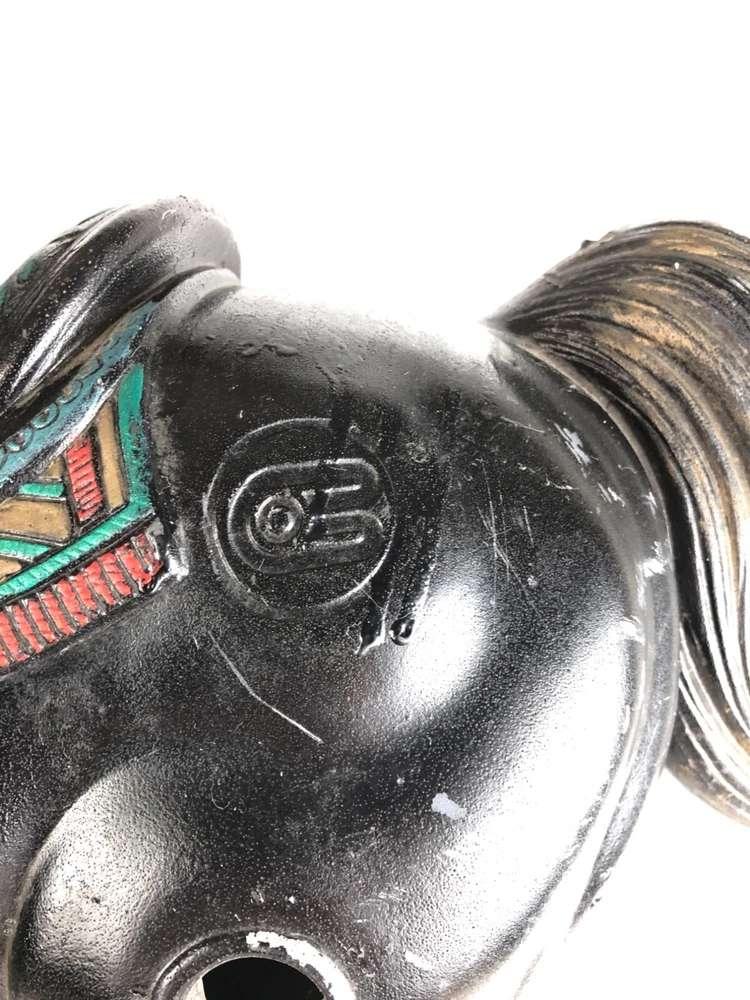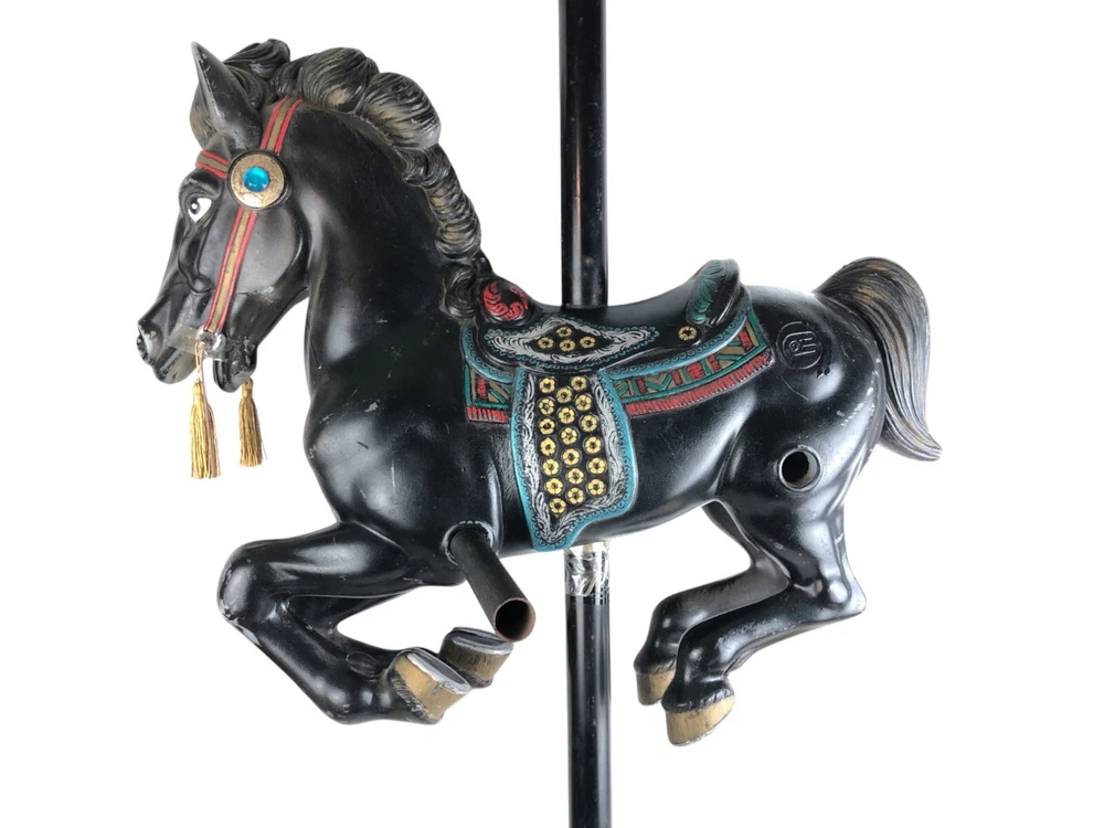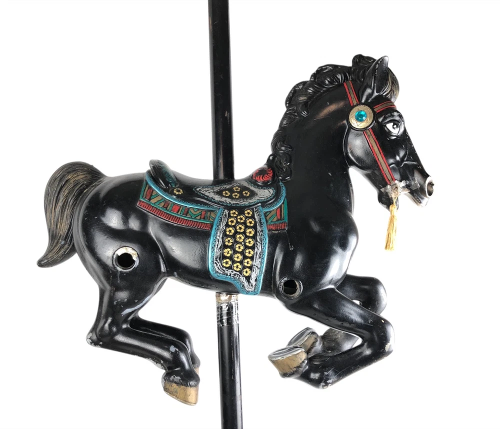 This horse is a dandy! He's 40 inches long from nose to tail, and he's on a 45" metal pole. He's missing a little paint here and there, but he's a very good-looking horse overall! Someone turned him into a lamp, but that's easy enough to undo- or complete, if you like.