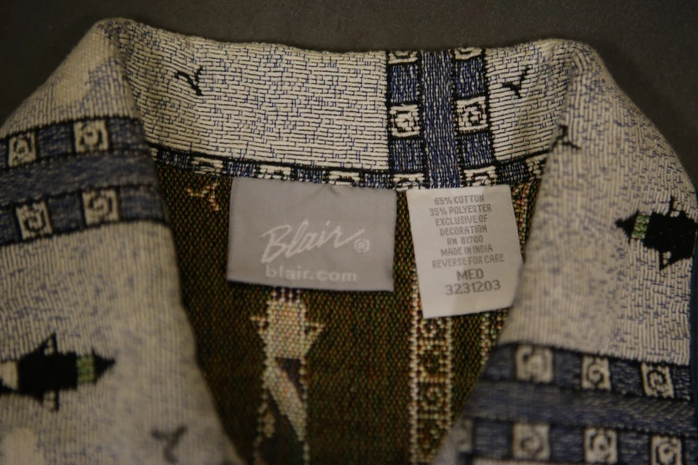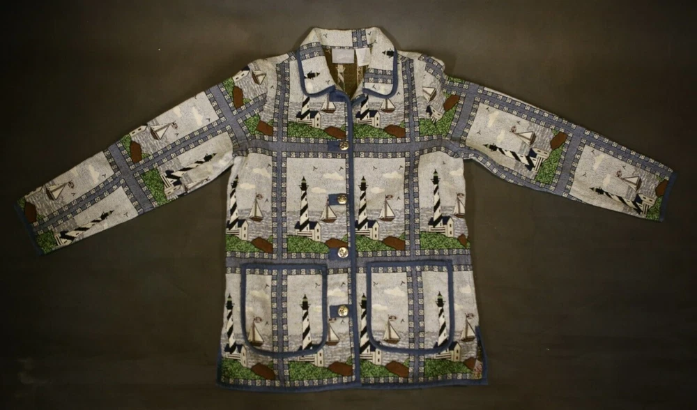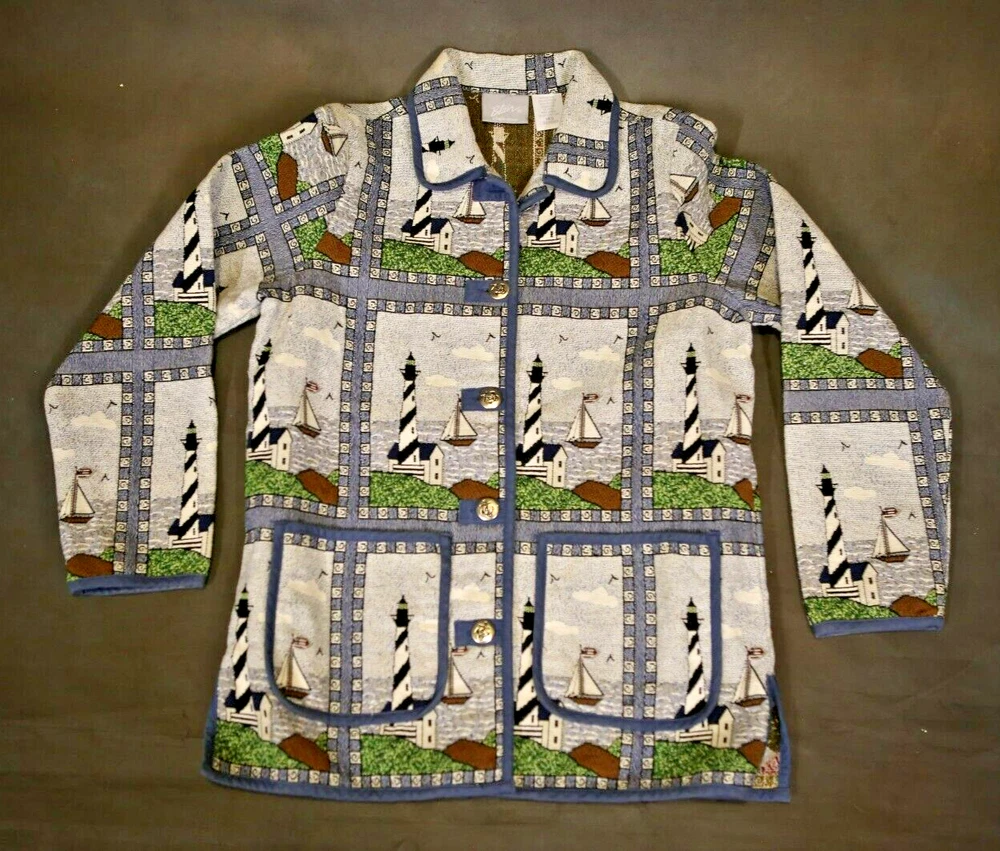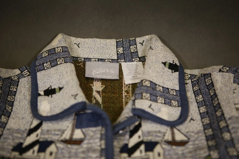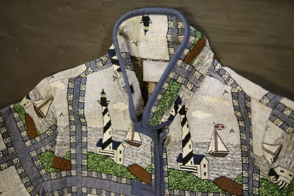 Vintage Blair Tapestry Women’s Blazer Jacket Lighthouse Nautical Size M Buttons Beautiful vintage tapestry women’s blazer with nautical pattern by Blair. It has two front pockets and fastens with buttons. Used in great condition. This is used item in great condition, but it’s vintage so it may have some signs of wear. Please see pictures for details. Details: Brand – Blair Material – 55% cotton, 35% polyester Color – Multicolor Condition – Like New Size – M Payment Policy You must pay within 48 hours after winning the item. Return Policy No Returns. All items are sold as-is. You will get the item in the picture. I take good pictures and describe all defects, so bid only if you like what you see and read. Ships after confirmed payment within 7 days. I1188 C3.5