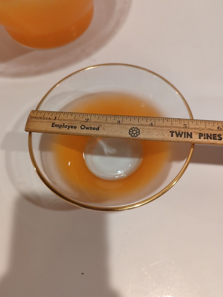 Usually when I happen upon these gorgeous frosted glass Blendo bowls, they've gone through the dishwasher or been so beat up, the color and gold rim are really scratched. Not the case with this orange chip and dip set! Yes, there's a little wear, but the color and rim are in great shape as seen in the pictures. The chip bowl measures about 11 inches across and the dip bowl measures about 5 inches. Sadly, the accompanying bracket could not be located, but your friends will be just as impressed with them sitting side by side!