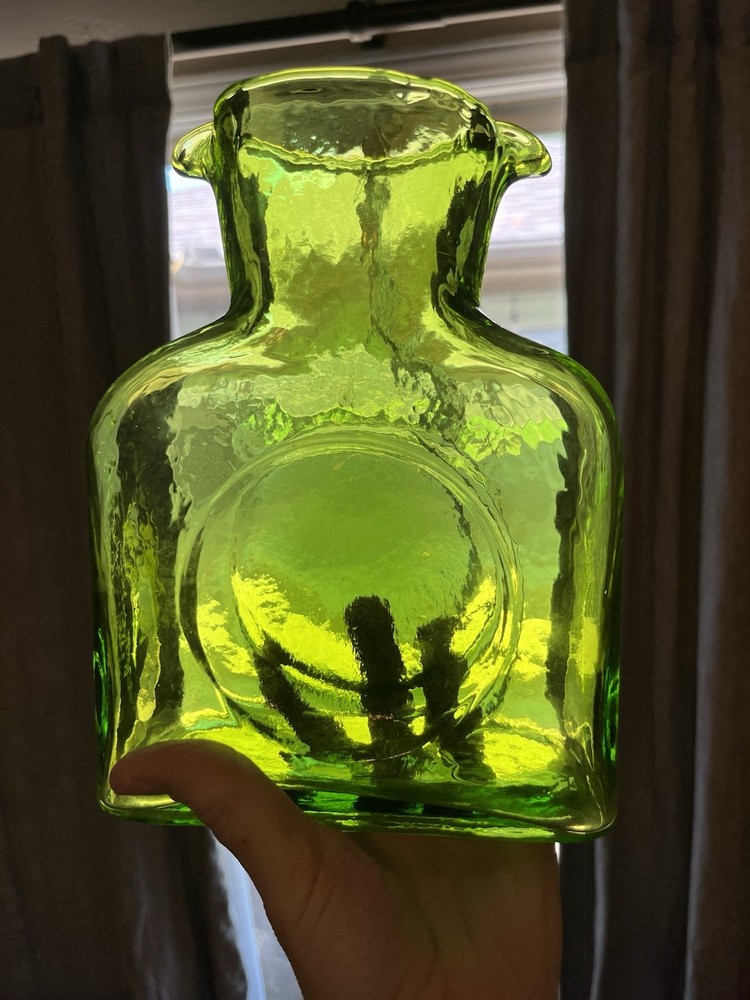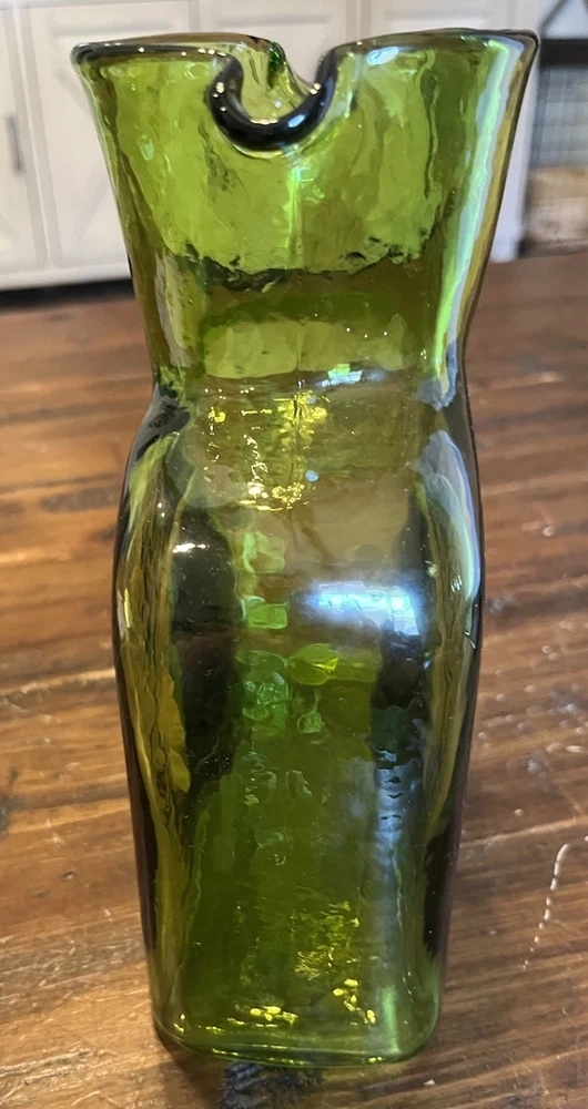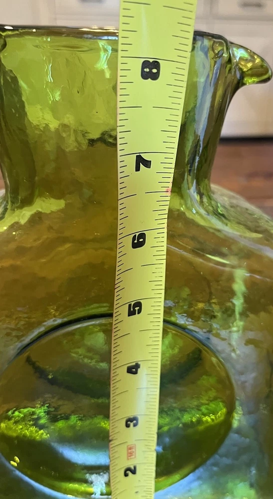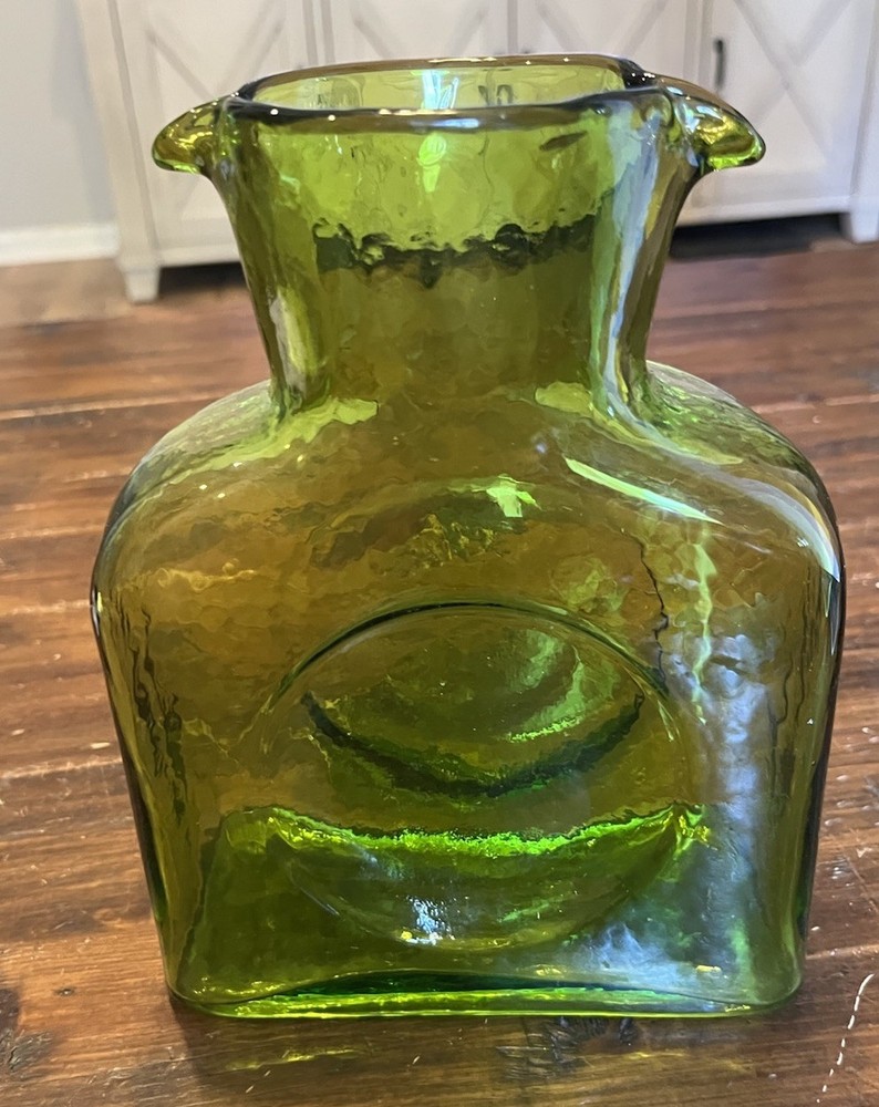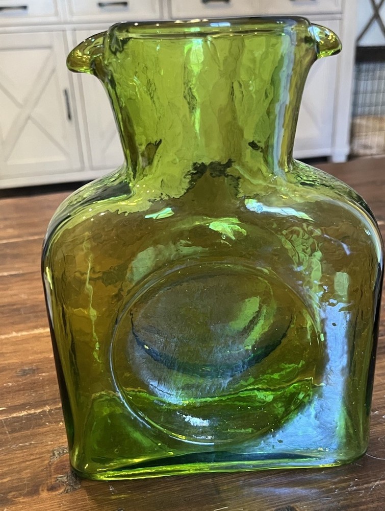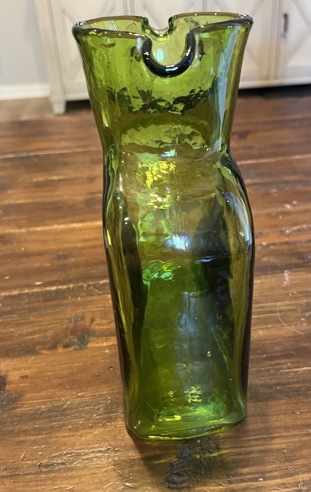 Origin:North CarolinaStyle:Mid-Century ModernCountry/Region of Manufacture:United StatesProduction Technique:Hand Blown GlassShape:RectangleVintage:YesFinish:GlossyAntique:NoTime Period Manufactured:2000-2009Type:PitcherItem Width:3 inProduction Style:Art GlassNumber of Items in Set:1MPN:384Handmade:YesCare Instructions:Hand Wash OnlyBrand:BlenkoColor:GreenItem Length:6.5 inItem Height:8 inPattern:SolidOriginal/Licensed Reproduction:OriginalPackaging:UnboxedMaterial:GlassTheme:AmericanFeatures:Decorative, Easy to Fill