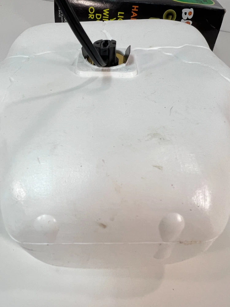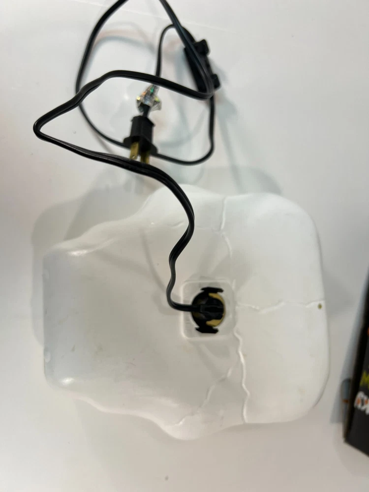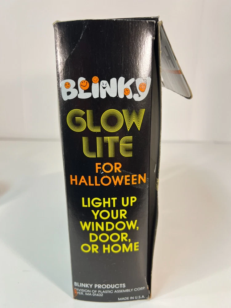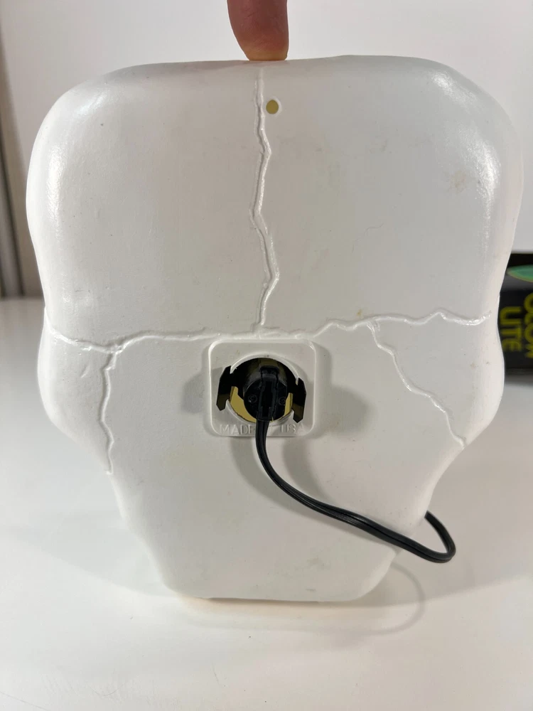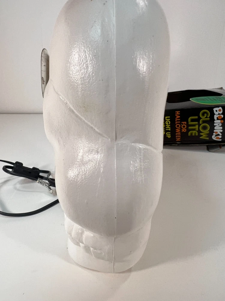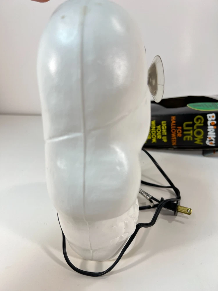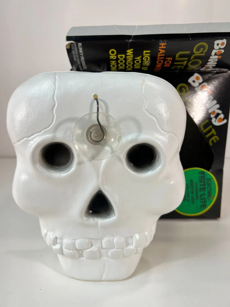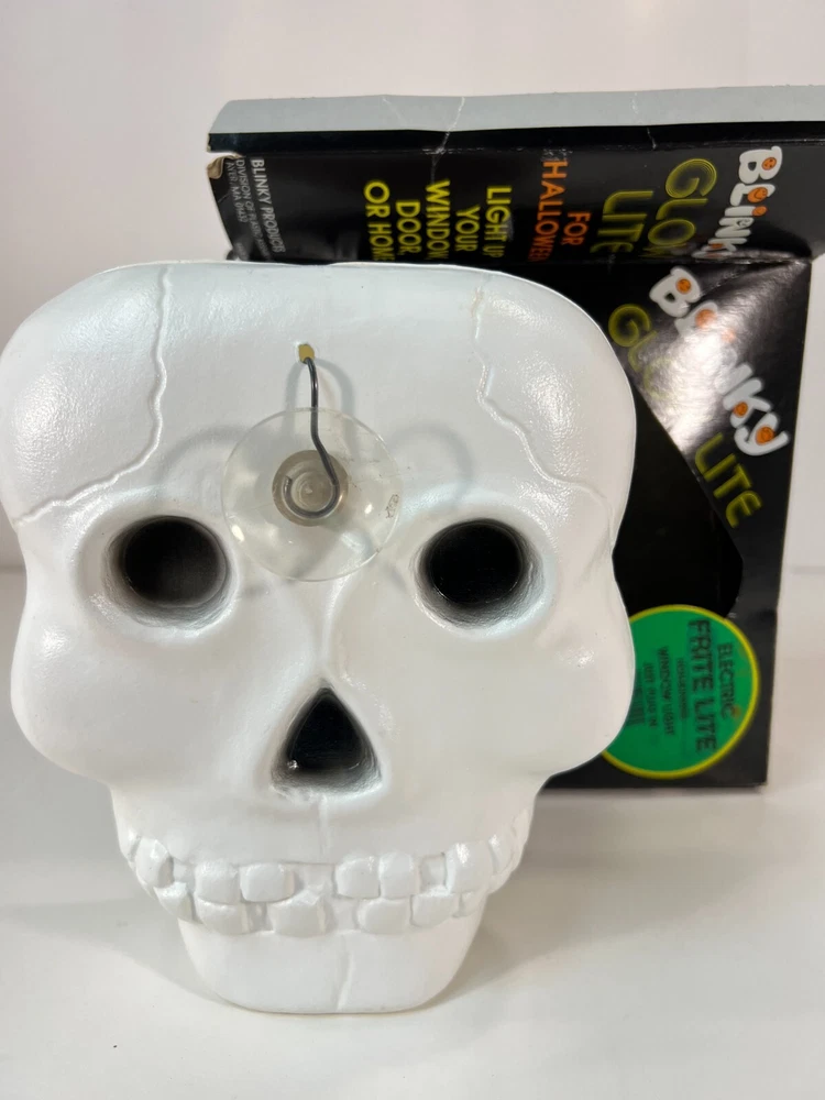 This vintage Blow-Mold Light Up Skeleton Face Blinky Glow Lite is a spooky addition to your Halloween decor. The 8" x 8" light is corded and made of plastic, with a unique glow that makes it stand out. The design is a novelty item that will attract collectors and enthusiasts alike. It was manufactured in the 1980s and has been tested to ensure that it works perfectly. This item is a must-have for anyone who loves Halloween and wants to add a touch of vintage charm to their decor. Tested and works. In good condition with a little bit of wear, as expected for its age. Plugged in and works. See second photo.