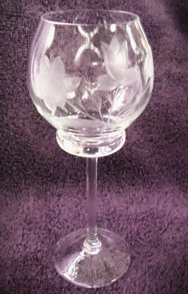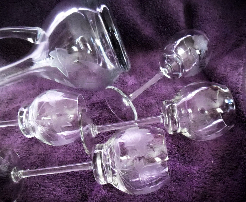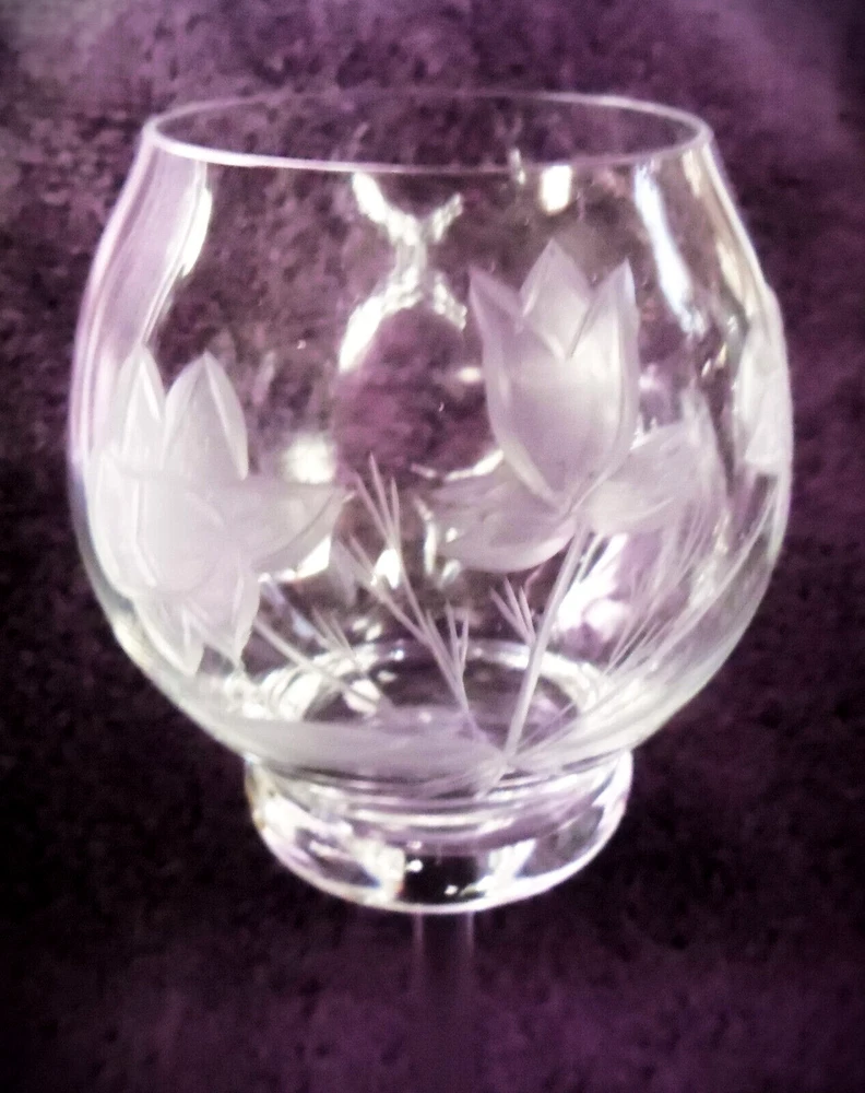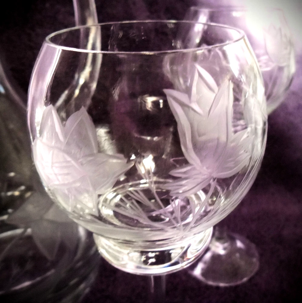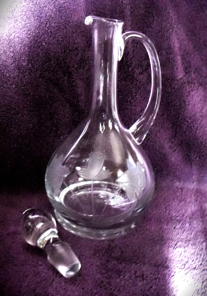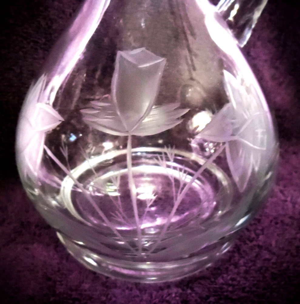 Vintage Blown Clear Cut Crystal Decanter Set with 4 Wine Glasses Daffodils 18" T Lovely hand cut Daffodil Pattern. Well taken care of no chips cracks or repairs. Approximate measurements Decanter 18" Tall With Stopper Glasses 8" tall