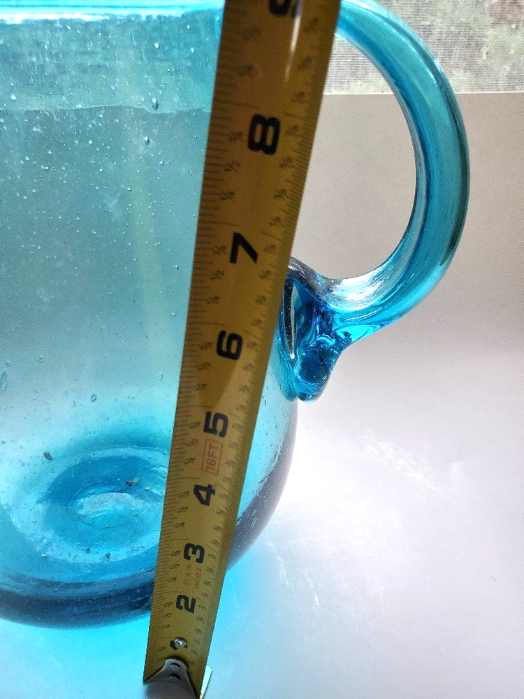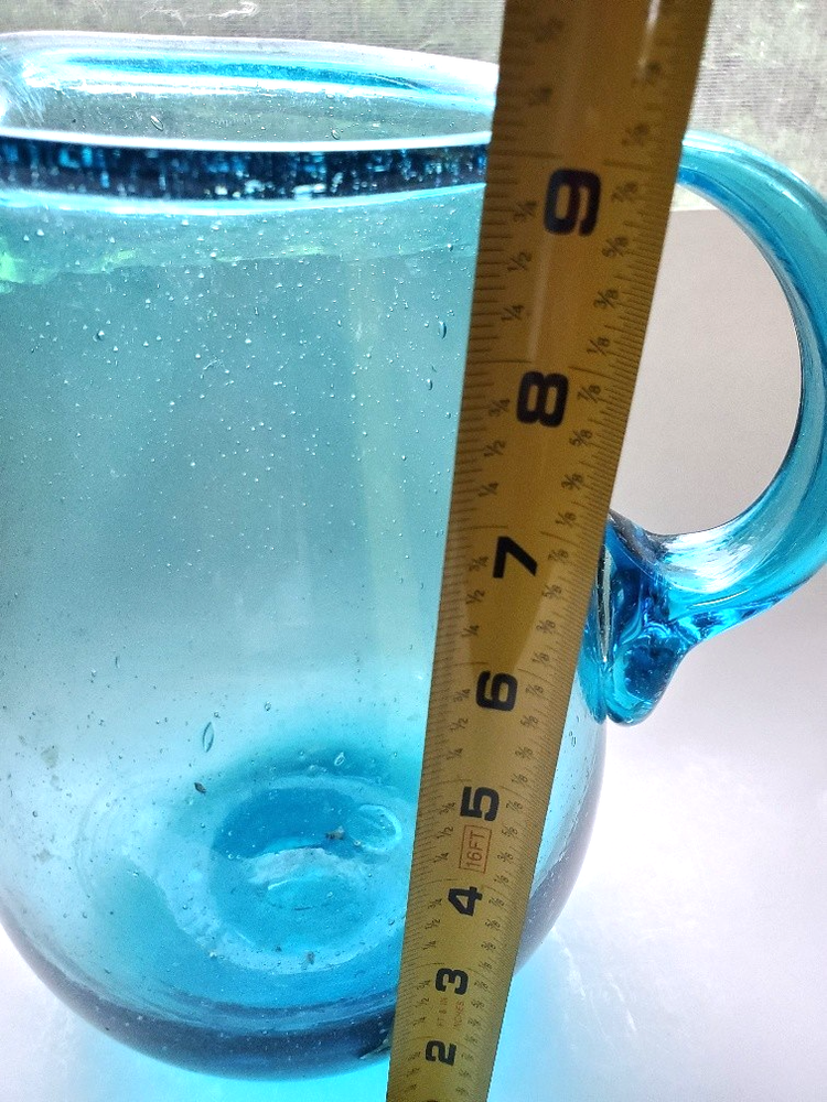 Large Hand blown Pitcher circa 1960 Excellent condition no nicks or chips Many bubbles imbedded in the glass due to the hand blown technique Features 1 handle with a generous lip Smooth glossy finish This beautiful pitcher will look great on your counter or would make a very special gift Ships same day or the following day the post office is open