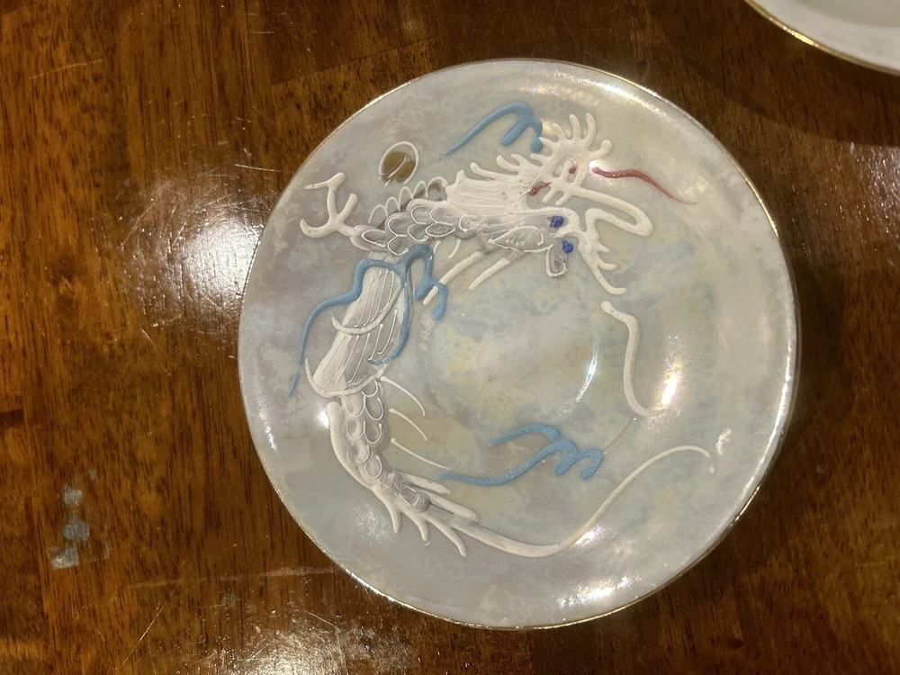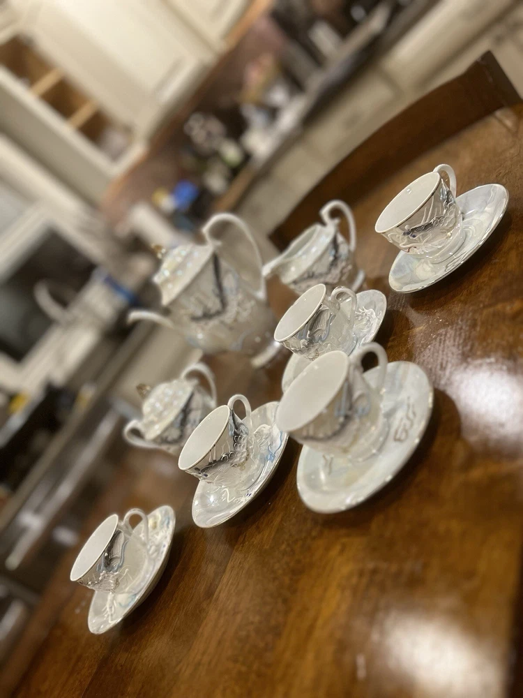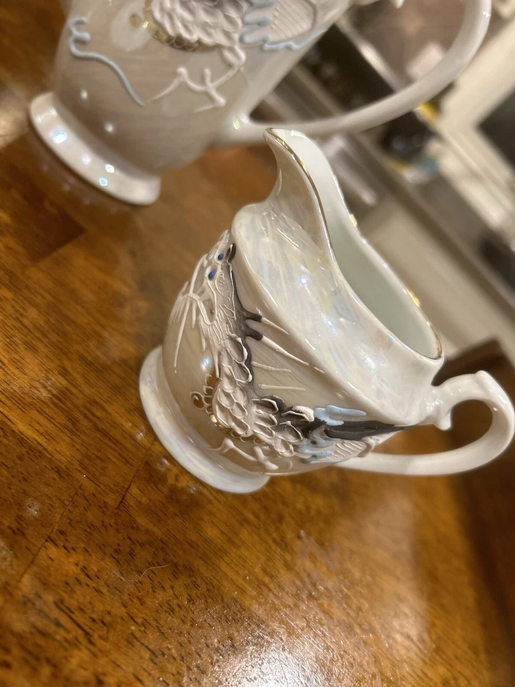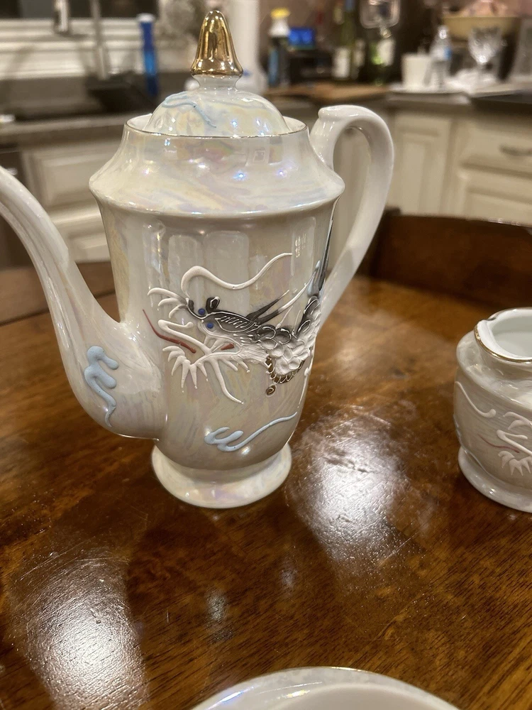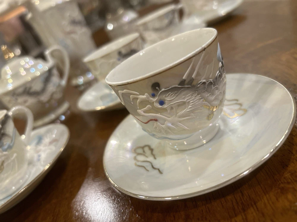 This vintage tea set is a beautiful addition to any collection. Made in Japan with intricate details, it is a true representation of Japanese culture. The set includes a teapot, creamer, sugar bowl, and six cups and saucers, all adorned with a majestic dragon design. The provenance of this set is not available, but it is certain to impress any collector or tea enthusiast. Perfect for entertaining guests or displaying in your home, this Moriage Dragon Ware tea set is a must-have for anyone who appreciates Japanese art and design.