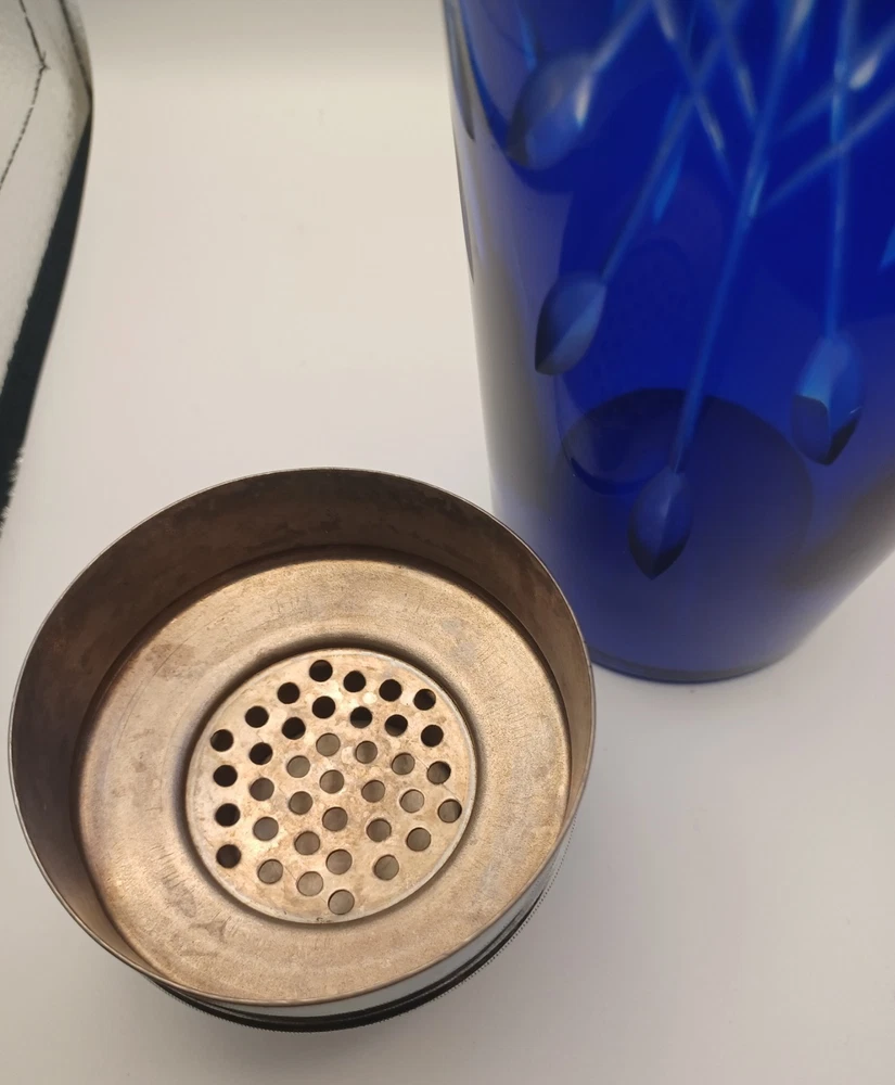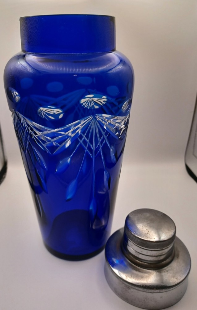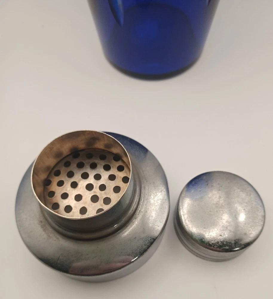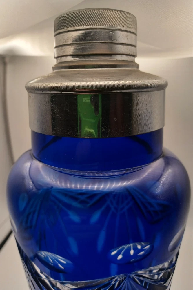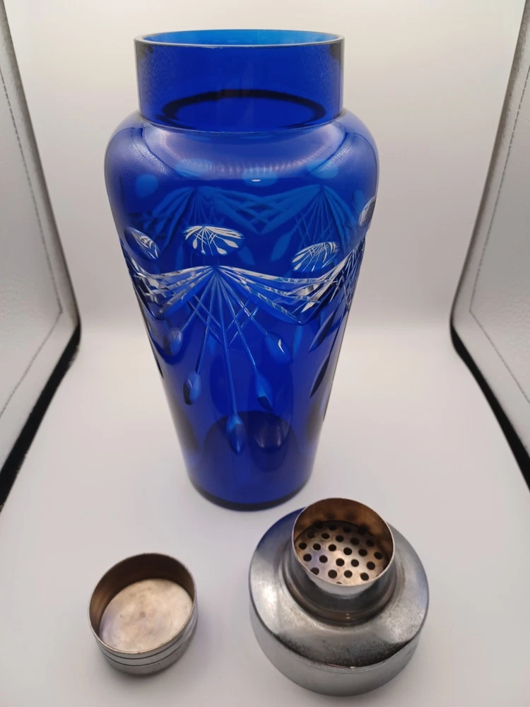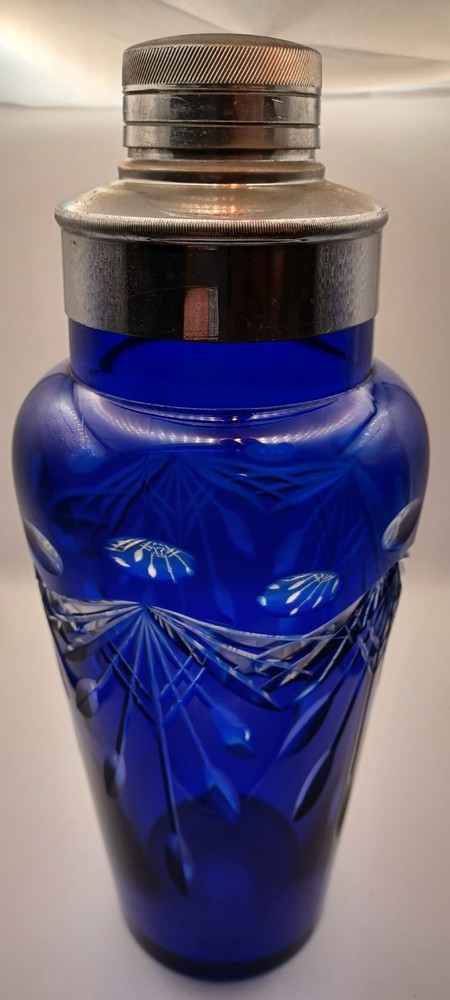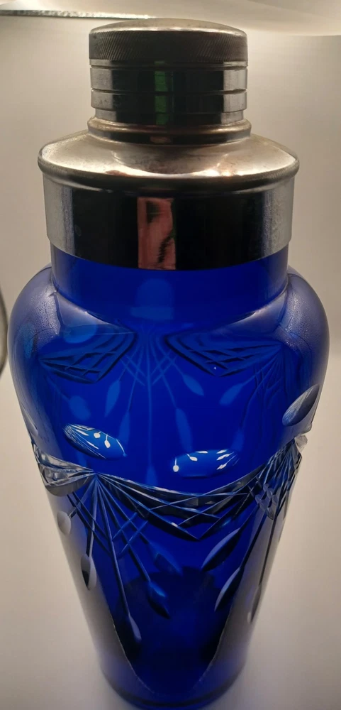 This Vintage Bohemian Cobalt Blue Cocktail Shaker with original chrome topper is a unique and collectible piece from the 1920-1949 time period. The piece is marked "Japan". The height of this hand blown shaker is 9 inches to top of glass and 11 inches with topper on. Some bubbles and marks on glass, and clear spot on bottom, generated during creation process. Some aging of chrome topper and very minor marks from years of use. No cracks or chips. Very nice. Only had 1 owner. See photos.