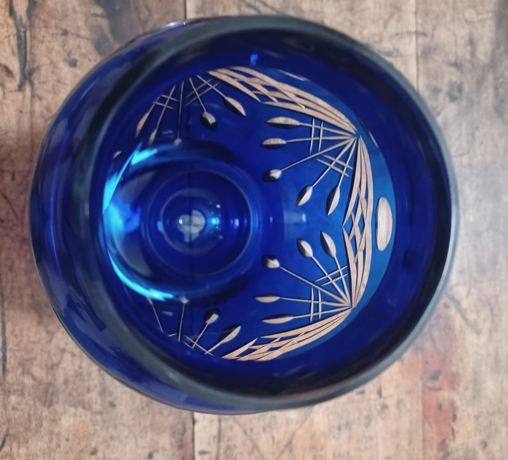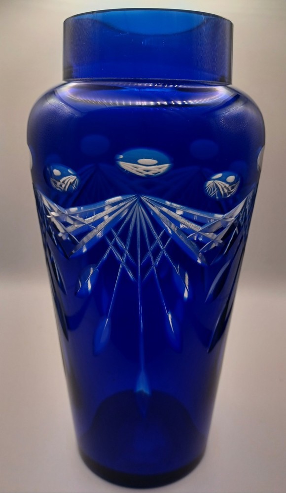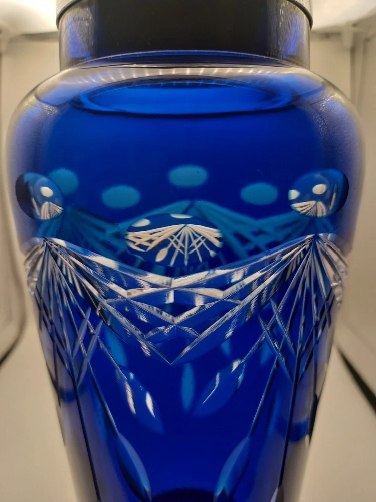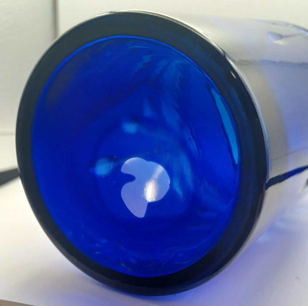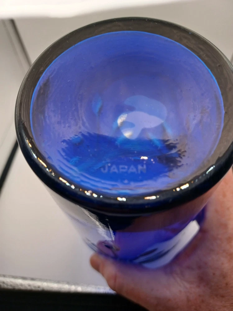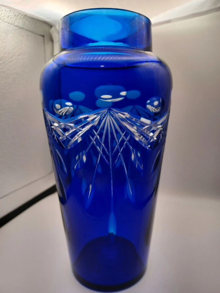This Vintage Bohemian Cobalt Blue Cocktail Shaker with original chrome topper is a unique and collectible piece from the 1920-1949 time period. The piece is marked "Japan". The height of this hand blown shaker is 9 inches to top of glass and 11 inches with topper on. Some bubbles and marks on glass, and clear spot on bottom, generated during creation process. Some aging of chrome topper and very minor marks from years of use. No cracks or chips. Very nice. Only had 1 owner. See photos.