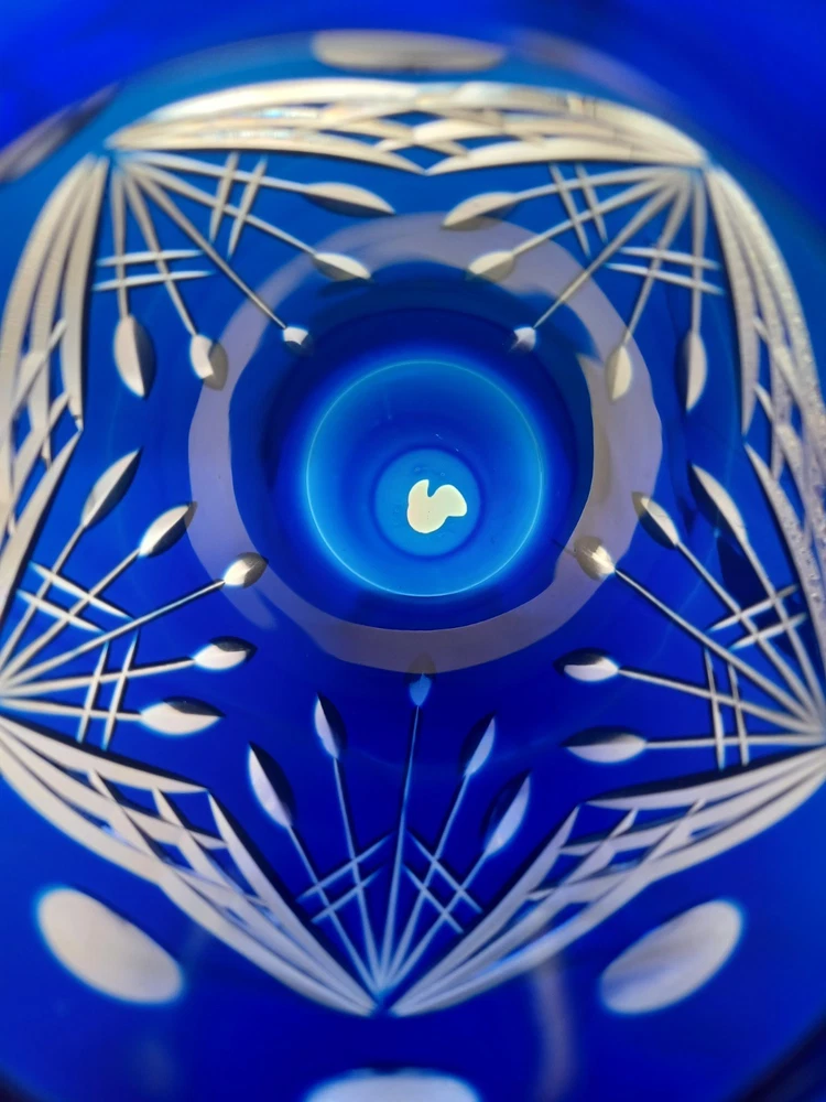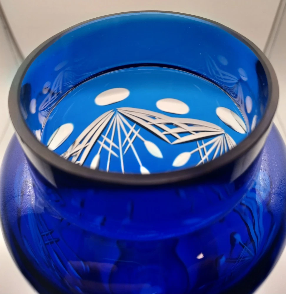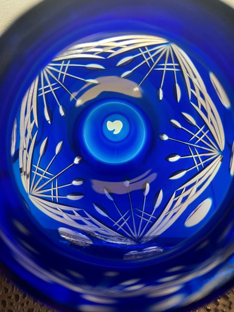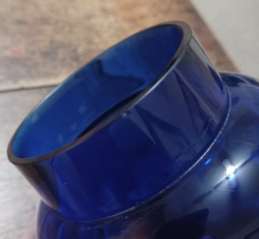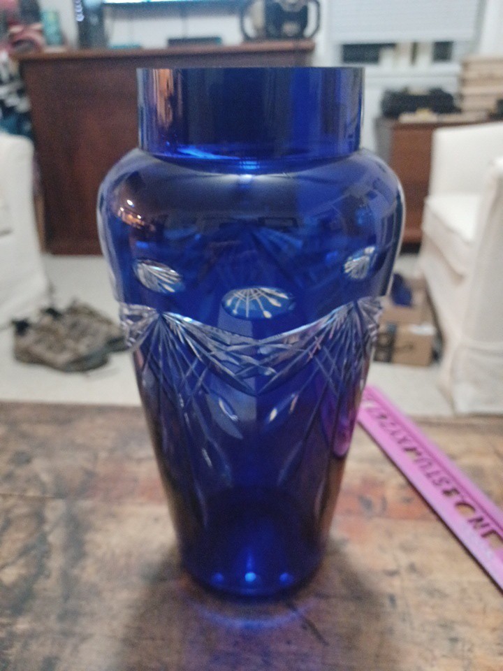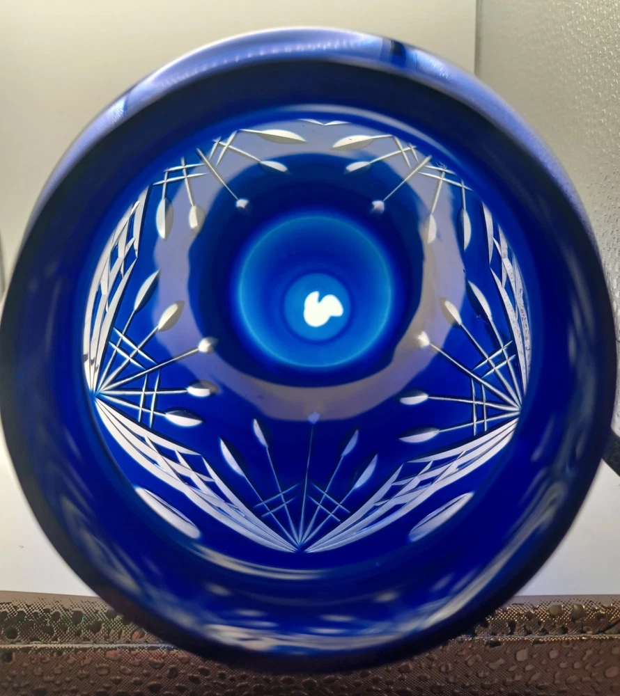 This Vintage Bohemian Cobalt Blue Cocktail Shaker with original chrome topper is a unique and collectible piece from the 1920-1949 time period. The piece is marked "Japan". The height of this hand blown shaker is 9 inches to top of glass and 11 inches with topper on. Some bubbles and marks on glass, and clear spot on bottom, generated during creation process. Some aging of chrome topper and very minor marks from years of use. No cracks or chips. Very nice. Only had 1 owner. See photos.