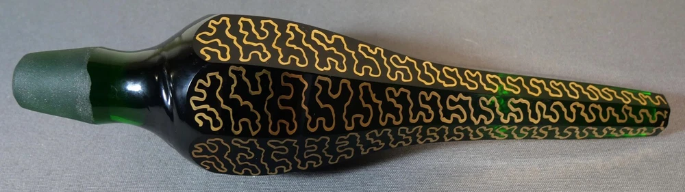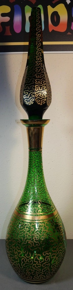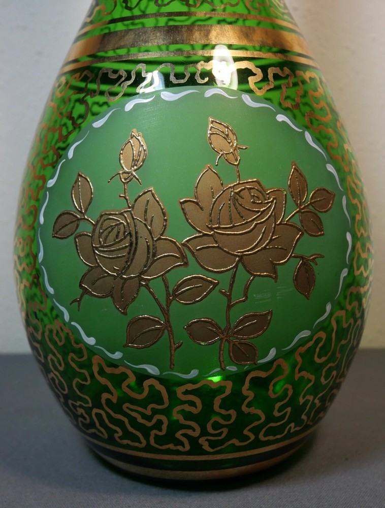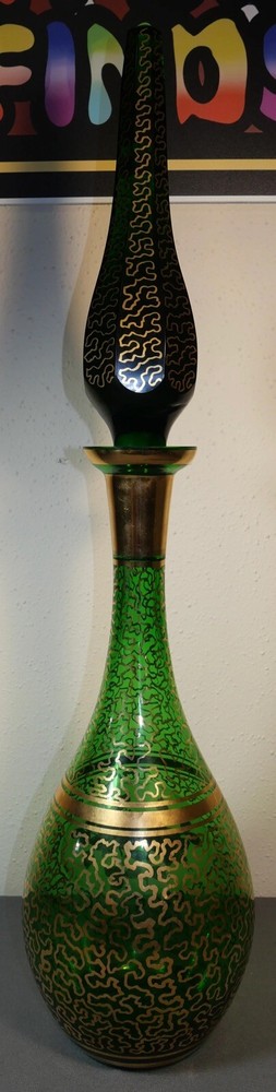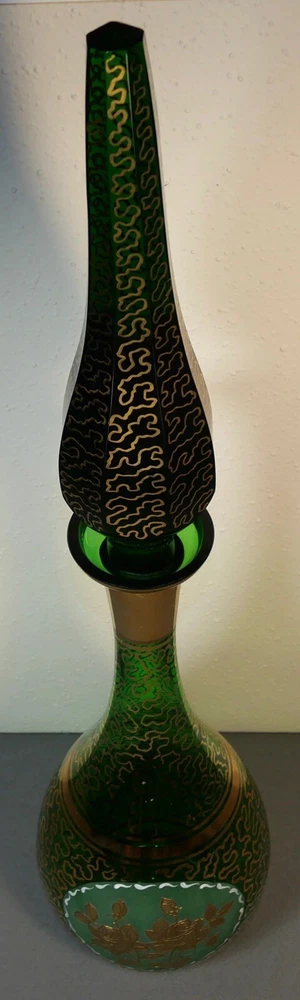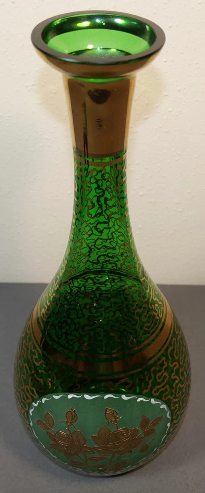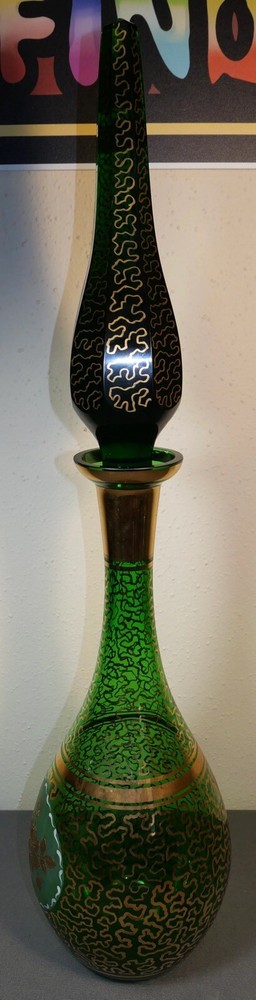 Up for sale is a Vintage Mid 20th Century Bohemian Emerald Green Glass Wurmlinien Decorated Roses Floral Motif Decanter with Large Faceted Pointed Stopper! It measures 24 3/4" tall with the stopper in the decanter. The decanter by itself measures 15" tall. The stopper by itself measures 11 1/2" long. The piece is in excellent overall condition with minimal signs of wear consistent with its age and use. Please message us if you have any questions. Thanks! This vintage mid 20th century Bohemian decanter exudes expert craftsmanship with its hand painted gold wurmlinien (worm lines) pattern and central roses motif. The oversized stopper adds a touch of elegance to this exquisite piece. Add a touch of European history and beauty to your home with this emerald green glass decanter.