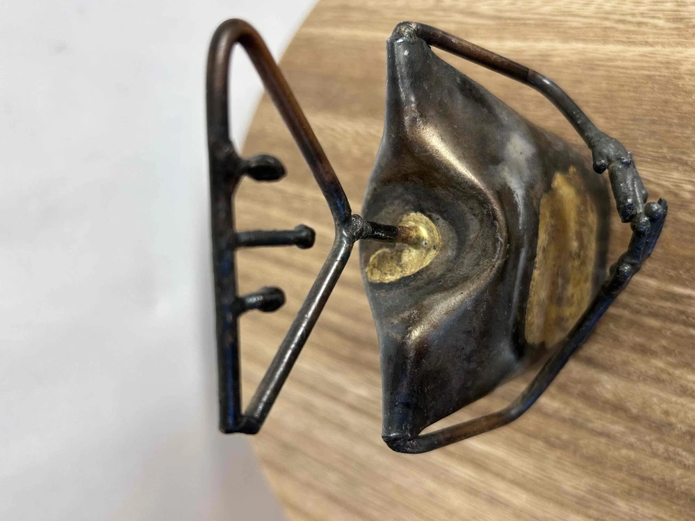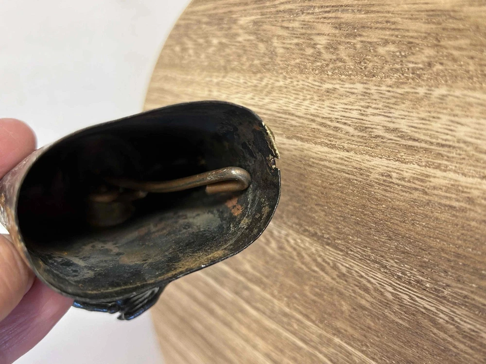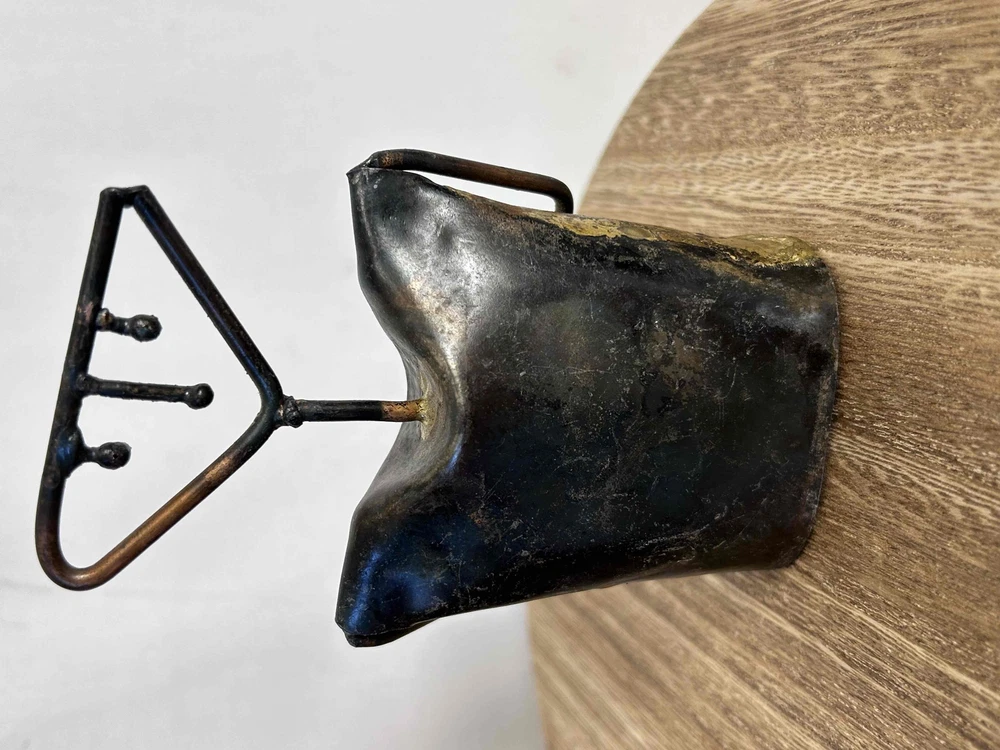 Vintage Brass Abstract Hanger Cowbell With Hands Decorative Sculpture Metallic Art Piece Brand: Type: Decorative item Style: Abstract Size: Color: Brass Material: Brass Condition: Good condition Features: Metallic, Fish-shaped, Vintage, Abstract design, Decorative, Sculptural