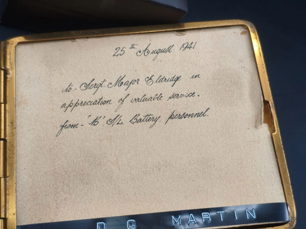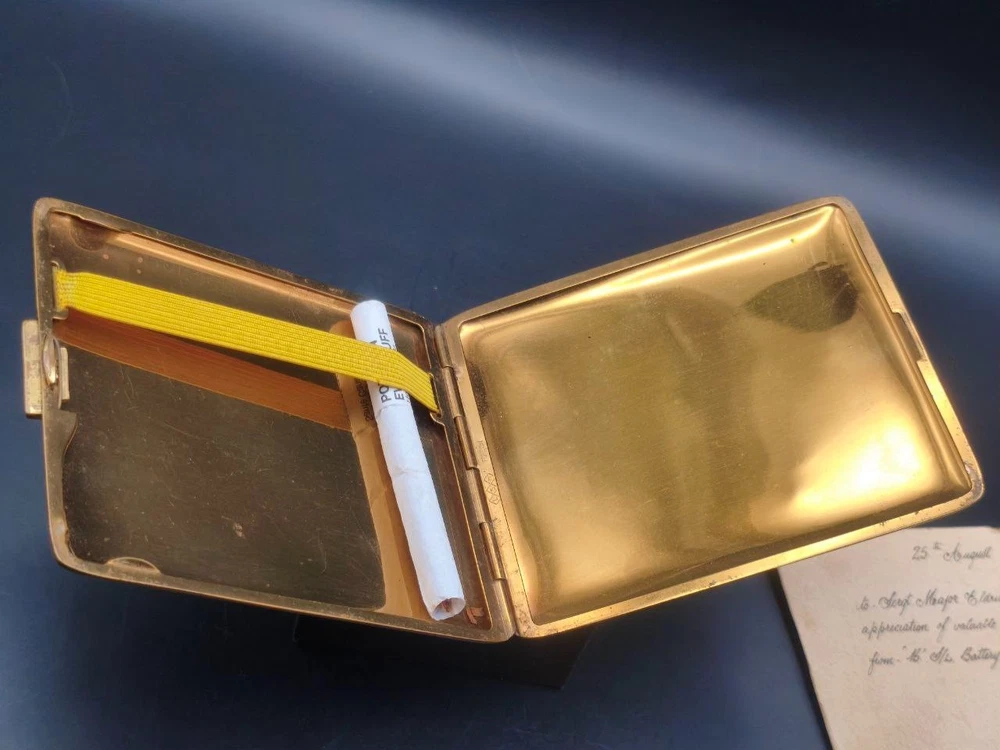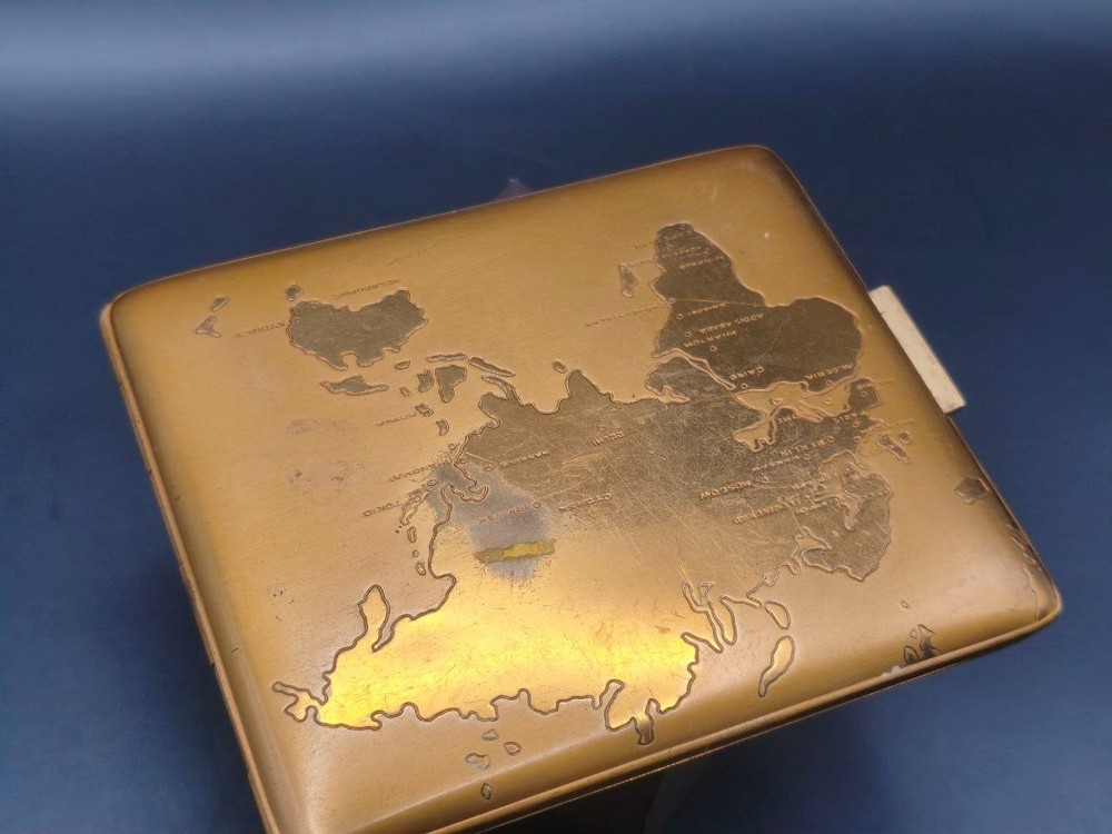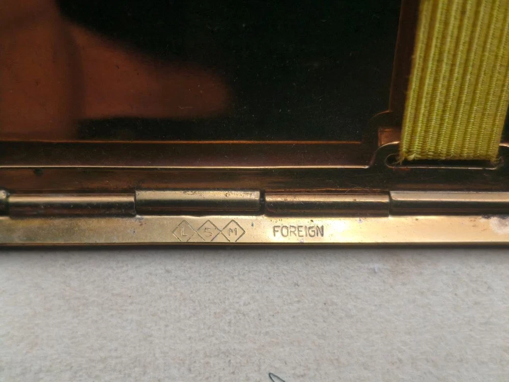 A stunning and historically rich vintage brass cigarette case featuring a detailed engraved world map on both sides. Manufactured by L.S. Mayer & Co. Ltd (Birmingham, England) — a renowned British maker active during the 1930s–1940s, known for high-quality brass and gilt smoking accessories. Inside, the case bears a remarkable wartime dedication dated 25th August 1941, reading: “To Sgt. Major Eldridge in appreciation of valuable service, from 15th A.A. Battery personnel.” A true collector’s piece with authentic provenance and character. ✅ Key Features: ✅ Original L.S.M. (L.S. Mayer & Co. Ltd) hallmark with “FOREIGN” export mark ✅ Engraved world map motif on both sides ✅ Dated 25th August 1941 – authentic wartime presentation ✅ Inner fabric strap (original, yellow) intact and functional ✅ Made in Birmingham, England ✅ Clasp and hinge work perfectly – opens and closes smoothly ✅ Preserved in original, unpolished condition to maintain its patina and historical authenticity ⚙️ Condition: Good vintage condition with visible wear, scratches, and age patina consistent with an 80-year-old piece. The map engraving remains clear and well-defined. 📏 Size: 9.5 × 8.1 × 1.2 cm (3.73″ × 3.18″ × 0.47″) ⚖️ Weight: approx. 130 g (0.29 lb) A unique collector’s item combining wartime history, craftsmanship, and artistry — perfect for collectors of vintage tobacciana, military memorabilia, or early 20th-century design. ✅ Shipping to the USA — all import duties & taxes are fully covered by us. You won’t need to pay anything extra upon delivery.