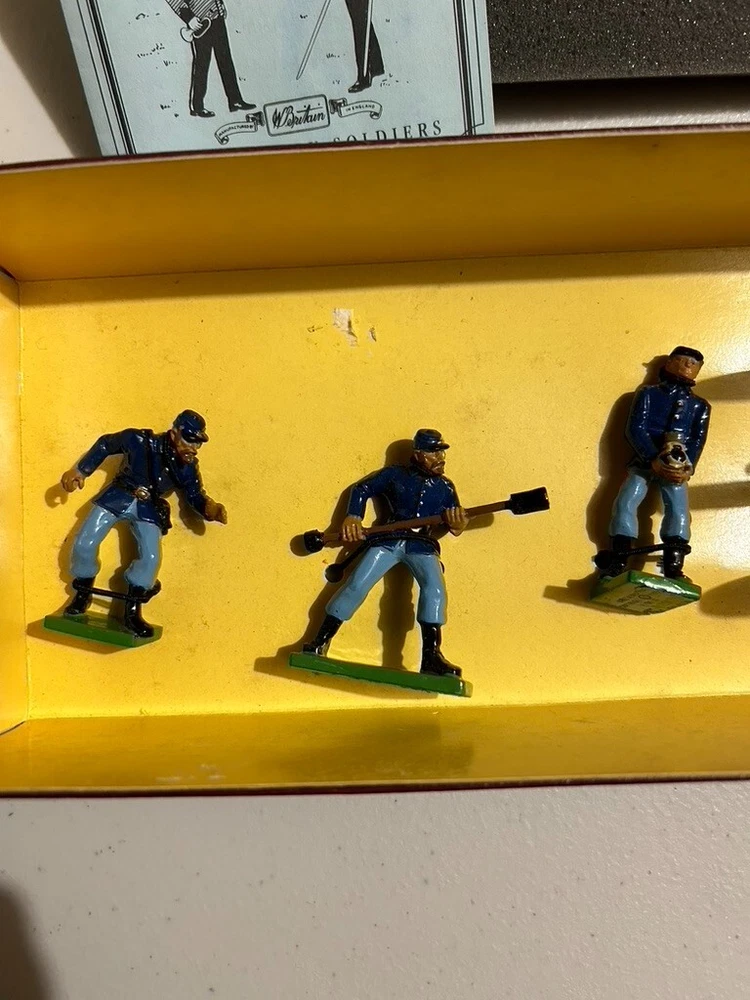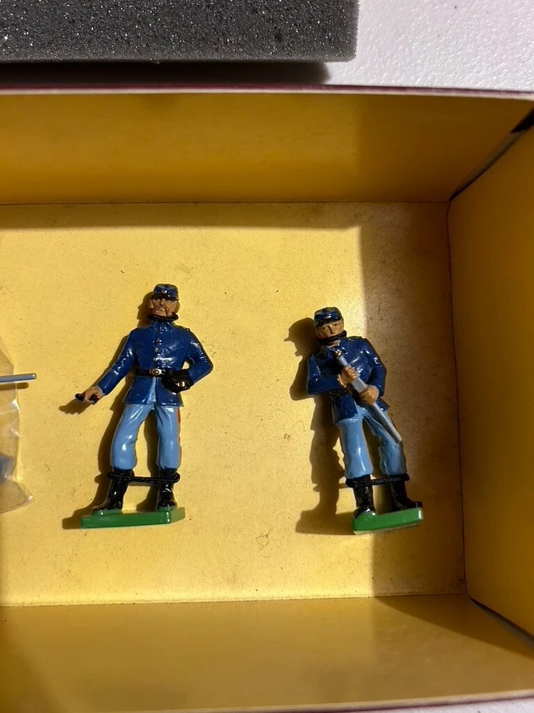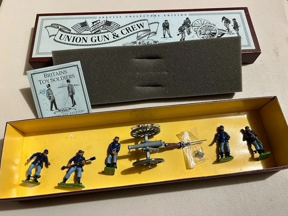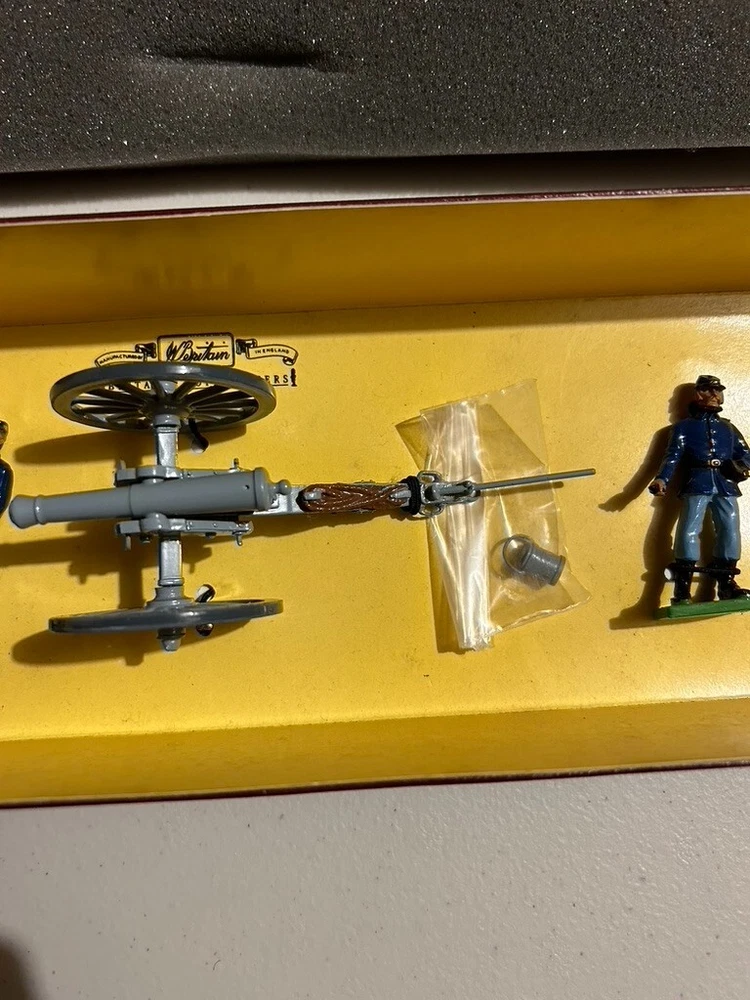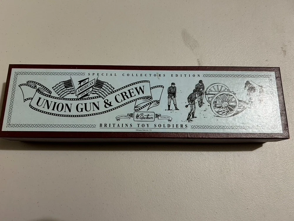 Step back in time with the Vintage Britains American Civil War Union Gun & Crew Set #8875, a remarkable representation of historical warfare. Crafted with meticulous attention to detail, this set features metal soldiers, capturing the essence of the Artillery type in full Civil War attire. The piece hails from 1995, boasting a rich legacy that adds to its collectible value.Proudly made in the United Kingdom, this set is a testament to the Britains brand's commitment to quality. It comes in its original mint box, ensuring it remains pristine for collectors and enthusiasts. A perfect addition to any collection, this set represents a significant moment in history and is a tribute to the soldiers of the era.