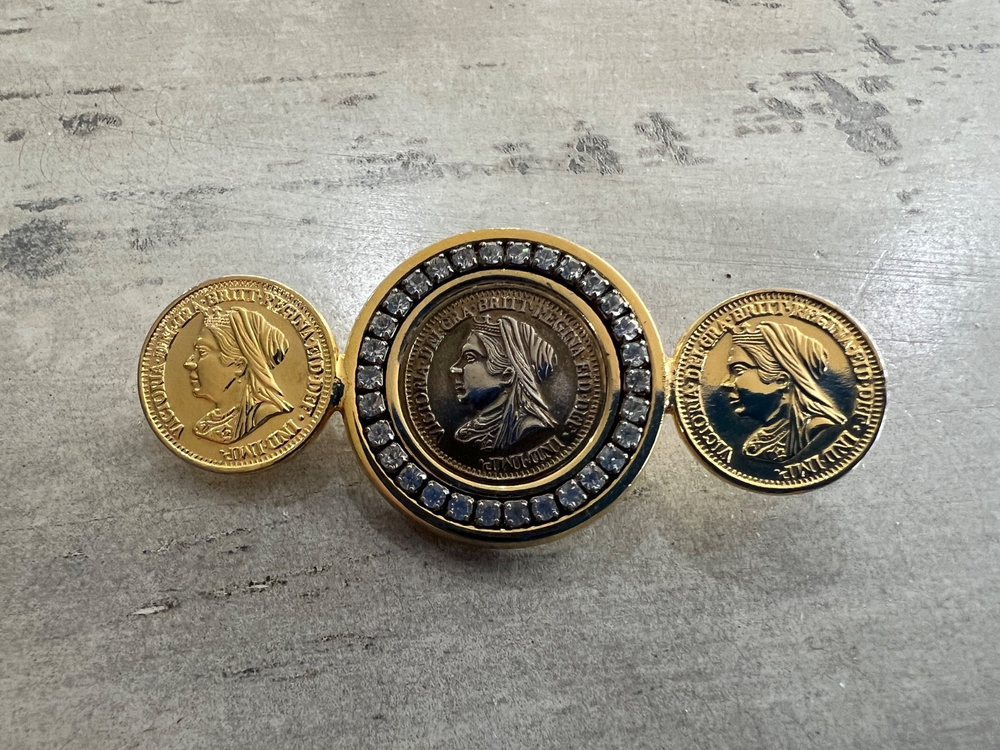 The Vintage British Faux Coin Pin Brooch is a charming accessory that adds a touch of nostalgia to any outfit. Made to mimic the appearance of a coin, this brooch captures the essence of vintage British design. The faux coin design adds a unique and timeless element to this piece of jewelry, making it a versatile and stylish addition to any collection.