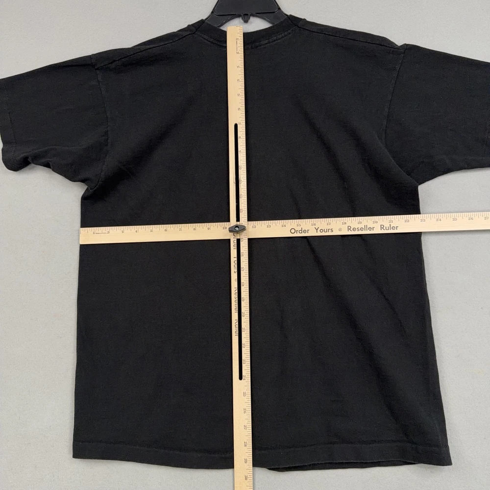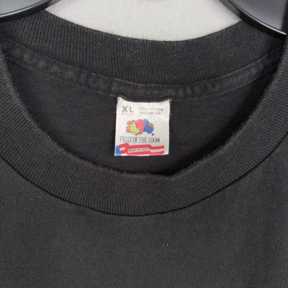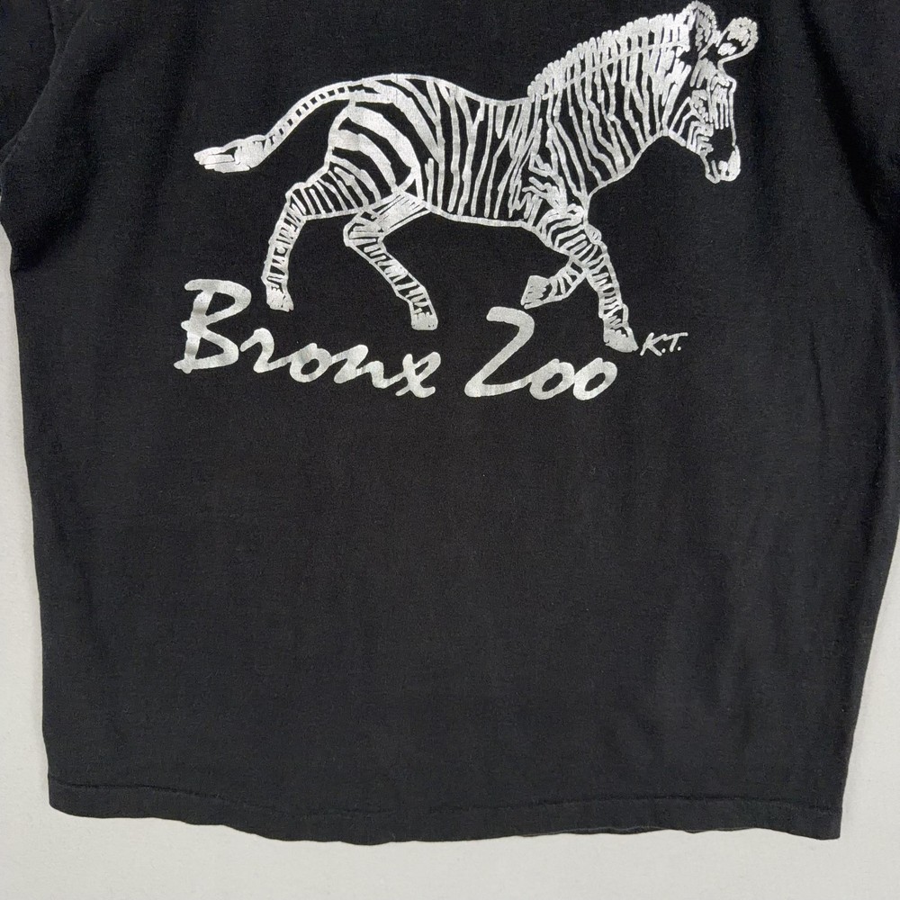 Vintage Bronx Zoo Shirt Mens XL Black Zebra Graphic Fruit Loom USA 90s Previously worn Bronx Zoo graphic tee with normal wash and fade to black fabric. Front zebra graphic shows light wear from laundering but remains clear and legible. No obvious holes, tears, or major stains visible in the photos. Brand: Fruit of the Loom Subject: Bronx Zoo zebra graphic souvenir shirt with large front print reading "Bronx Zoo" and signed "K.T." Color: Black shirt with silver/white zebra illustration and script text; back is solid black with no graphics. Size on tag: XL Adult. Material: 100% cotton preshrunk (per tag). Made in USA. Details: Short sleeve crewneck shirt with ribbed collar, straight hem, and classic unisex fit. Features iconic Fruit of the Loom woven neck tag and bold single front graphic. 22916 Measurements: - Previous washings may change the sizing written on the tag. - Please refer to the photos above for all measurements. - Please compare our measurements to that of one of your favorite garments. - Please note, item measurements are approximate . All items are bagged and sealed after being photographed, then stored in a smoke free environment to ensure the item is exactly the same as when photographed. All items have been washed per eBay standards & policies. I carefully package and ship daily. Feel free to contact me with any questions.