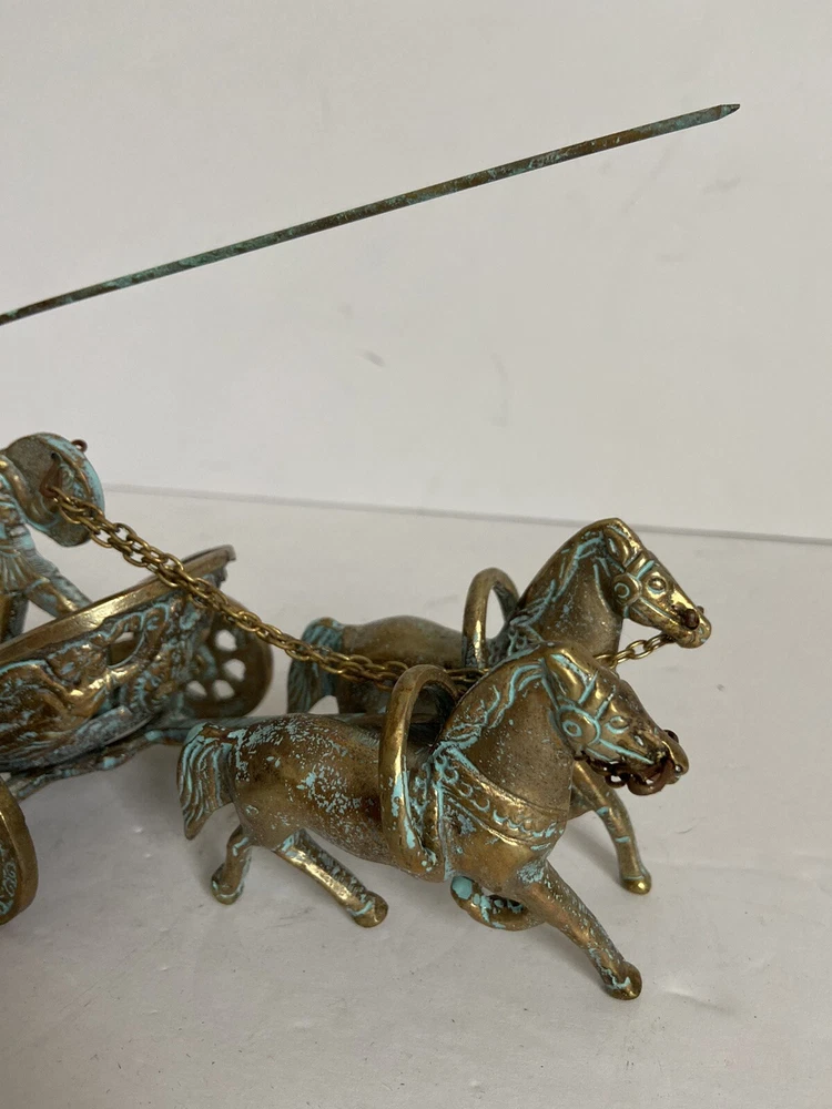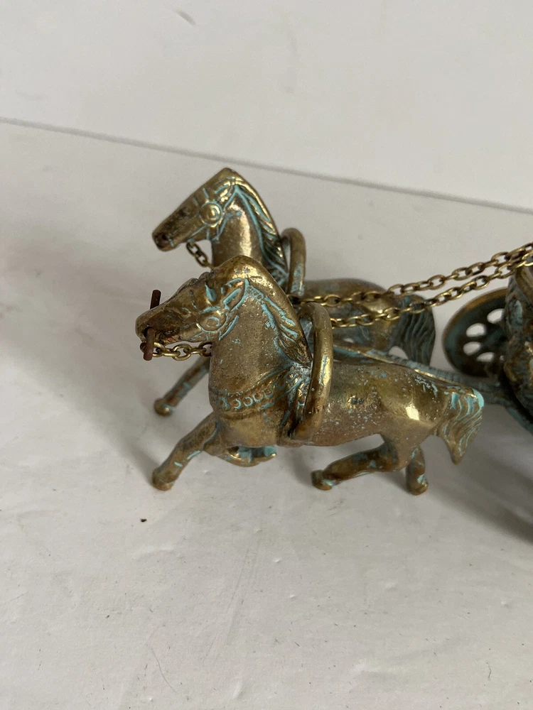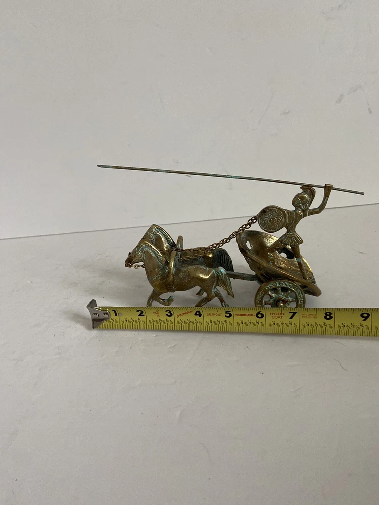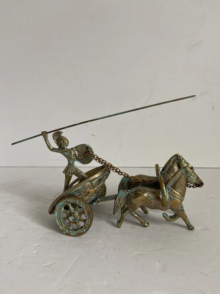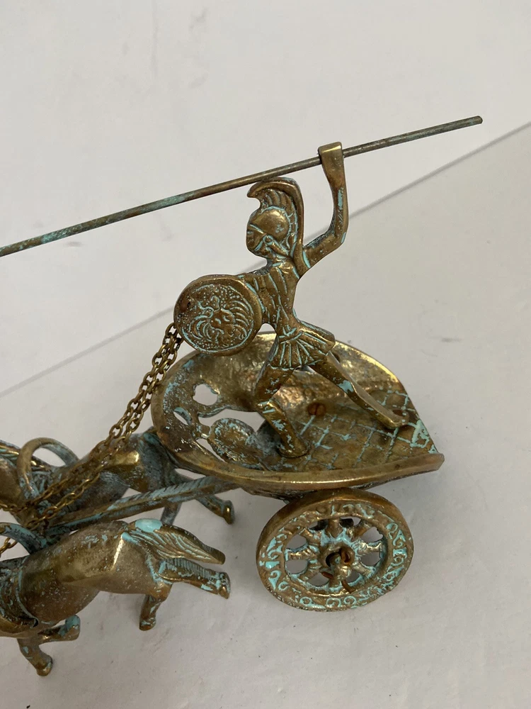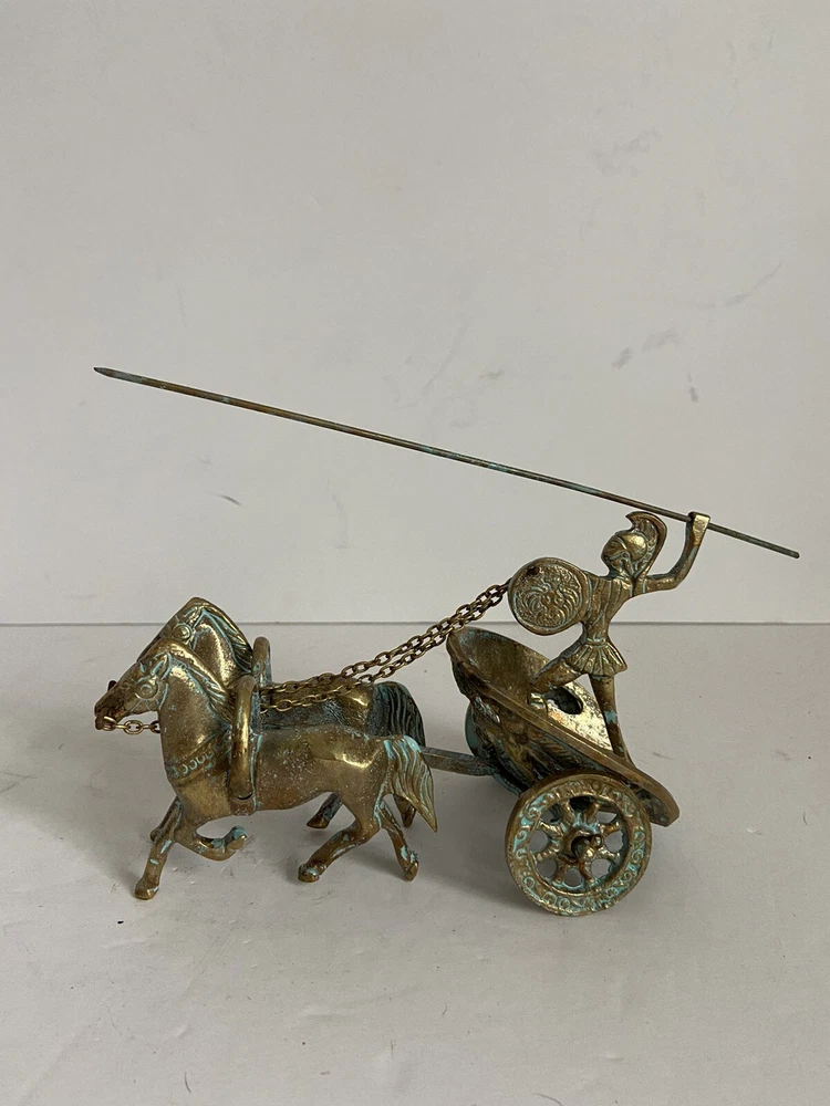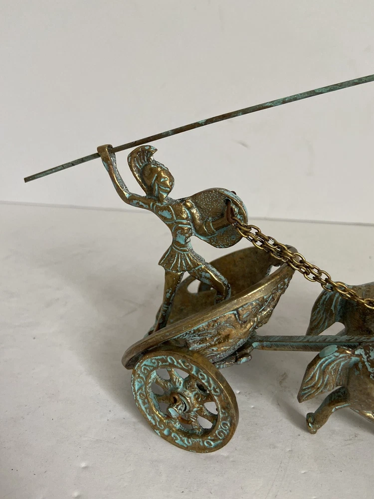 This vintage bronze statue depicts Achilles on a horse-drawn war chariot, a scene from Homer's Iliad. The statue is a beautiful work of art showcasing the skill of the bronze casting technique. The sculpture is perfect for art enthusiasts, especially those interested in Greek mythology. The statue is made of bronze, a durable material, and is perfect for display in any setting. The sculpture has a 3D style and is a great addition to any collection. Shipping: Items ship next day (except on Sundays) in premium packaging to ensure the utmost care for your purchase. Questions or Offers?: Feel free to message or make an offer. Preowned Vintage Condition: As this item is preowned and vintage, it has a history and character that set it apart. Vintage items may exhibit unique wear and minor perfections, which add to their charm. I’ve done my best to showcase the item's vintage conditiong through descriptions and photos, so please review them thoroughly before buying and reach out with any question.
