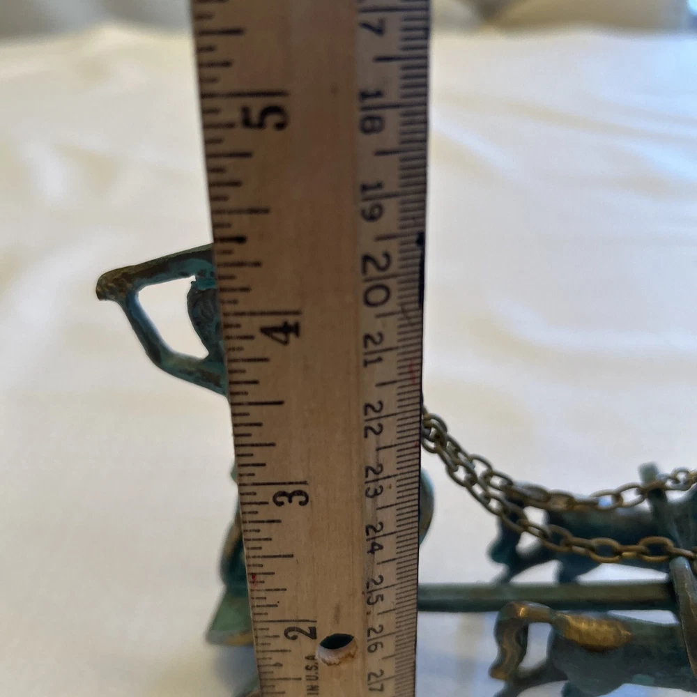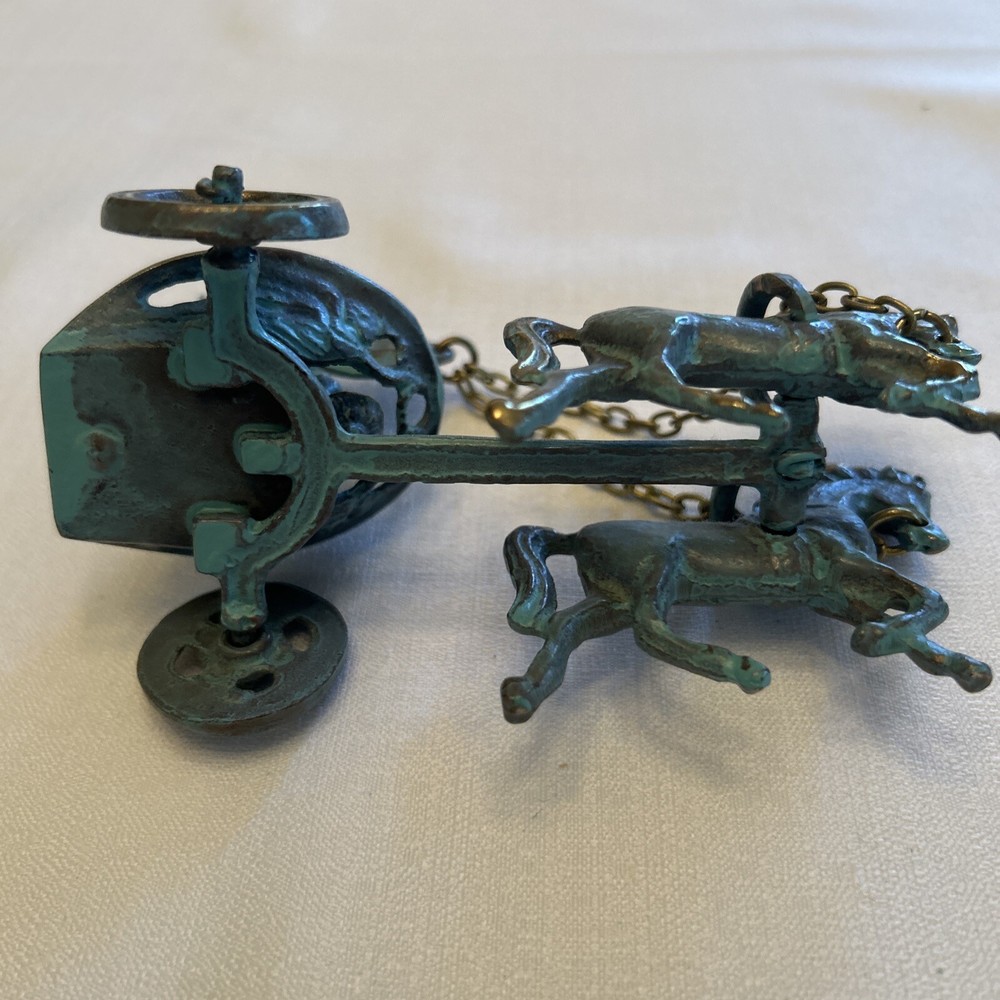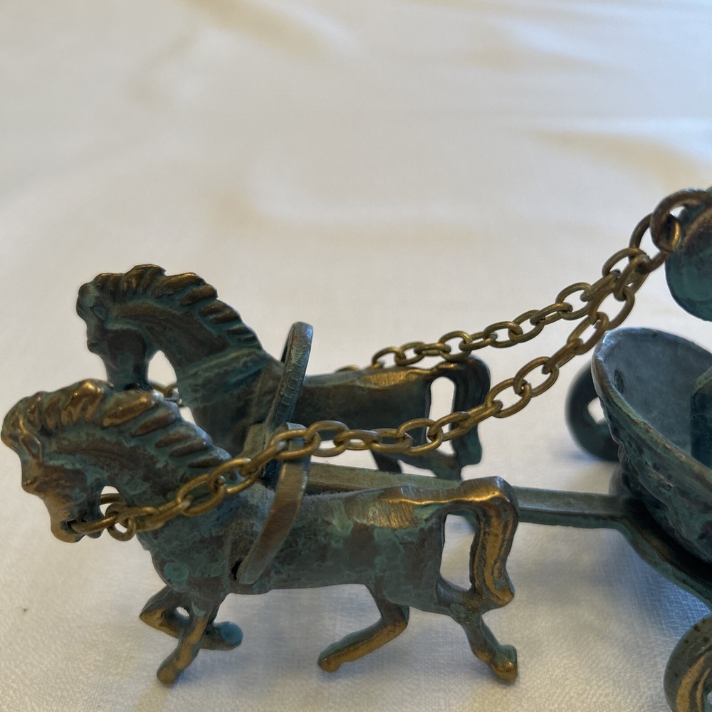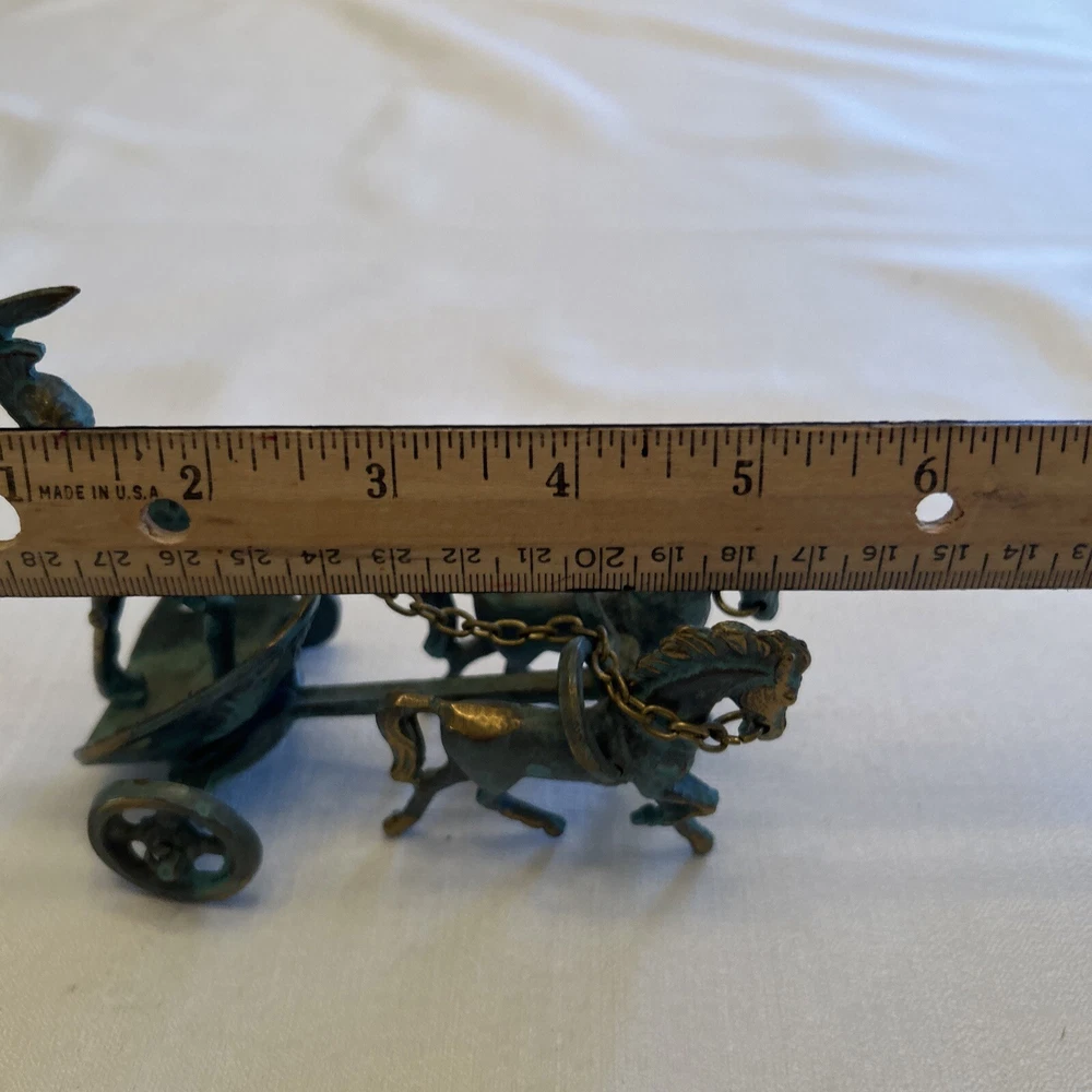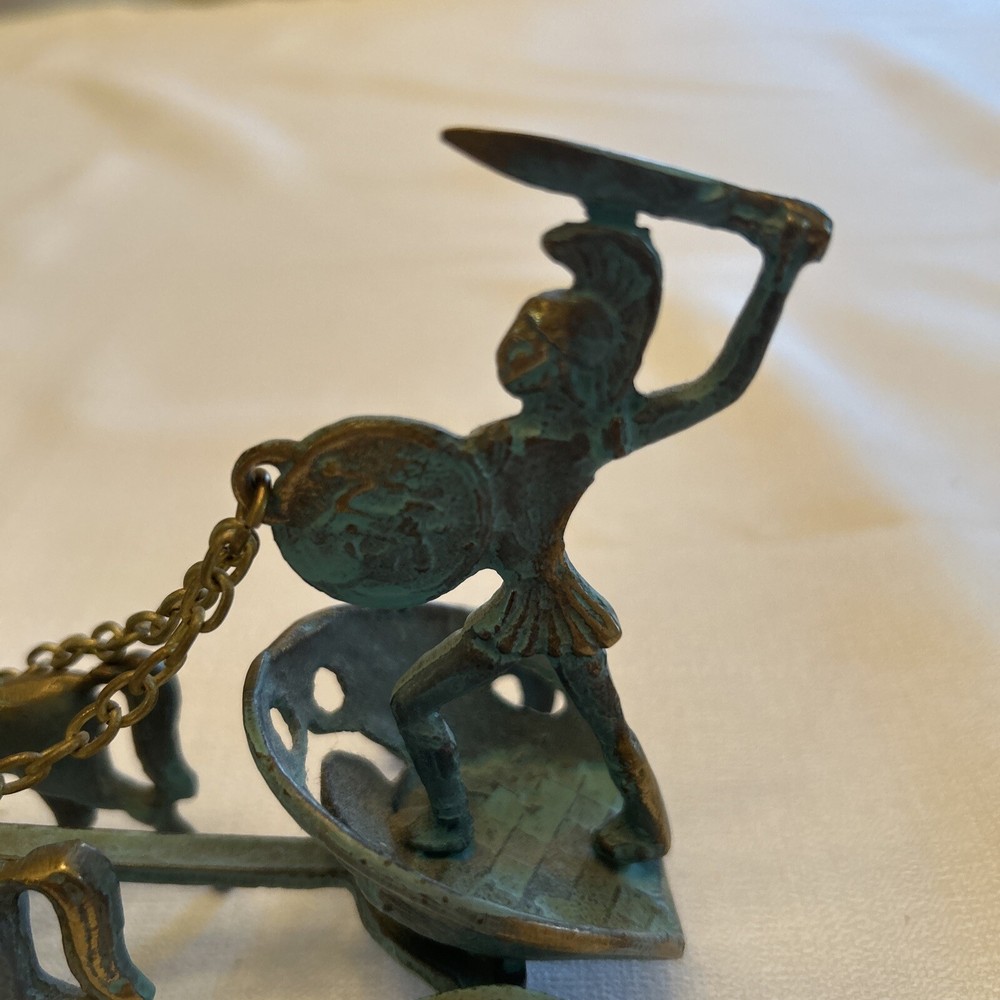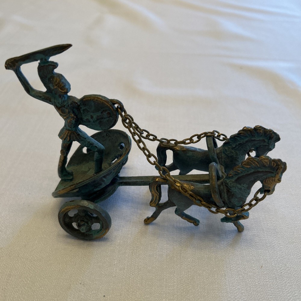 Capture a piece of ancient lore with this Vintage Bronze Achilles on Horse Drawn War Chariot sculpture. A true homage to Greek Mythology, this statue exemplifies the epic tale of the Iliad with its intricate detailing and classic design. Crafted through skilled bronze casting, the sculpture stands as a testament to the timeless stories of Homer's heroes. The sculpture merges a 3D style that brings the mythological scene to life, complete with the majestic prowess of Achilles. It's an ideal piece for collectors and enthusiasts of art and mythology alike, adding a touch of grandeur to any collection or display. Embrace the rich culture of Greece with this exquisite piece of history.