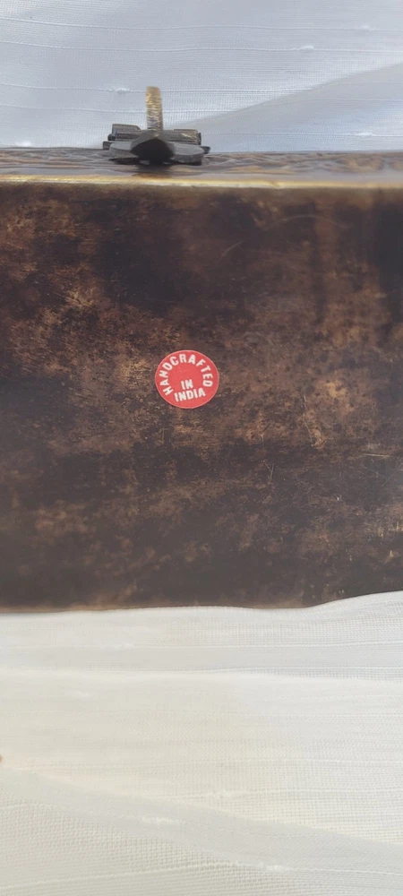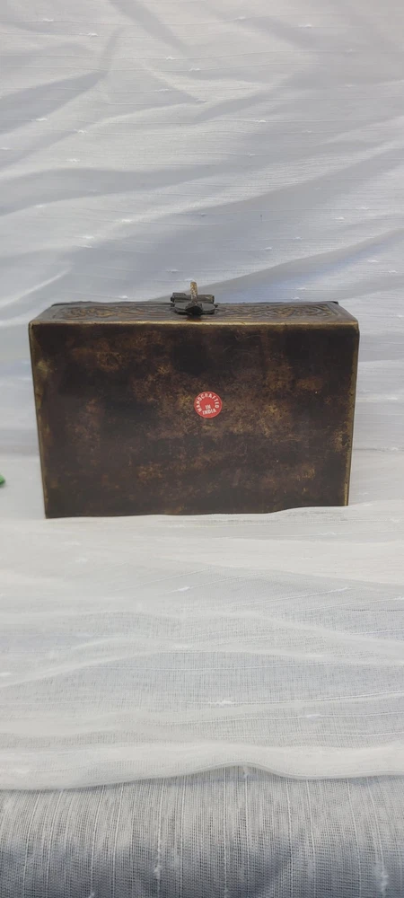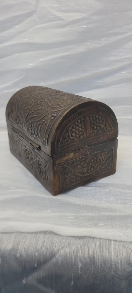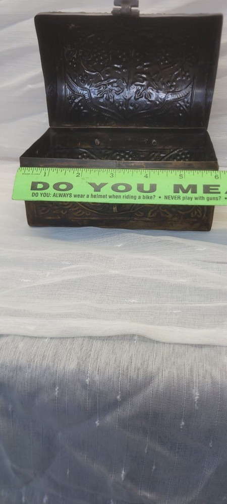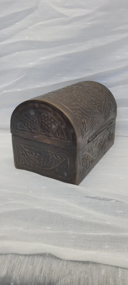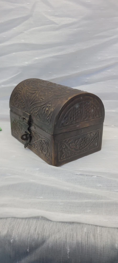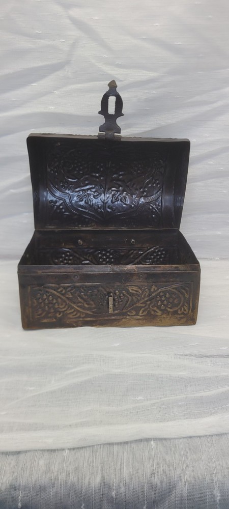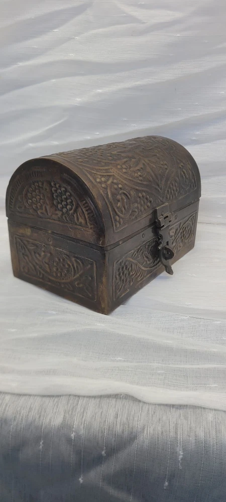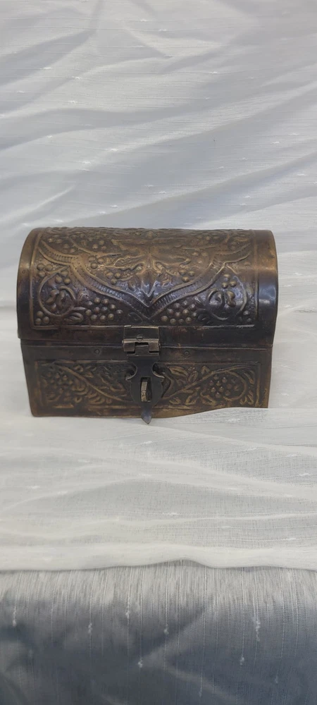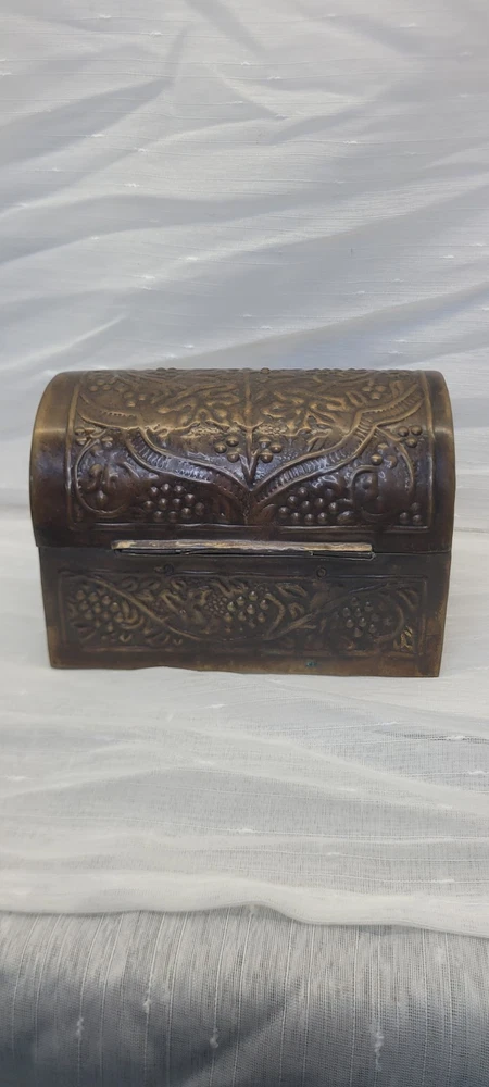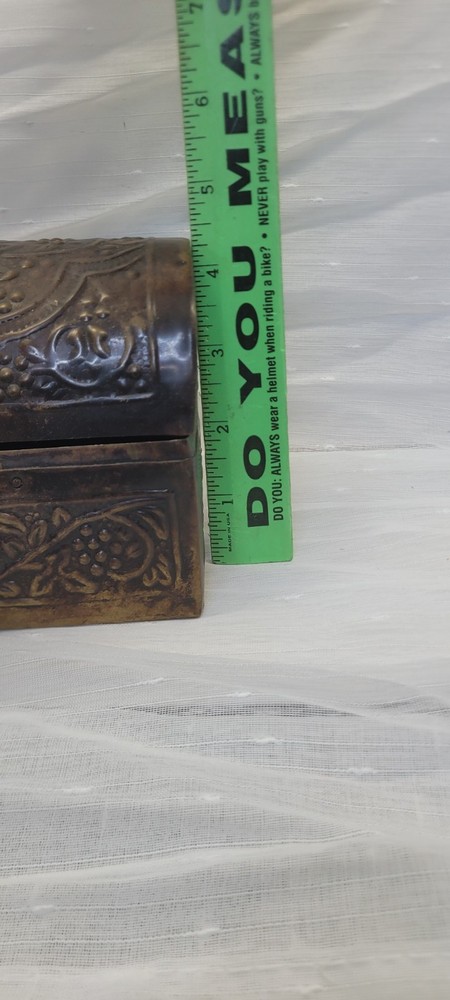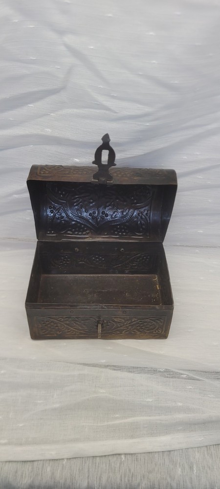 This vintage treasure chest trinket jewelry box is made of brushed bronze metal with an embossed floral design. It has a hinged latch closure and a domed shape. Handcrafted in India in the late 20th century, this medium-sized box measures 6 inches in length and 4.5 inches in height. It features a medieval style, making it a unique keepsake box perfect for all occasions.