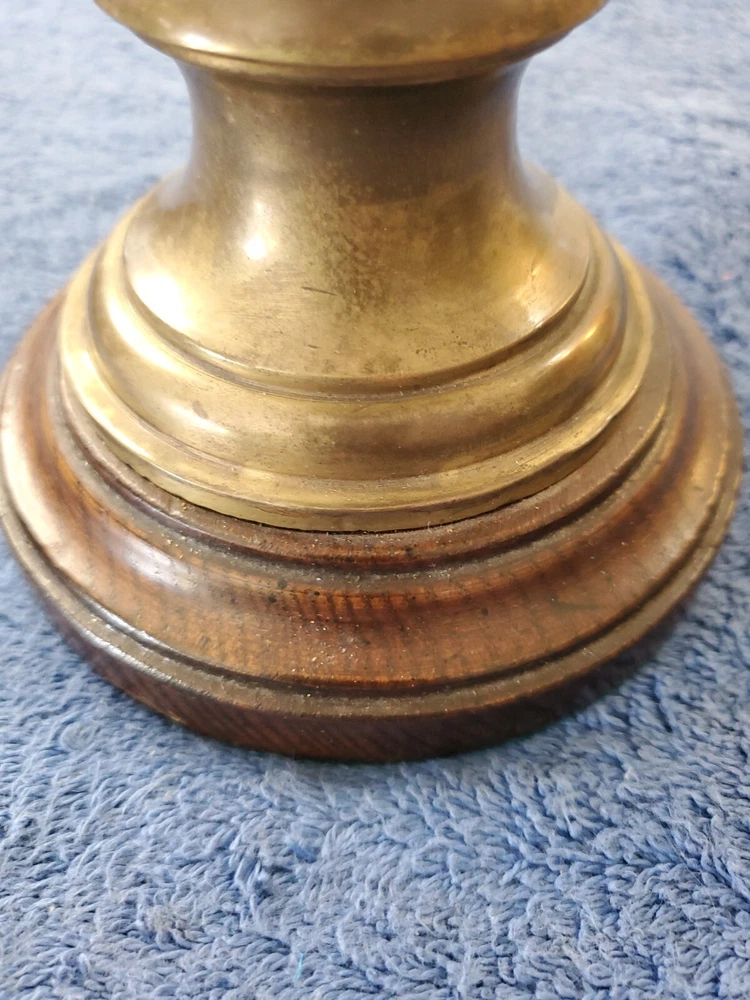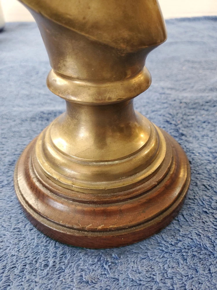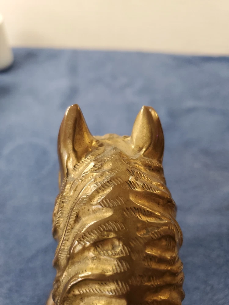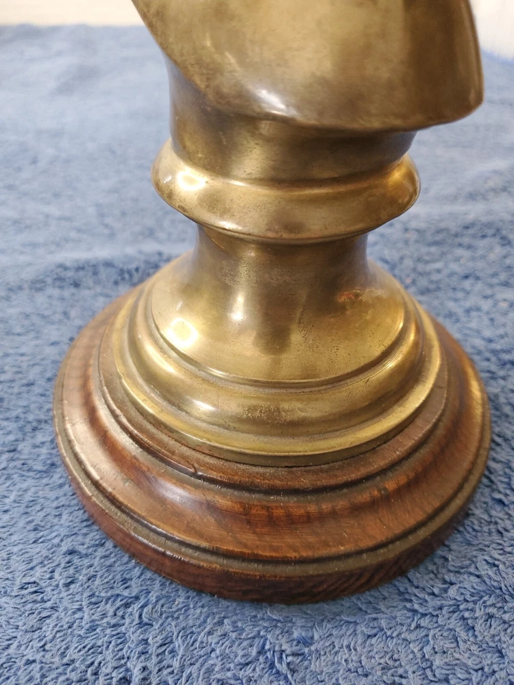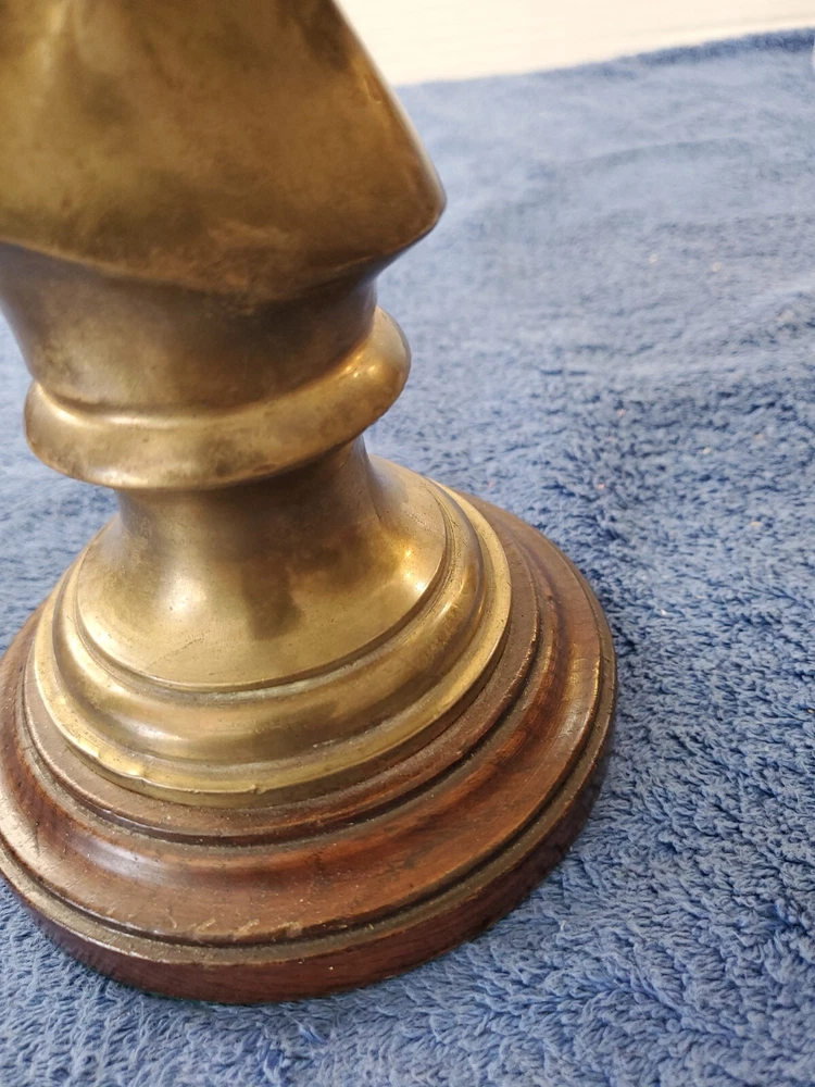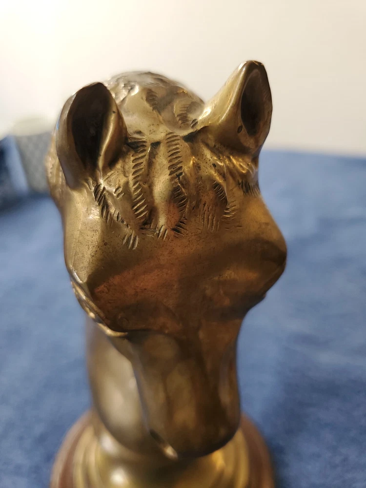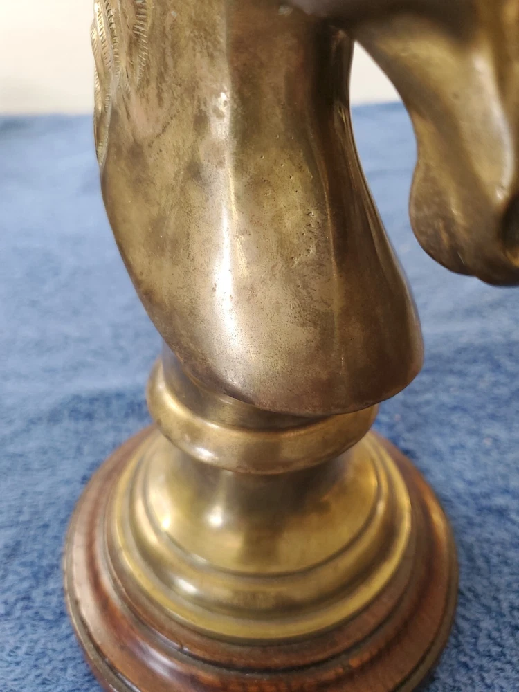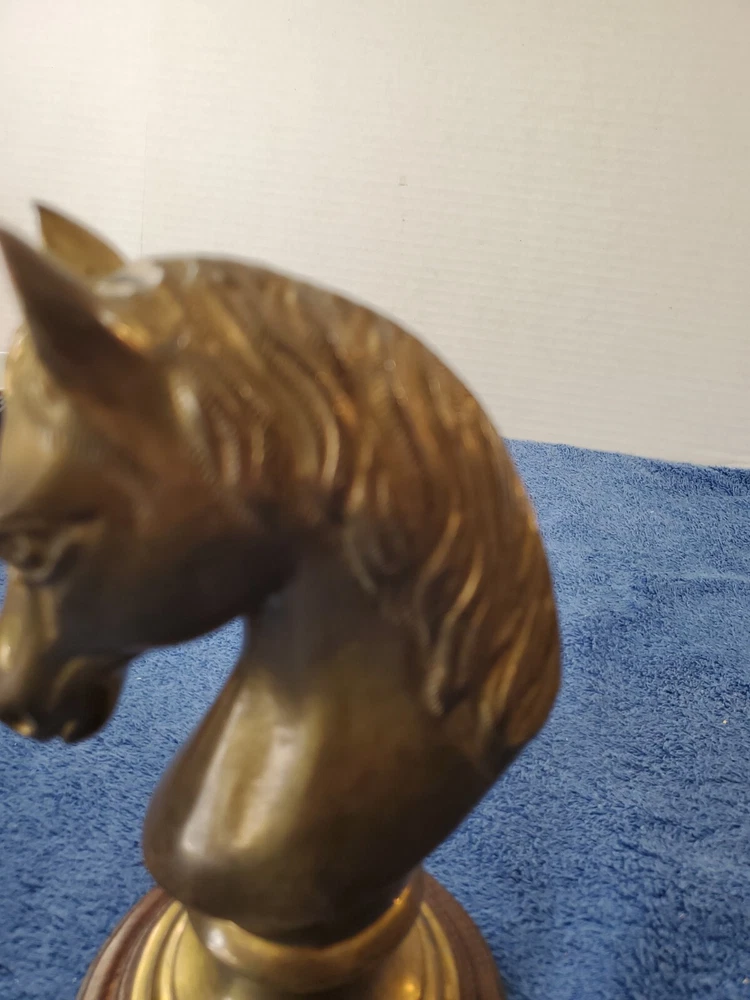 Vintage Bronze look Finish Horse Head Sculpture Bookend on Wooden base. 9 in tall with a 5" round wooden base. Very heavy and very old.