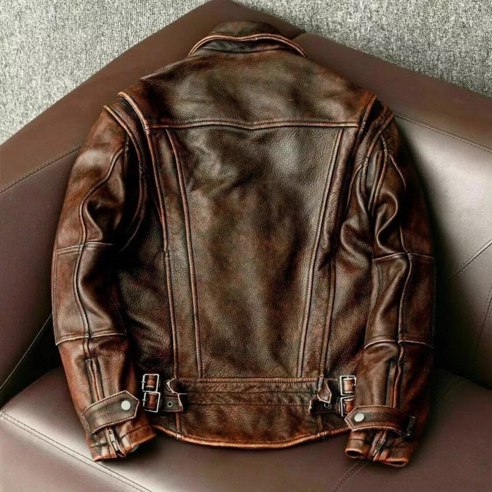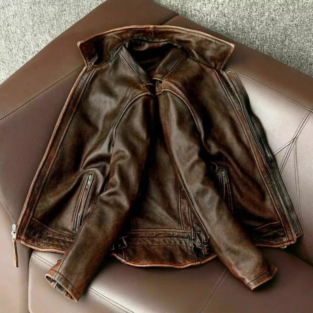 🏍️ VINTAGE CAFE RACER JACKET – MEN'S DISTRESSED BROWN LEATHER BIKER MOTORCYCLE COAT Rugged Road Style, Classic Racer Design This vintage cafe racer jacket is built for the modern man with a taste for retro flair. Made from 100% genuine distressed brown leather , it features a streamlined silhouette inspired by classic motorcycle and biker jackets . Whether you're riding or just out for a bold street look, this men’s distressed leather biker coat delivers unmatched attitude and comfort. The aged brown finish gives it that worn-in, lived-in look, making it a perfect staple for any rugged wardrobe. 🔧 Specifications Material: Premium Sheepskin Leather Color: Vintage brown Lining: Soft polyester lining for comfort Collar: Low band-style racer collar with snap button Front Closure: Durable YKK zipper Cuffs: Zipper cuffs Pockets: 2 chest zippered pockets 2 waist pockets 1 internal pocket Back: Panel-stitched design for classic racer shape Style Tags: vintage cafe racer jacket | distressed brown leather biker coat | men's motorcycle jacket | real leather racing jacket | retro moto outerwear | men’s biker fashion coat | cafe racer leather motorcycle jacket 📏 Size & Fit Available sizes: S to 4XL • Slim-fit cut 📌 For a more relaxed fit, consider ordering one size up. 🚚 Shipping Info Shipped fast via DHL, UPS, or FedEx 📦 Delivery in 2–3 business days worldwide ✅ 30-Day Money-Back Guarantee Not satisfied? Return it within 30 days—no hassle, full refund. 💬 Need Help? Our support team answers in under 15 minutes during business hours. 🛒 Ride in style with this vintage distressed brown leather cafe racer jacket —a true must-have for any biker or retro style lover.