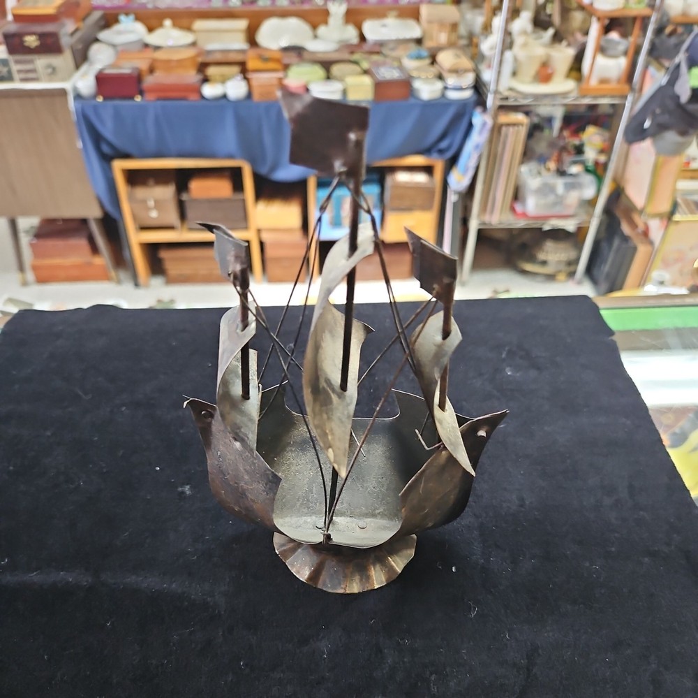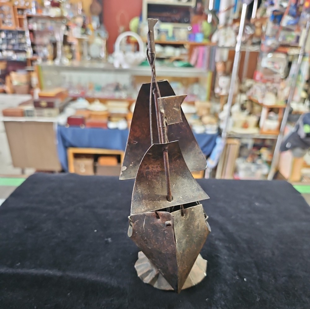 This vintage small Brutalist sailing ship metal art sculpture stands at 7.5 inches tall, making it a unique and eye-catching piece for any art lover. Handmade with a 3D production technique, this metalwork sculpture features a sailing ship as its subject, adding a nautical touch to any space. The Brutalist style gives it a rugged and modern aesthetic, perfect for those who appreciate minimalist and artistic decor.