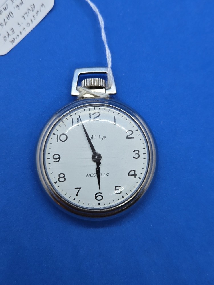 The Bull's Eye Pocket Watch by Westclox Vintage is a classic piece of jewelry for men with a silver case color and a white dial color. This mechanical (manual) pocket watch features easy-to-read large numerals and a 12-hour dial, making it a functional and stylish accessory. Made in the United States, this vintage timepiece has a snap caseback and an analog display, perfect for those who appreciate the craftsmanship and history of traditional pocket watches. Small crack in crystal between 10-11. Back of watch doesn't snap completely. Works great. Please look at the pictures closely, as this is the item that you will receive.