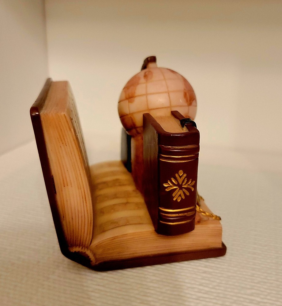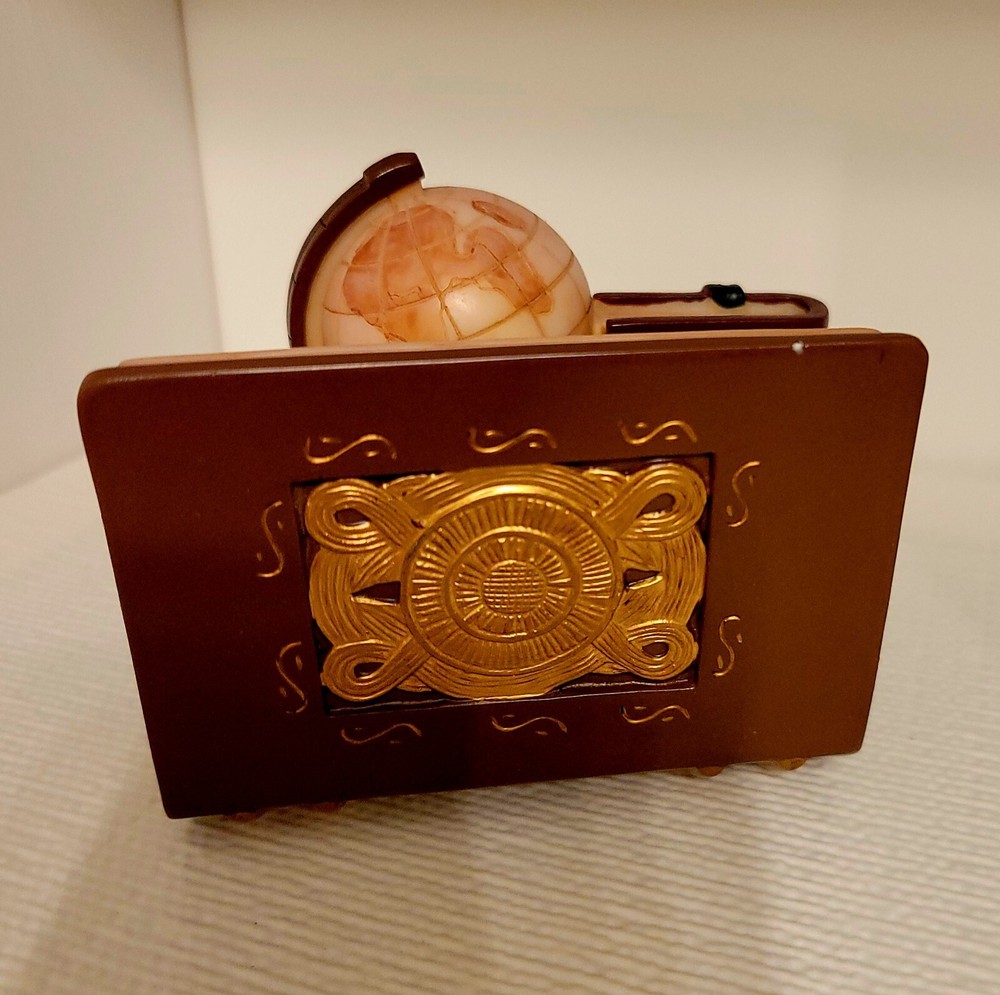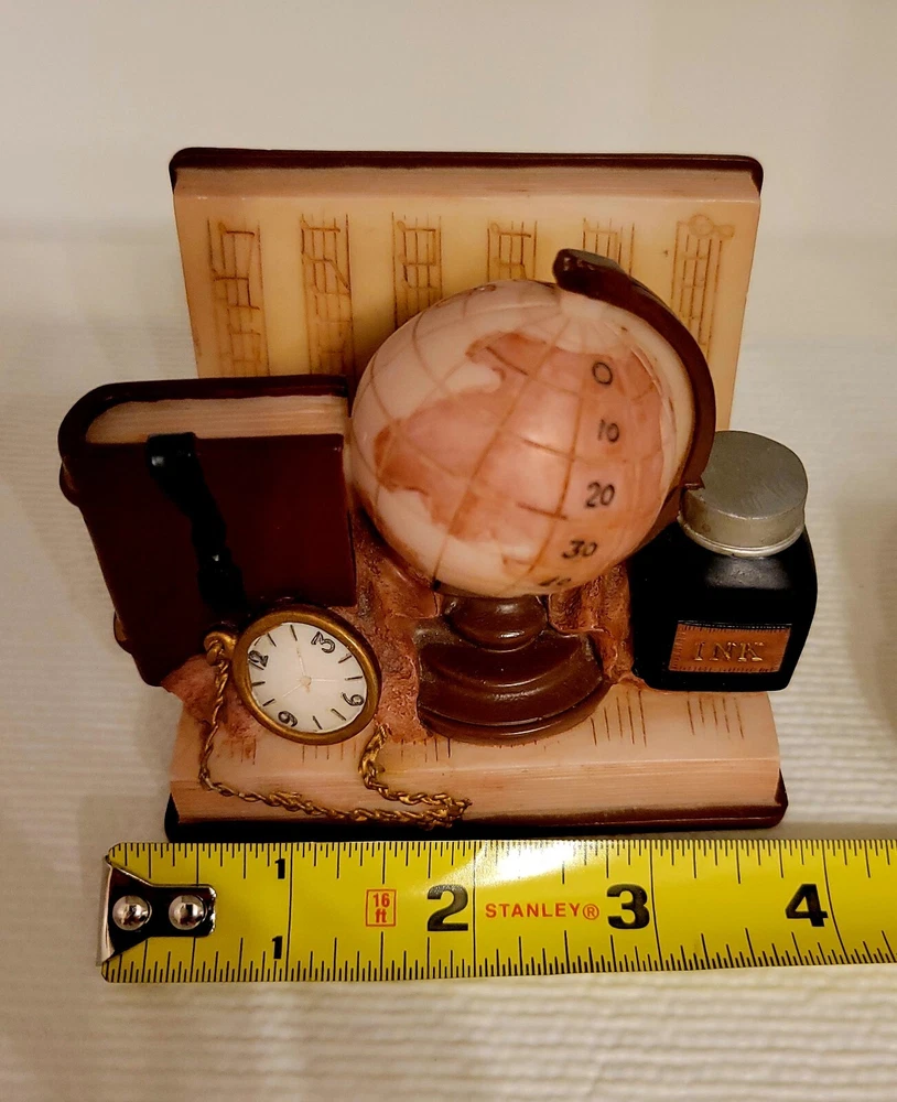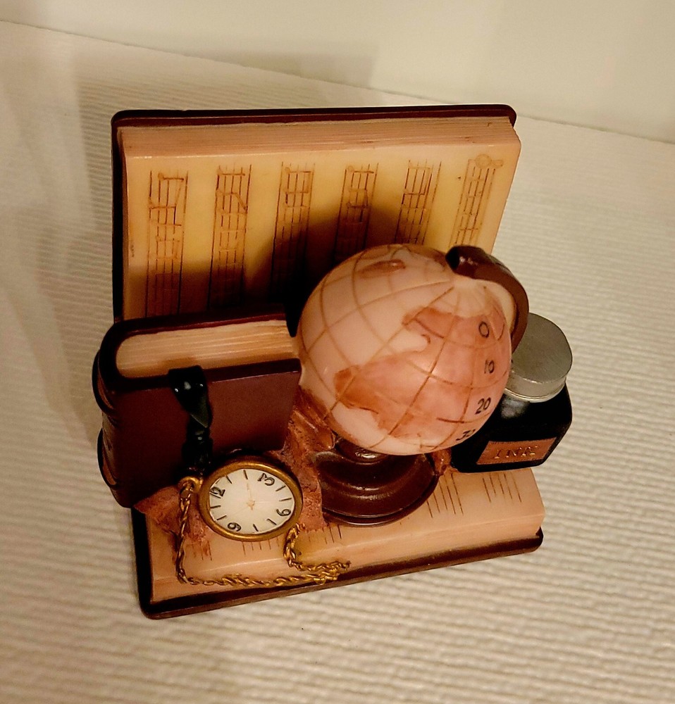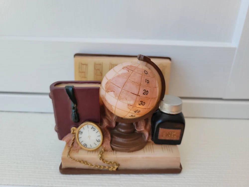 Vintage Business Card Holder – Old World Academic Book Globe Ink Bottle Small mark on the back top that can be seen in photo. Can be hidden with concealing marker or tiny amount of putty. Original photos were taken in the evening and are under lamp/overhead light. The last 2 photos are in bright light with very direct sun. Every screen will display colours a bit differently, so I have tried to photograph it with different kinds of light.