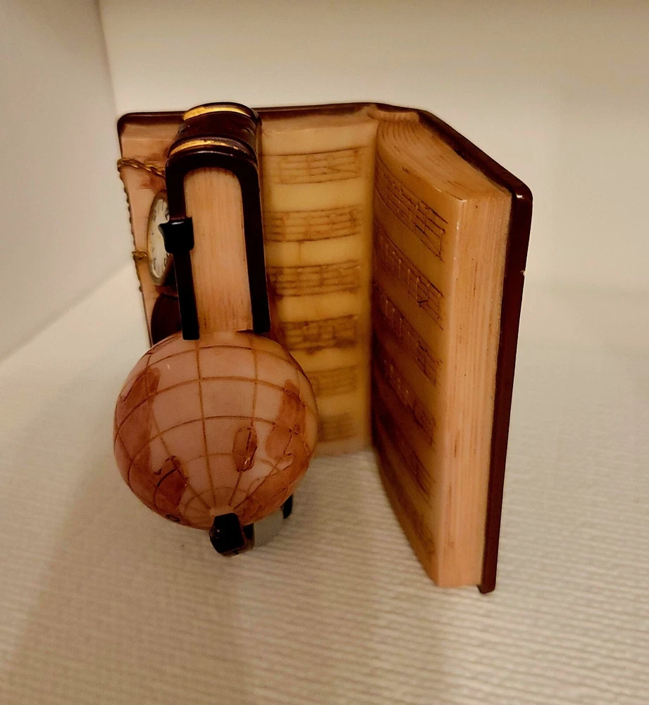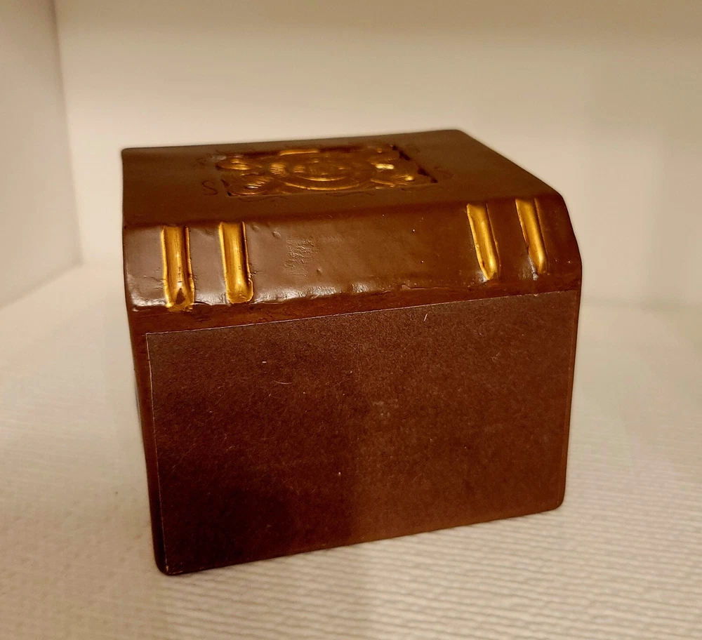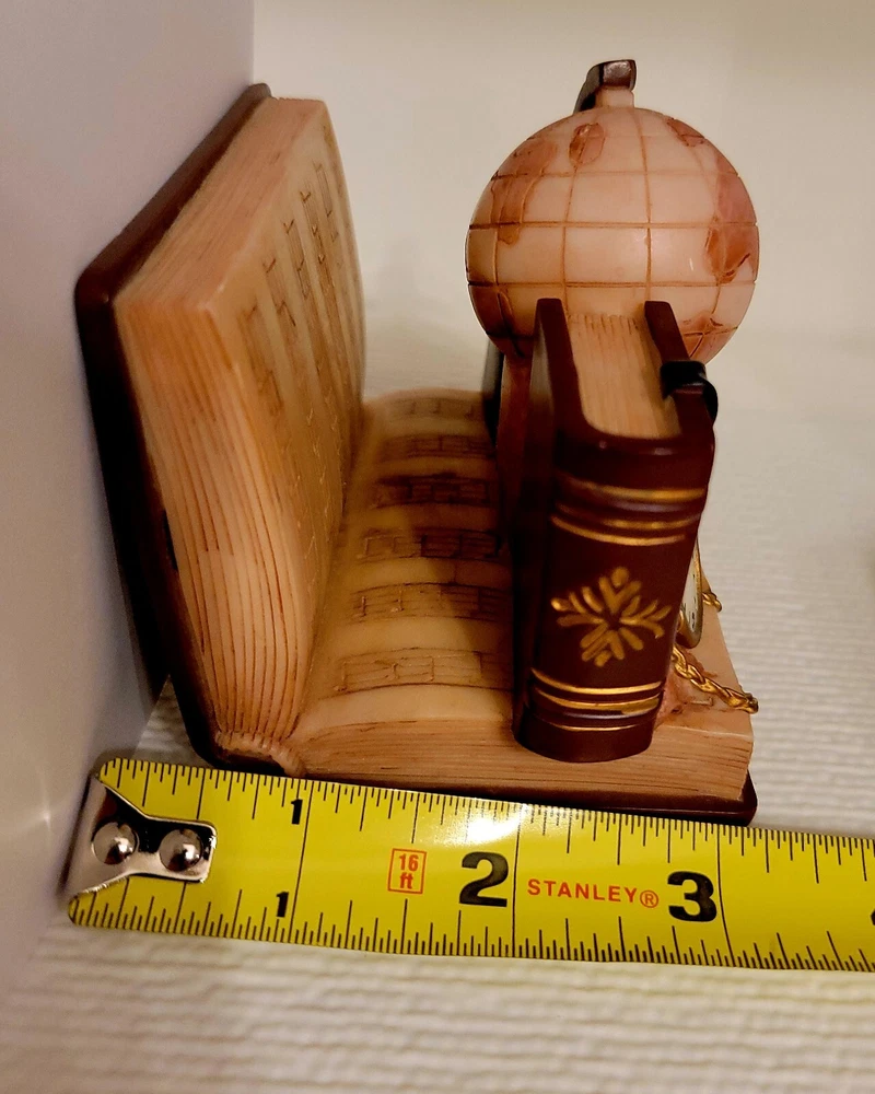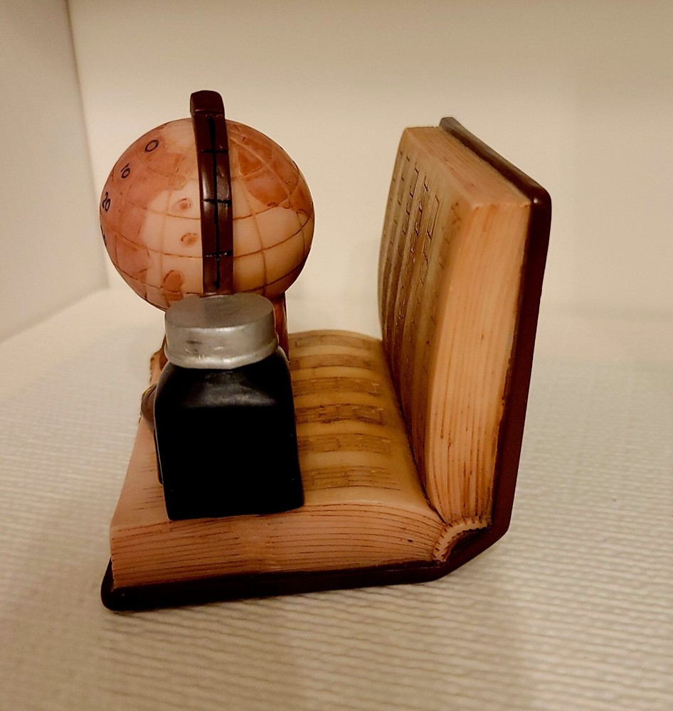 Vintage Business Card Holder – Old World Academic Book Globe Ink Bottle Small mark on the back top that can be seen in photo. Can be hidden with concealing marker or tiny amount of putty. Original photos were taken in the evening and are under lamp/overhead light. The last 2 photos are in bright light with very direct sun. Every screen will display colours a bit differently, so I have tried to photograph it with different kinds of light.