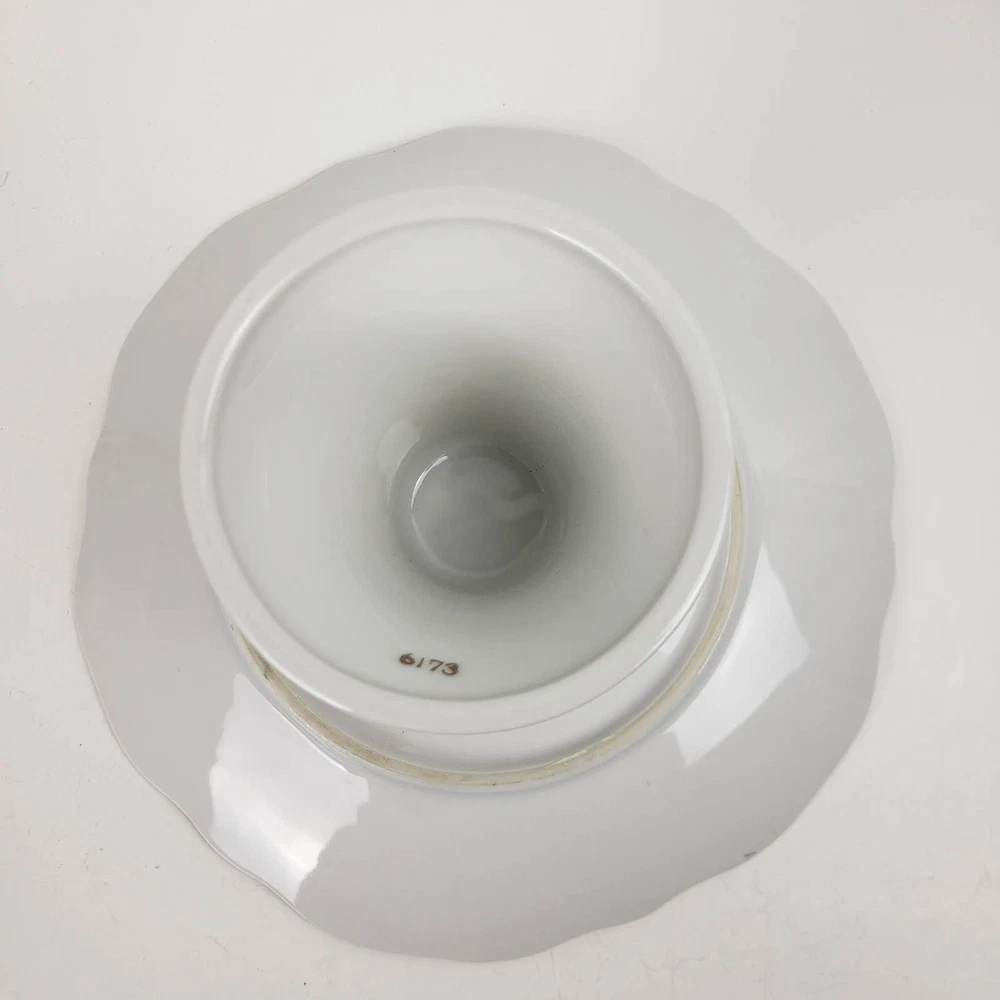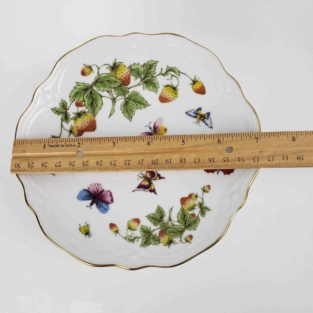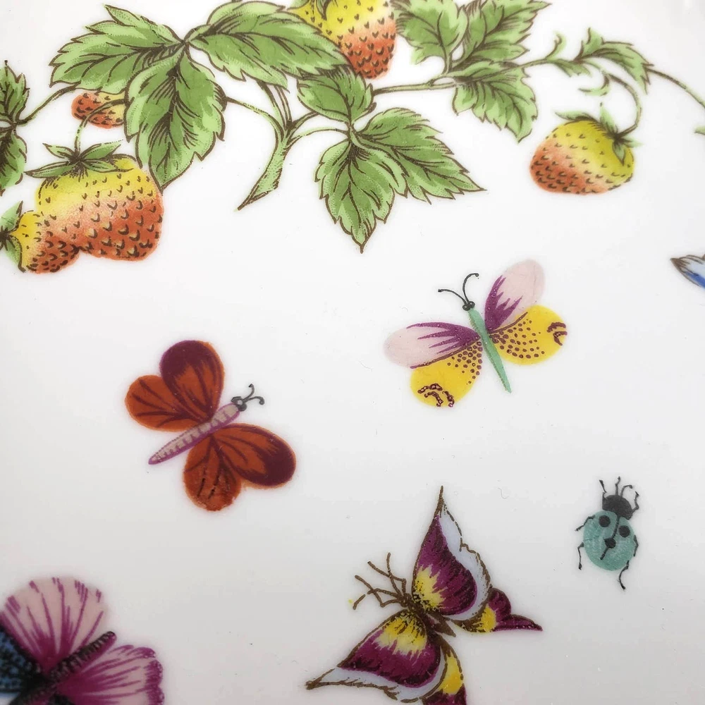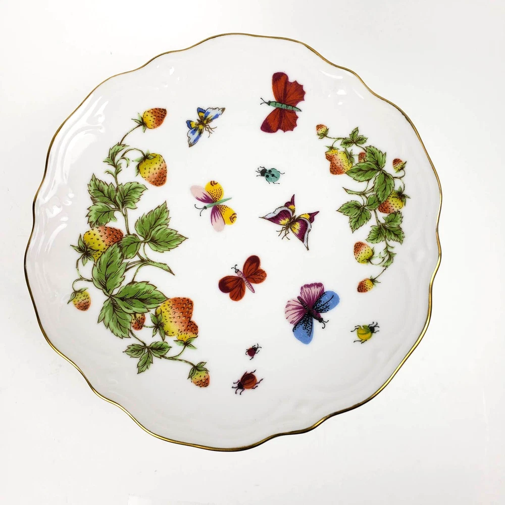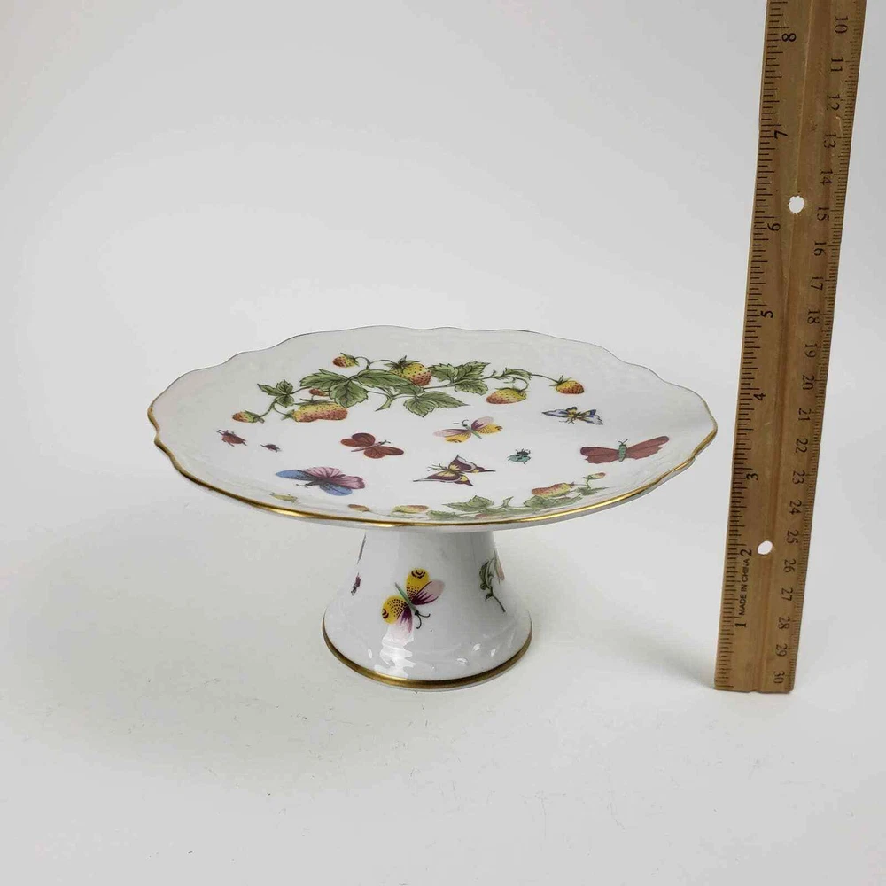 Beautifully made ceramic cake stand with butterflies, fruit and lady bugs. Perfect for spring and summer decor! The pattern is transferware with gold gilding. No brand, only model number on bottom. Its a medium size measures 7x4 inches. Good condition. From the late 1900s (80s-90s).