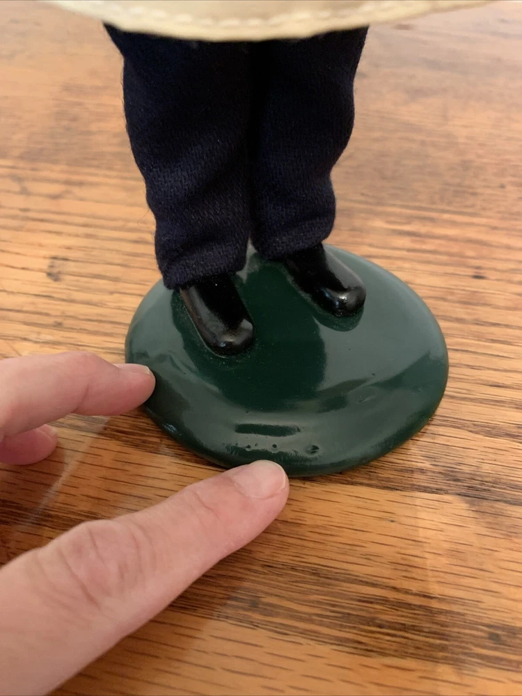Vintage Byers’ Choice baker is in good used condition. He carries a basket of bread on his head and side. Please note there is some wear on the base. There are also a few imperfections on the top of the base. See photos.