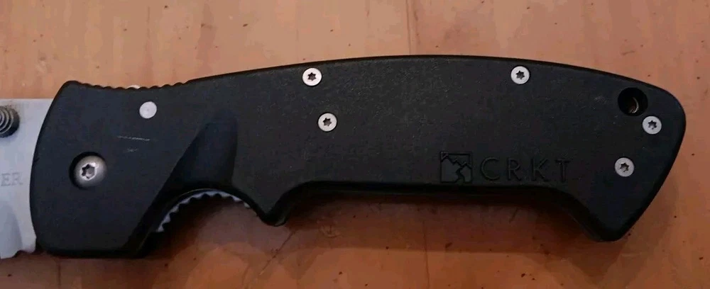 VTG TAIWAN COLUMBIA RIVER CRKT CRAWFORD KASPER LARGE FOLDING POCKET KNIFE. This is the large version 6783 that was made in Taiwan. This feature packed tactical knife, designed by writer and knife use instructor Bob Kasper and knife maker Pat Crawford, is a serious self-defense folder built to satisfy under the most serious situations. Thick stainless liners covered with black Zytel® scales give this knife a very hefty feel. A thumb scallop on each side leads to the thumb stud for easier opening and more secure grip. An integral part of this tactical folder is the patented Lake & Walker Safety (LAWKS). Located at the top front of the knife, the LAWKS mechanism insures that the blade will remain locked under heavy cross stress. The lock is a Walker-Lock secured by the LAWKS safety.